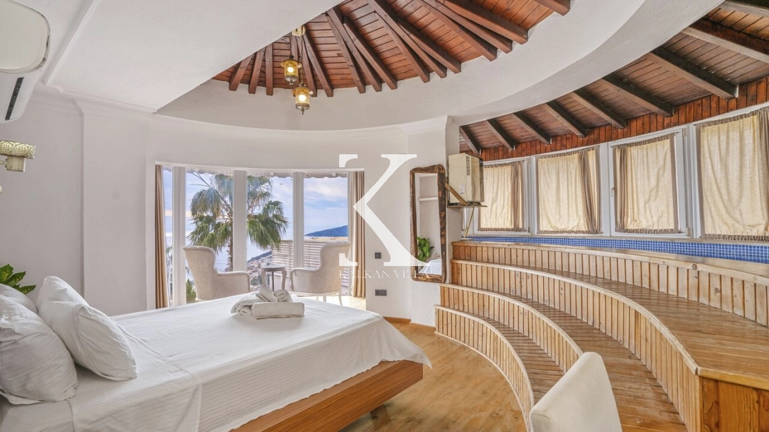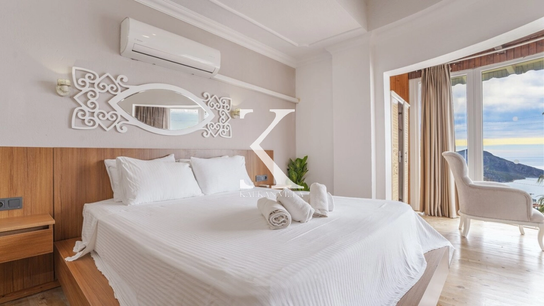 5 süit oda – 10 kişi, tripleks mimari, korunaklı bahçe ve ısıtmalı kapalı havuz. Kalkan Koyu’na hâkim panoramik manzara.