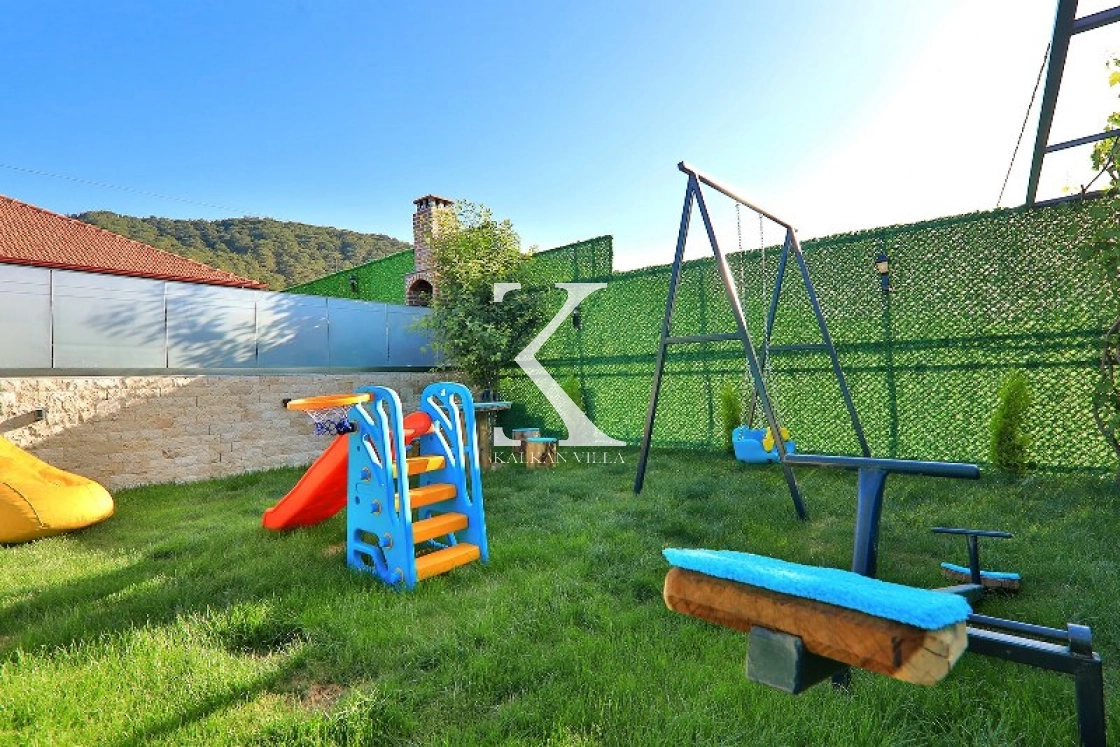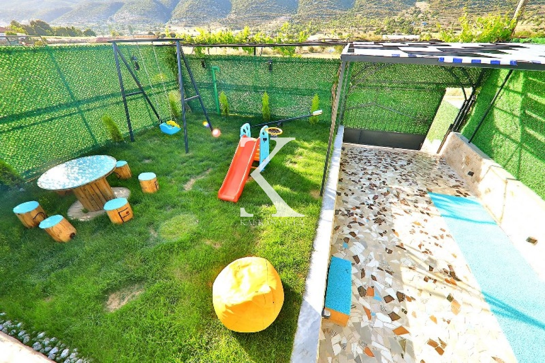 Tamamen dışarıdan görünmeyen korunaklı havuz terası, geniş bahçe alanı ve çocuk oyun alanı sayesinde aile dostu bir konaklama deneyimi sunar.