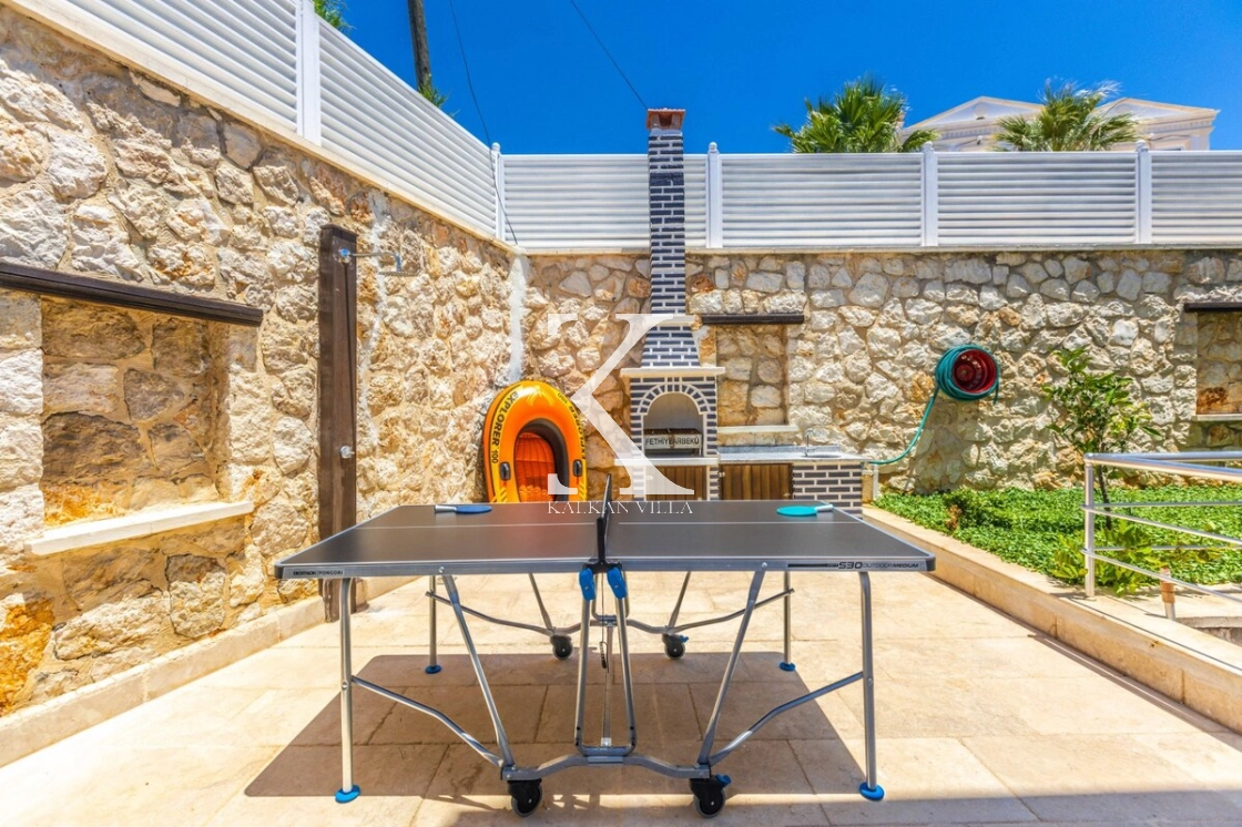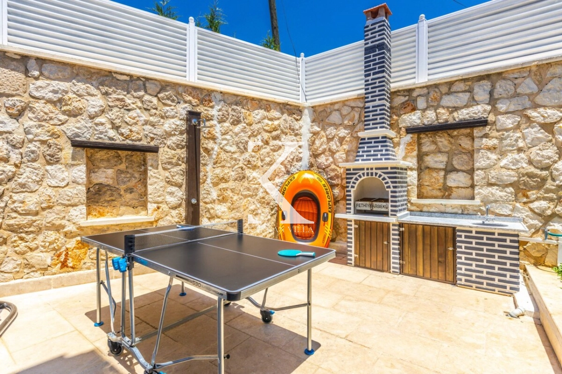 Villanın denize karşı konumlanmış özel bahçesinde; özel yüzme havuzu, şezlonglar, salıncak, masa tenisi, barbekü alanı ve açık hava yemek masası bulunmaktadır.