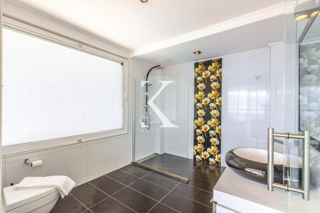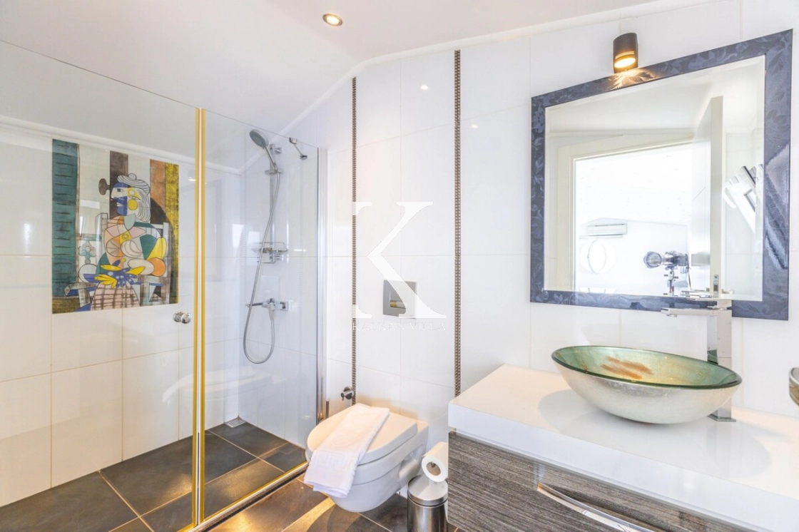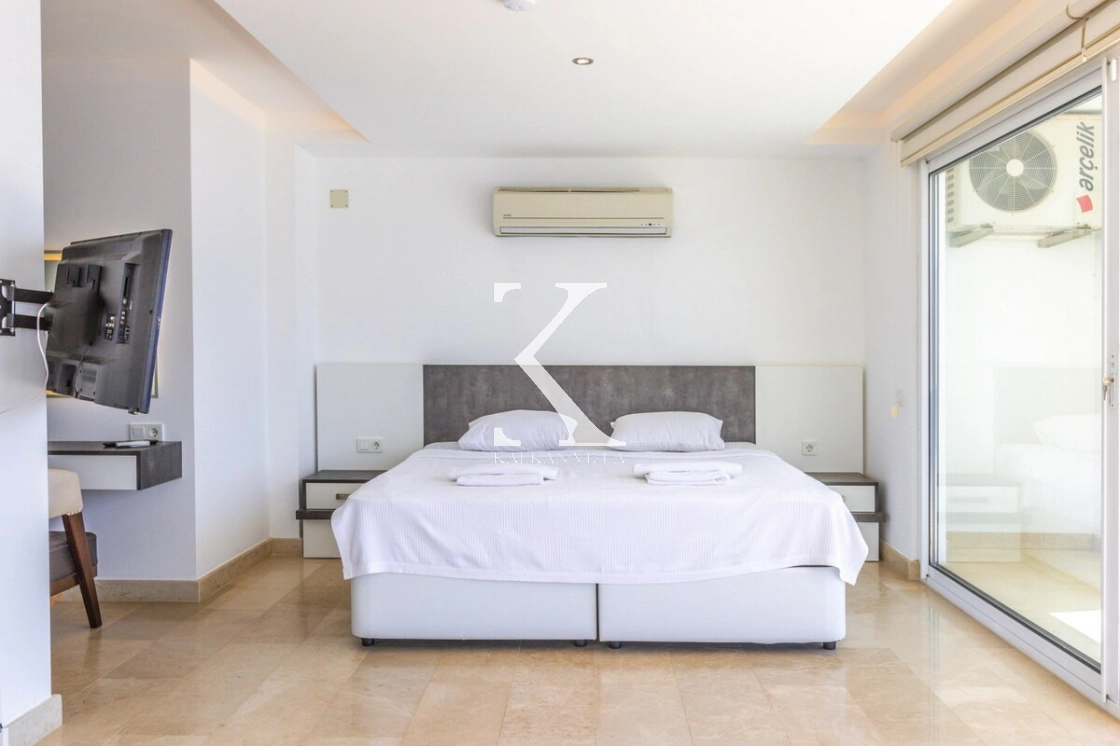 Her yatak odası ebeveyn banyoludur ve geniş pencerelerden Akdeniz’in mavi tonları villanın her alanına yansır.