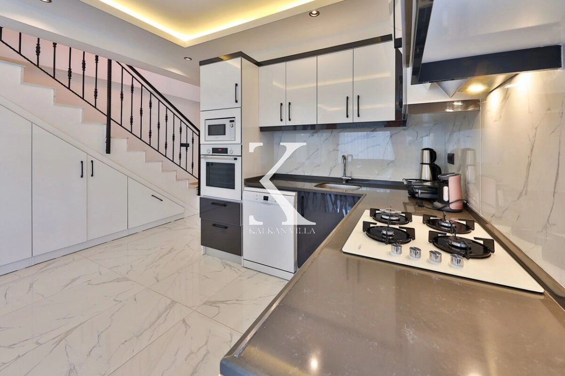 Villa Kaşlı’da yer alan Amerikan mutfak, modern ve eksiksiz şekilde donatılmıştır.