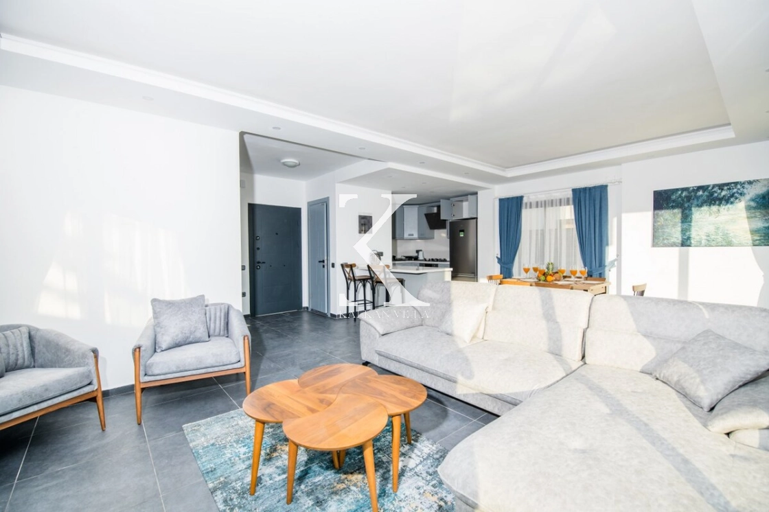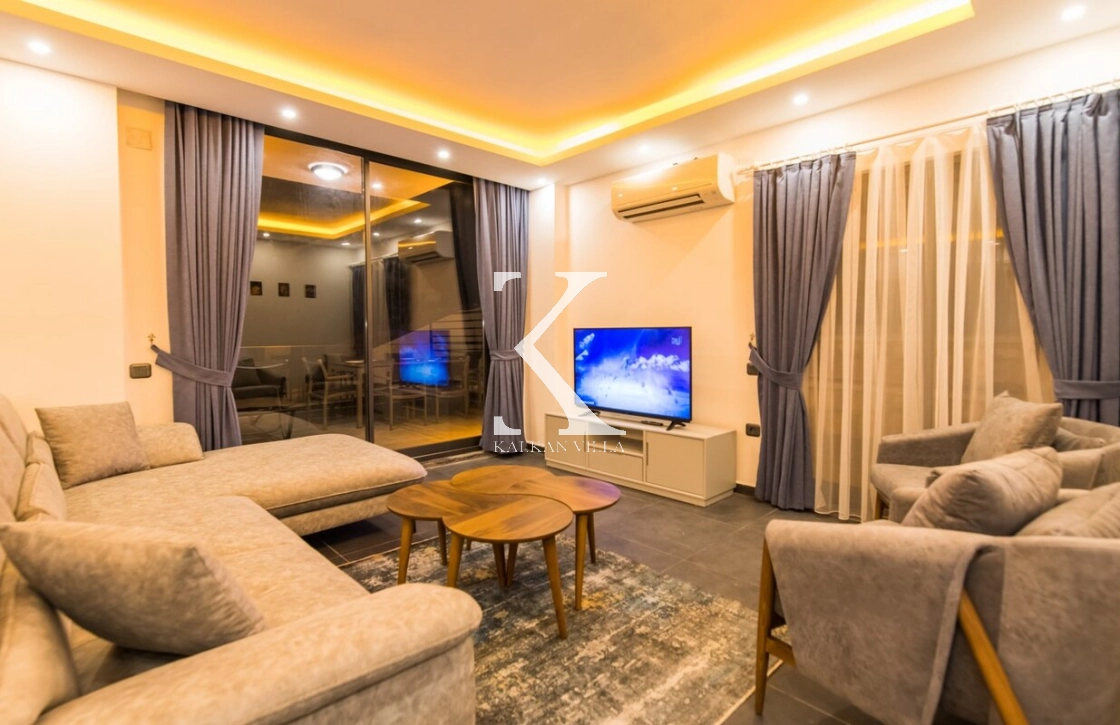 Geniş ve ferah salon; konforlu oturma grubu, TV, klima, sehpa, DVD oynatıcı ile donatılmıştır.