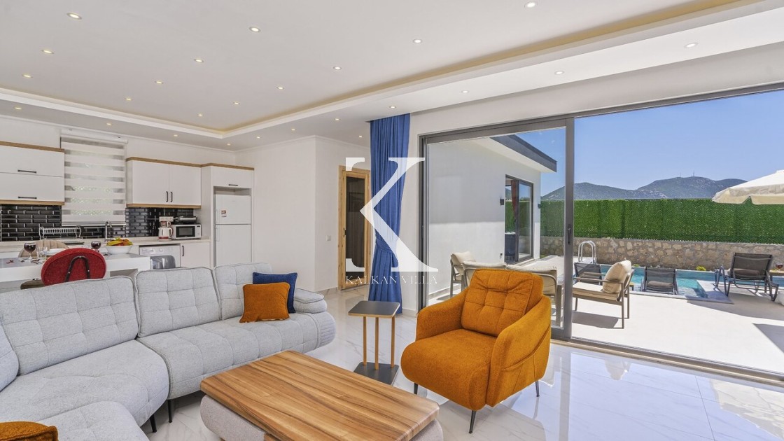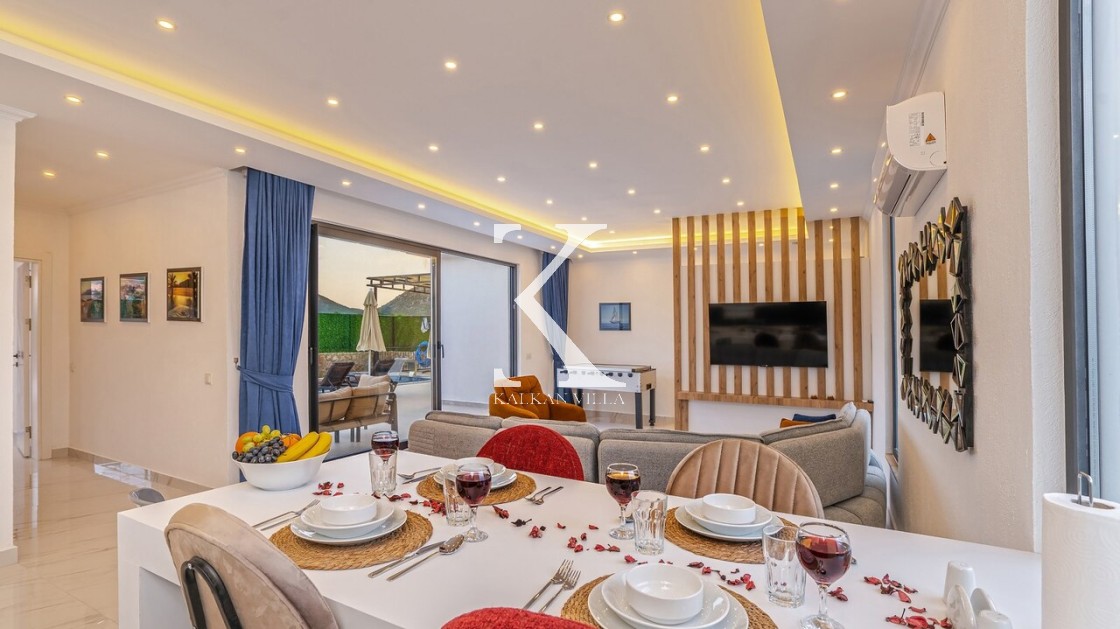 Özenle dekore edilmiş iç mekânda, doğayla bütünleşen bir yaşam alanı sizi karşılar. Geniş cam kapılar sayesinde salondan direkt havuz terasına geçebilirsiniz.