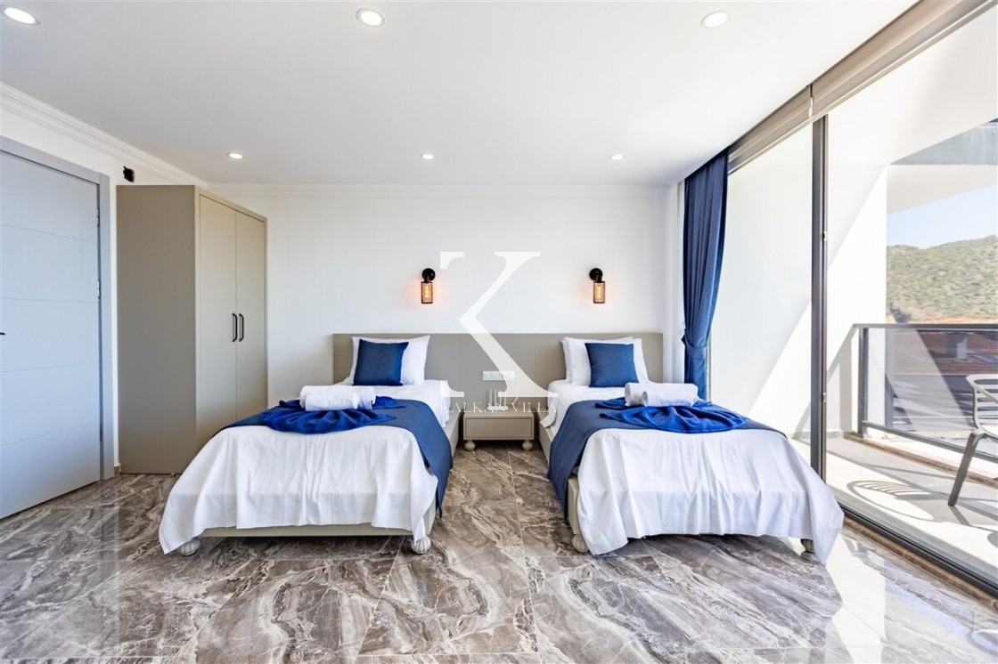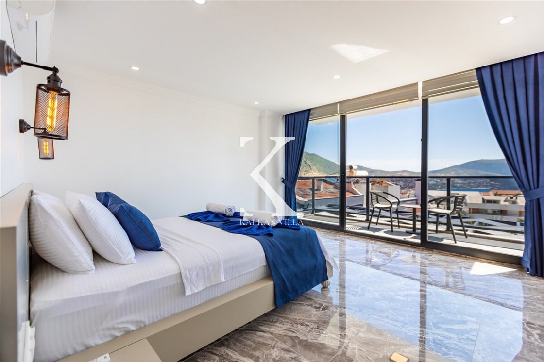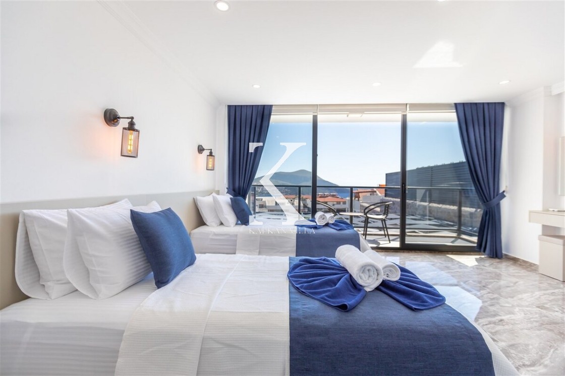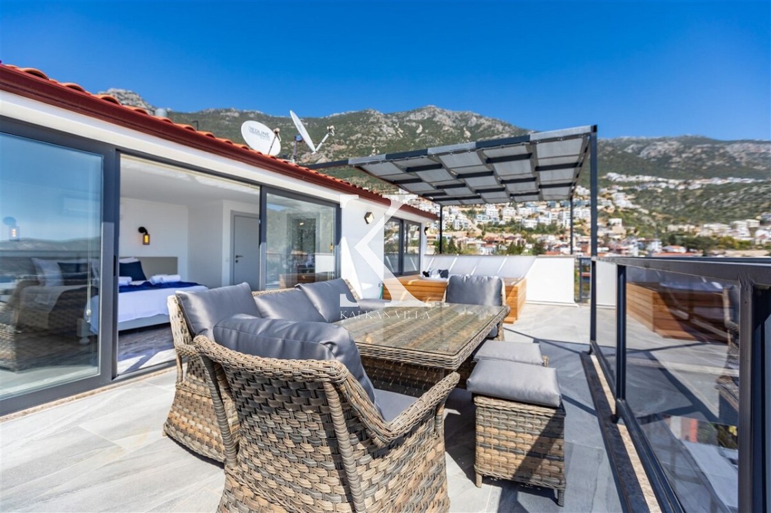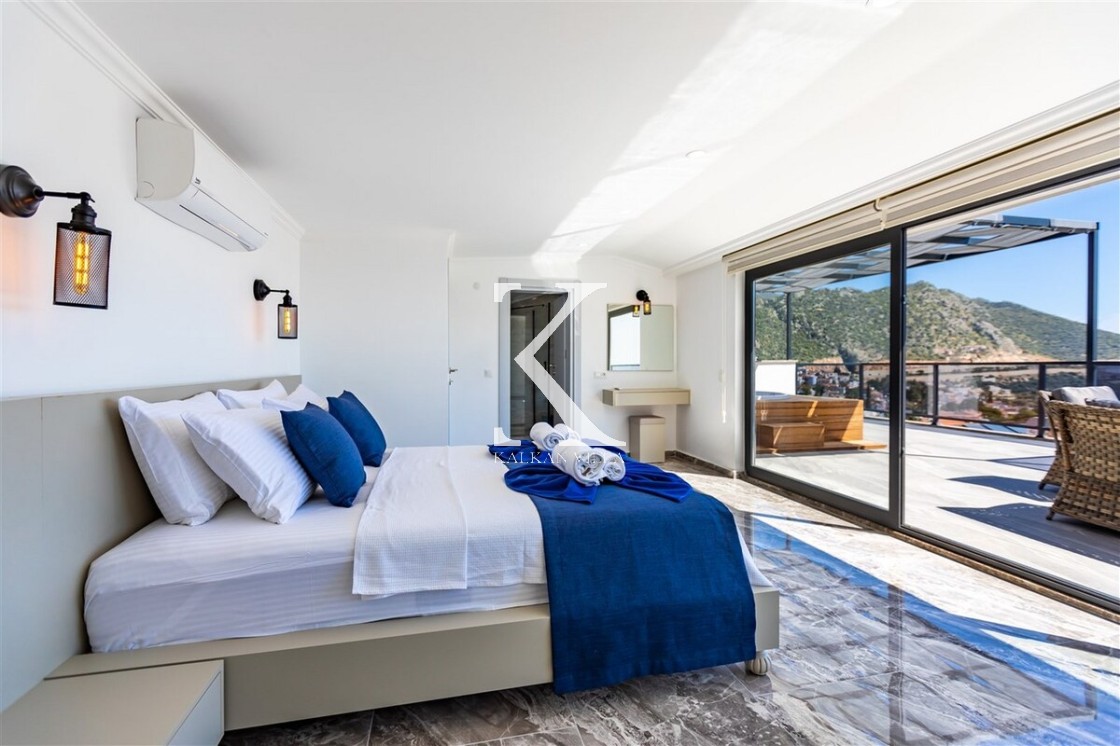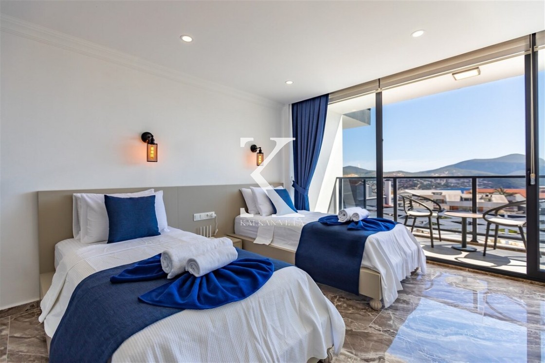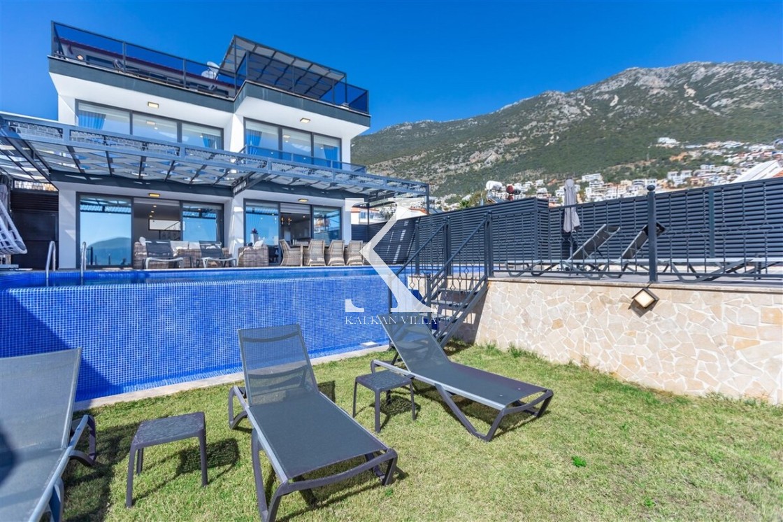 Villa Royal Hills 1, Kalkan merkezde, deniz ve şehir manzarasını bir arada sunan modern tasarımlı 5 yatak odalı, 10 kişilik özel bir villadır.