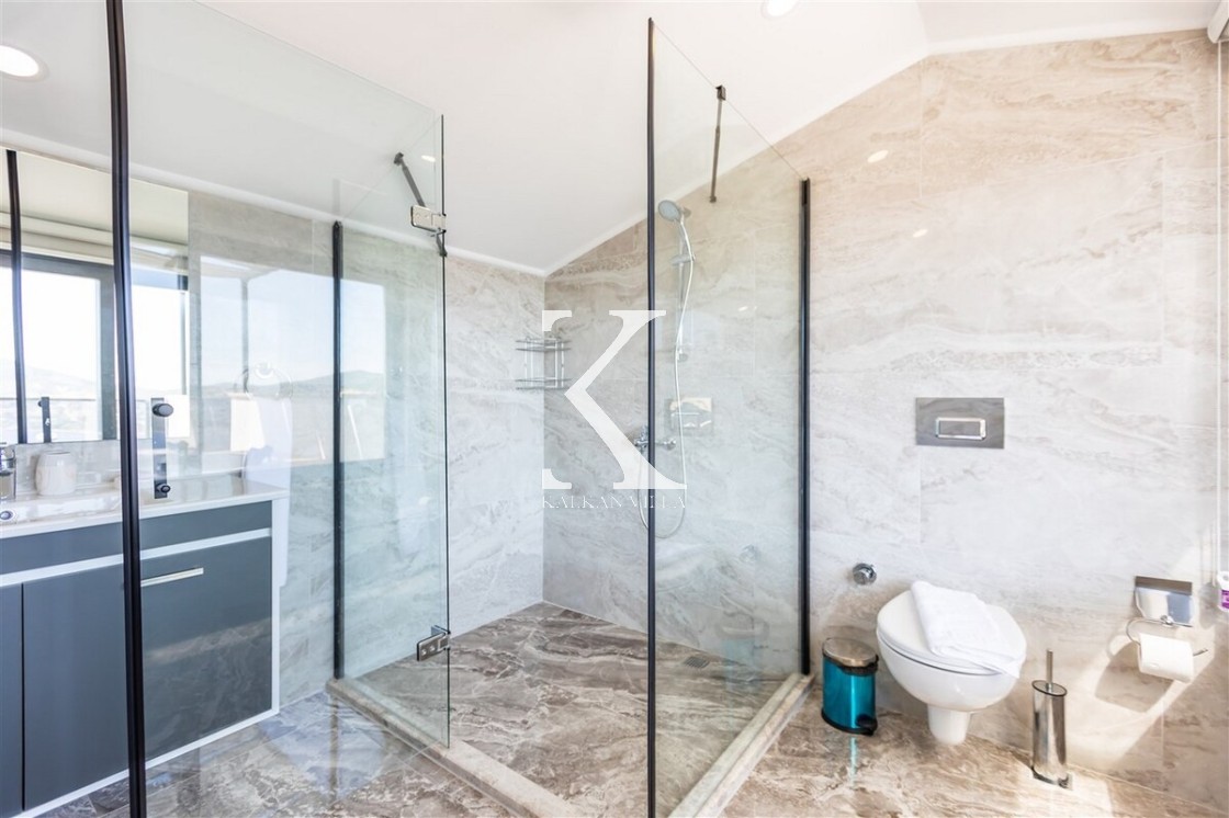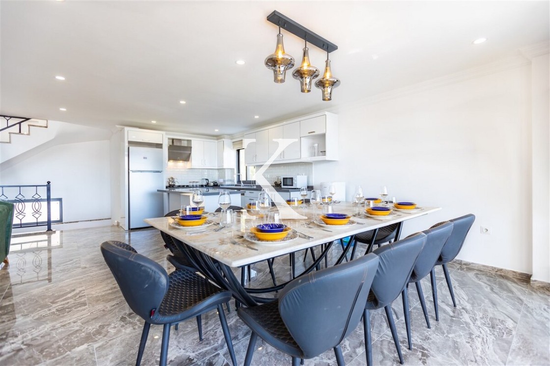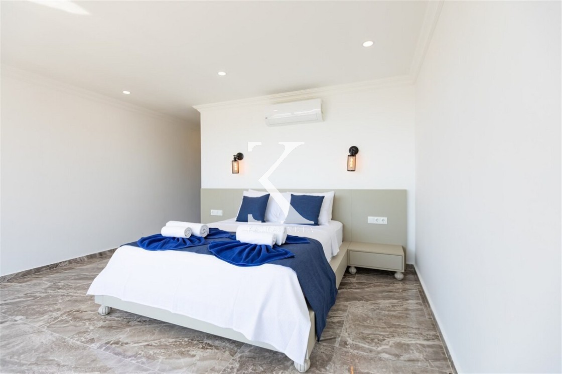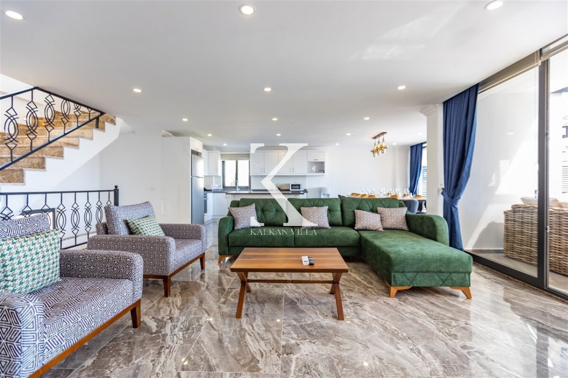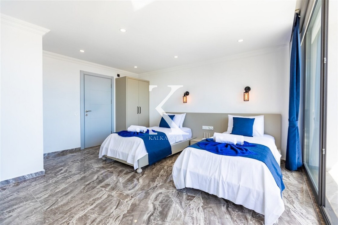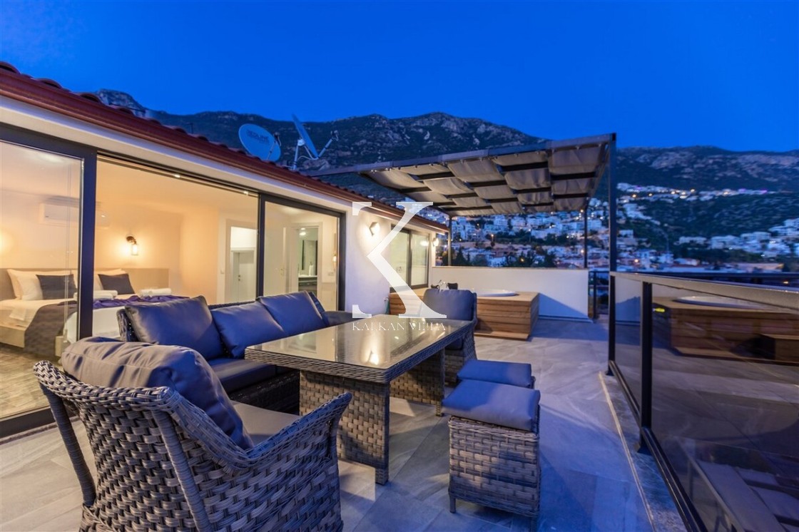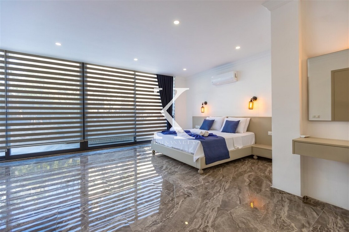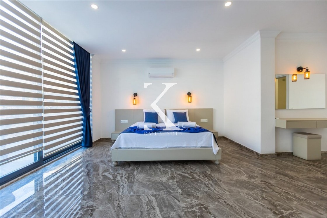 Villa Royal Hills 1, Kalkan merkezde, deniz ve şehir manzarasını bir arada sunan modern tasarımlı 5 yatak odalı, 10 kişilik özel bir villadır.