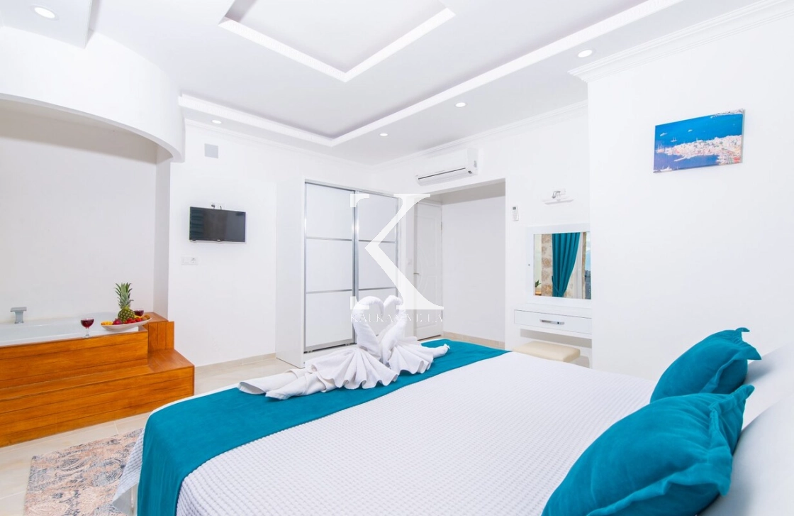 Ana yatak odasında yer alan jakuzi, yılın yorgunluğunu atmak ve konforlu bir tatil geçirmek isteyen misafirler için tasarlanmıştır.
