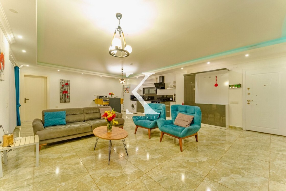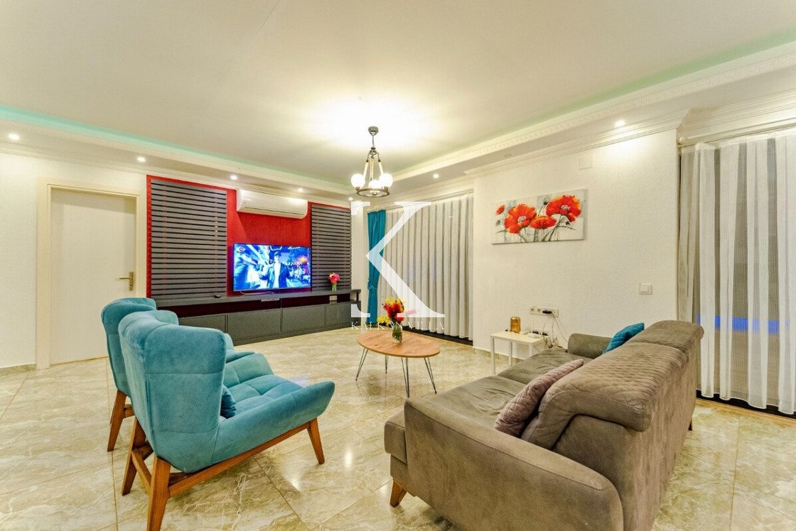 Geniş salonu, doğal ışığı içeri alan büyük cam kapılarıyla ferah bir atmosfer sunar.