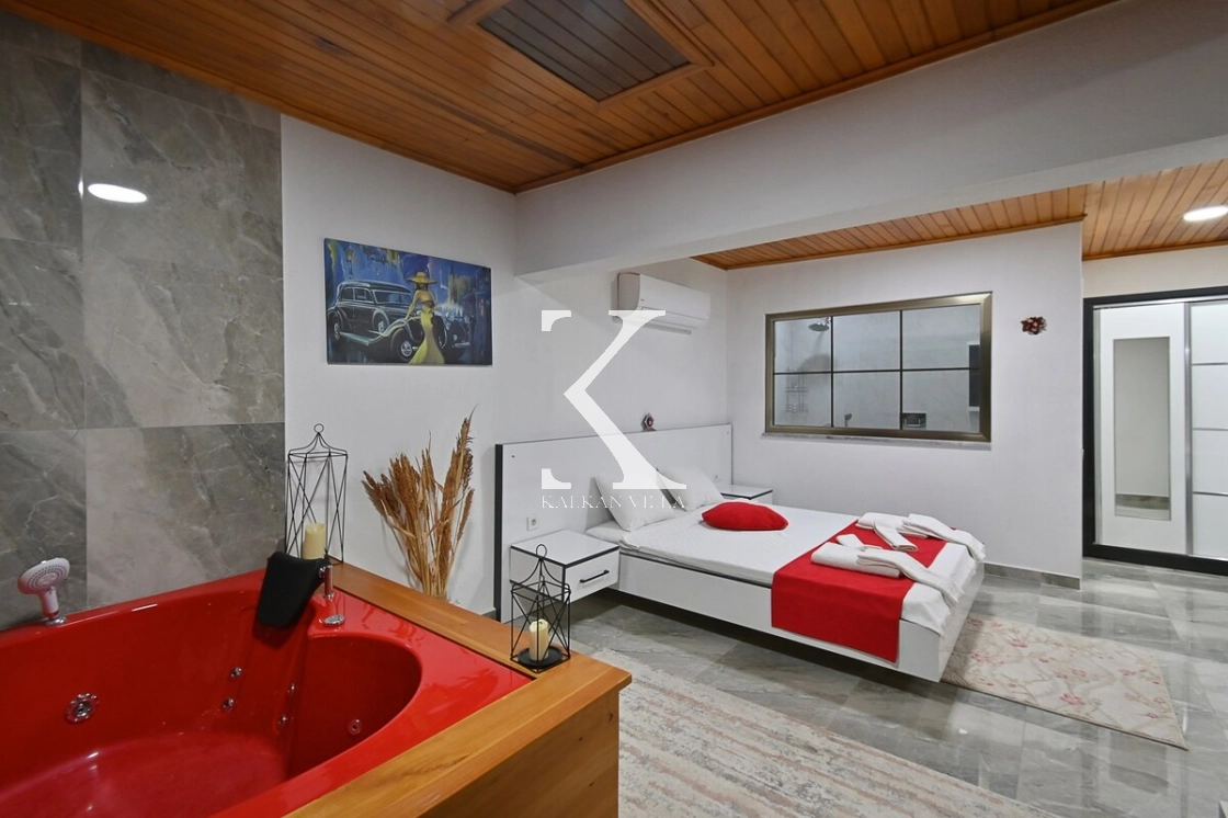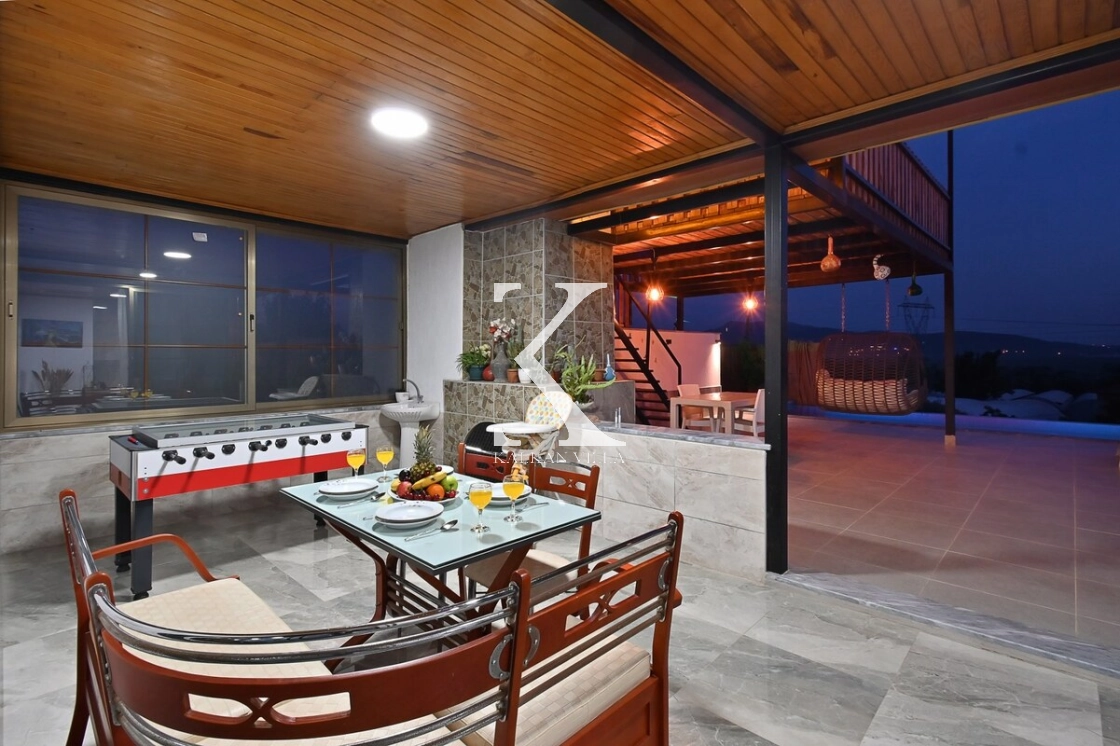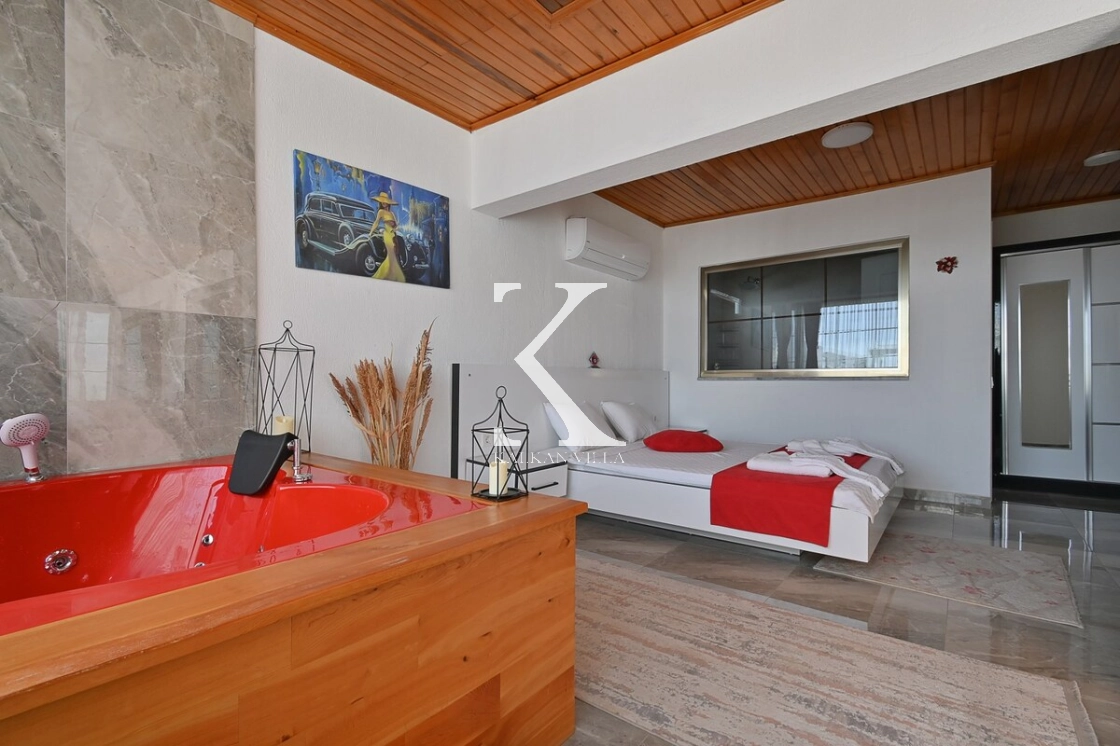 bulunmaktadır. Salondan havuz terasına doğrudan çıkış vardır. Ayrıca salonda ekstra bir banyo da mevcuttur.