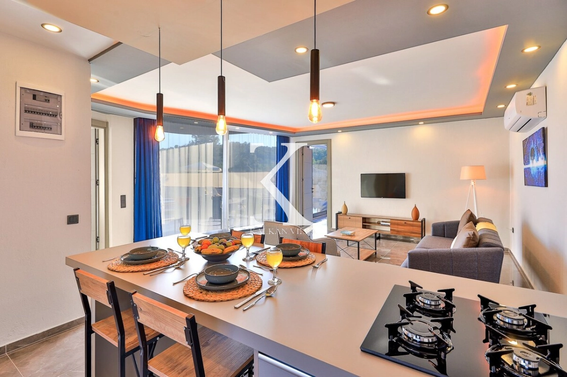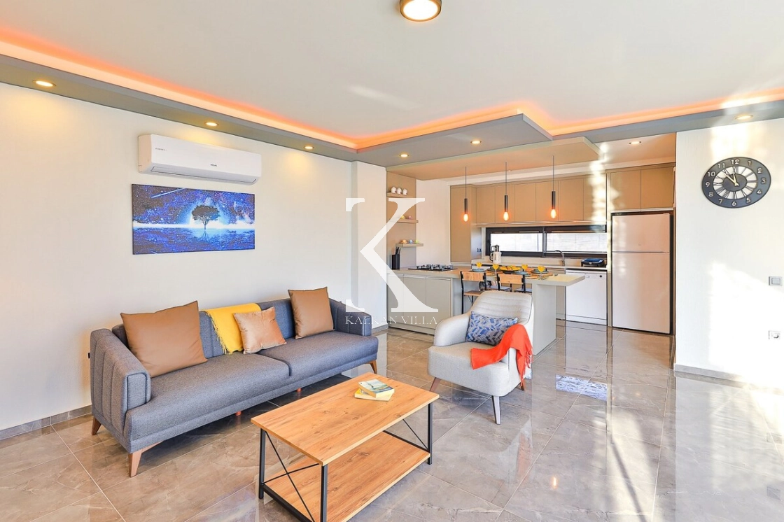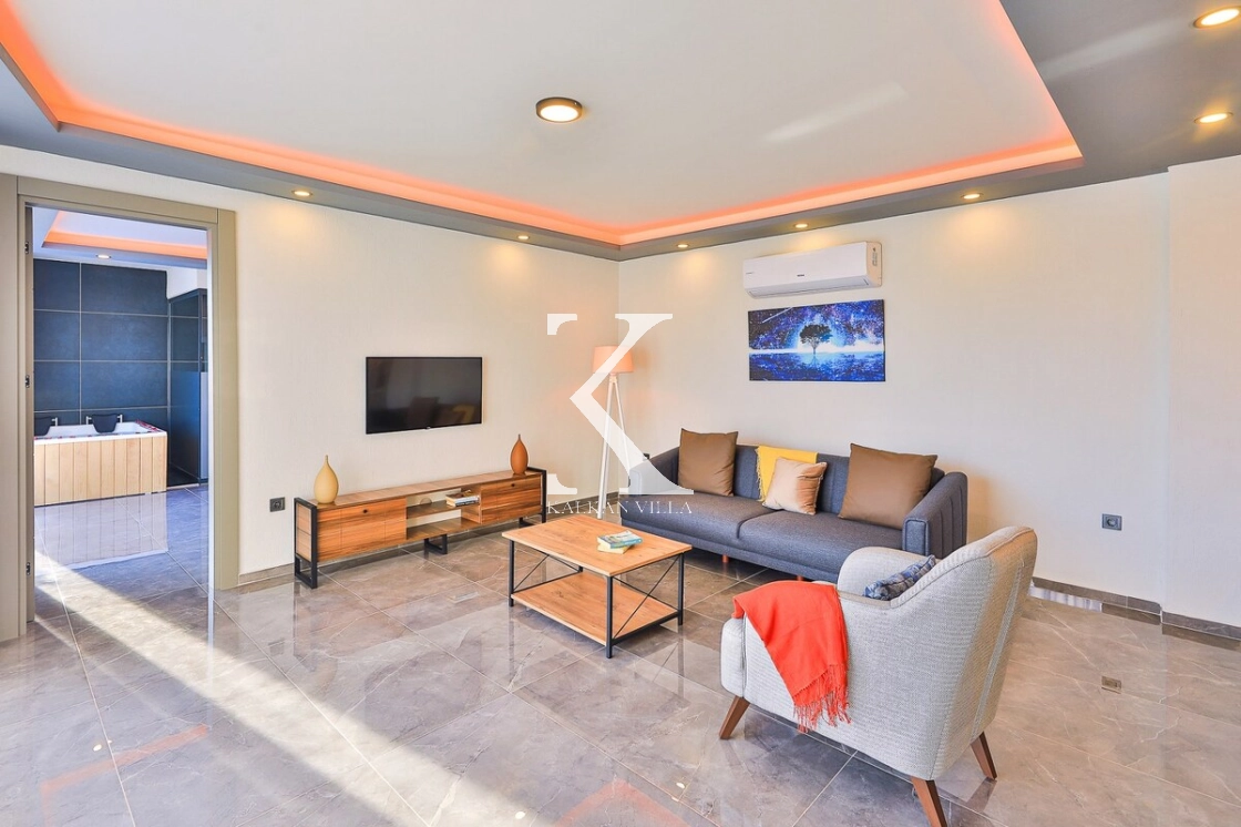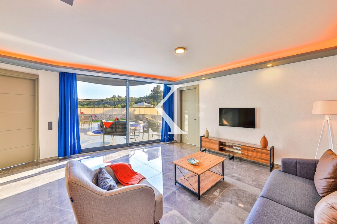 Modern dizayna sahip salonda konforlu oturma grubu, TV ve klima bulunmaktadır. Salondan havuz terasına direkt çıkış vardır.