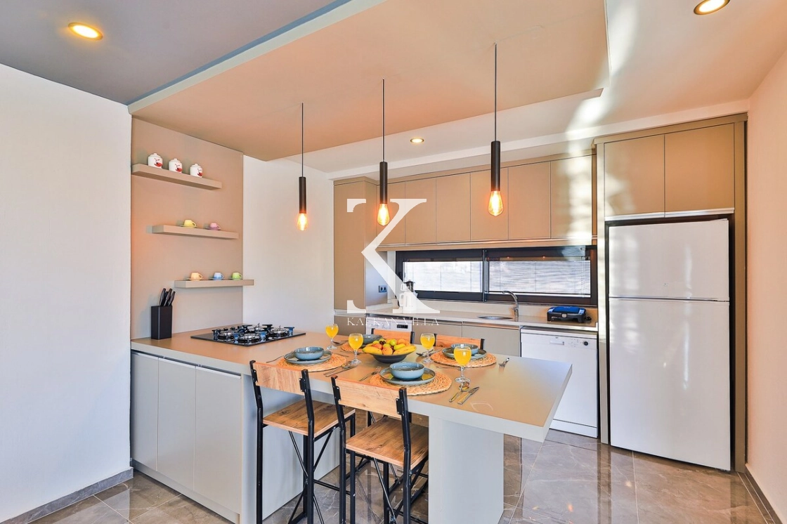 Aydınlık ve ferah modern Amerikan mutfak içerisinde; buzdolabı, bulaşık makinesi, ocak, fırın, mikrodalga fırın, yemek masası, yemek takımı ve yemek pişirme araç gereçleri yer almaktadır.