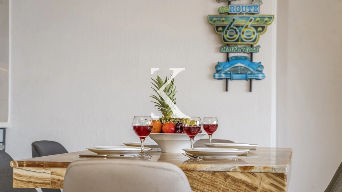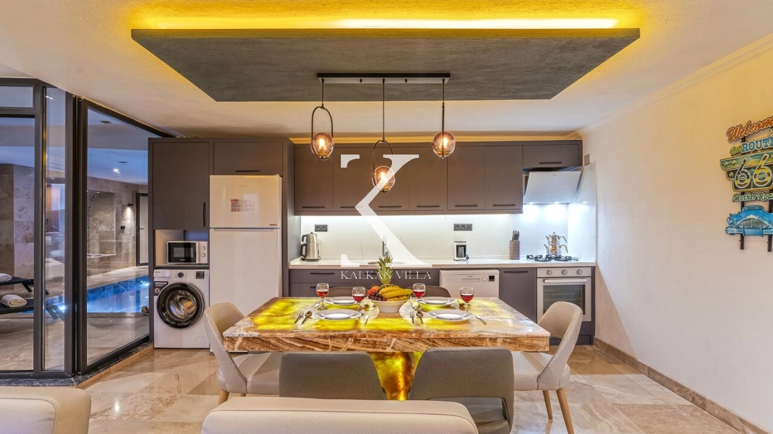 konforlu oturma grubu, TV, DVD oynatıcı, klima ve internet bulunmaktadır. Salondan doğrudan havuz terasına çıkış mevcuttur.