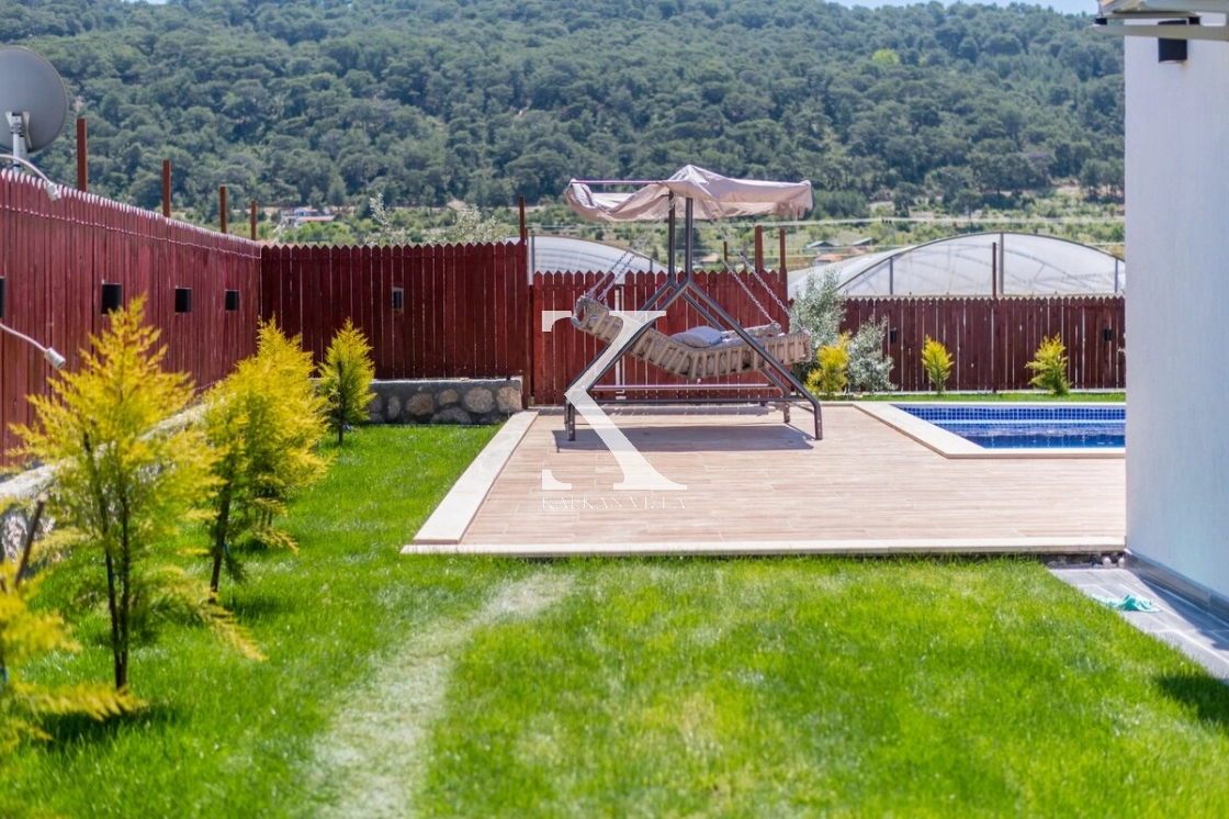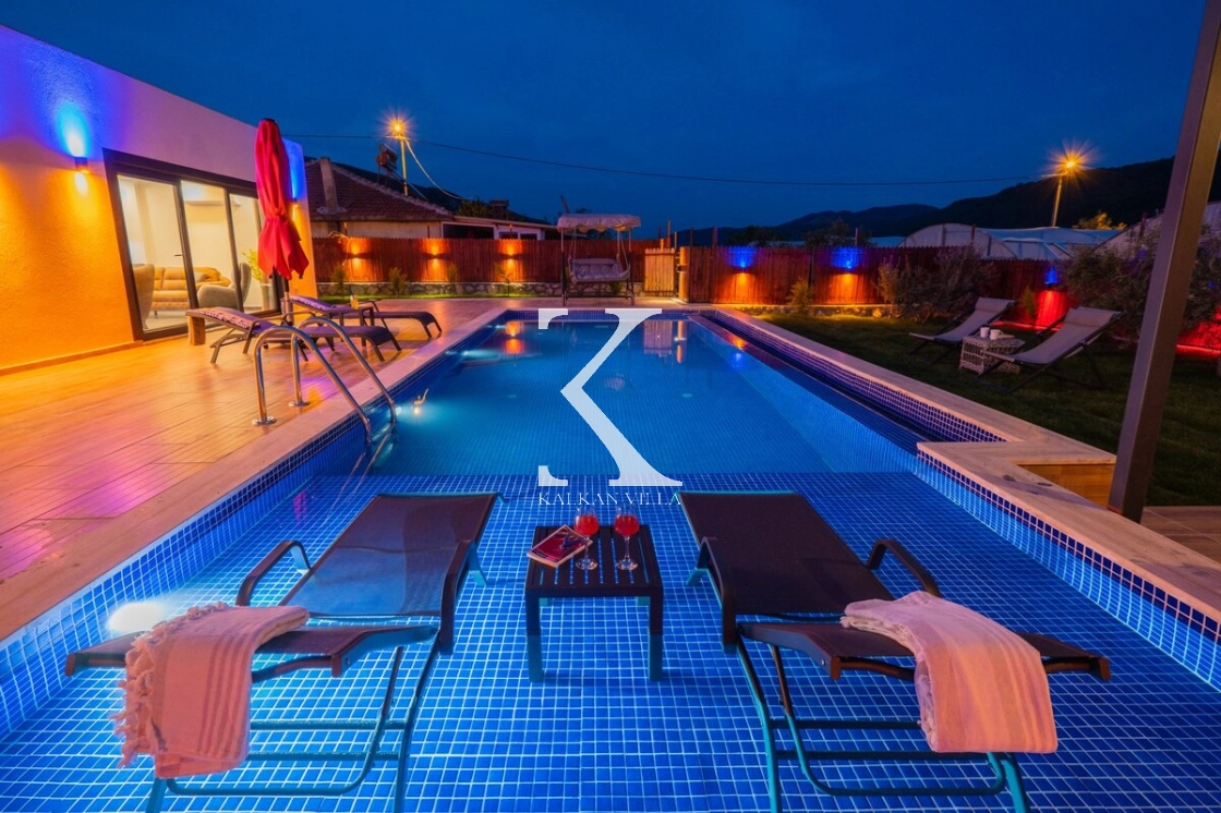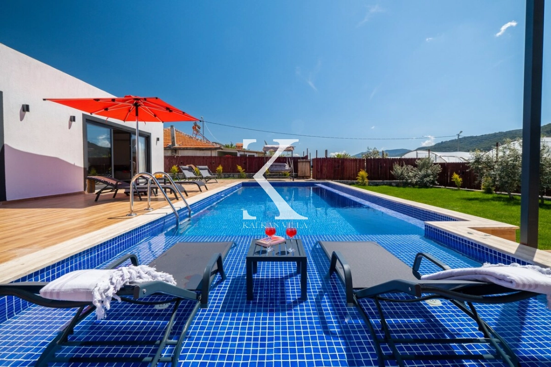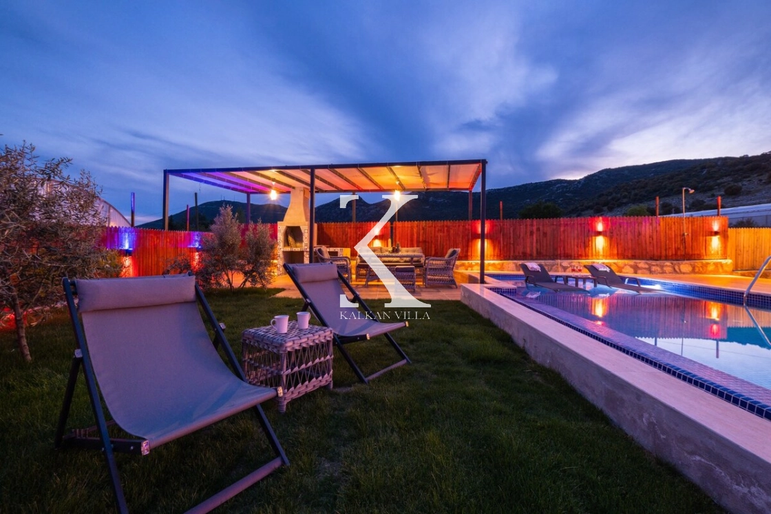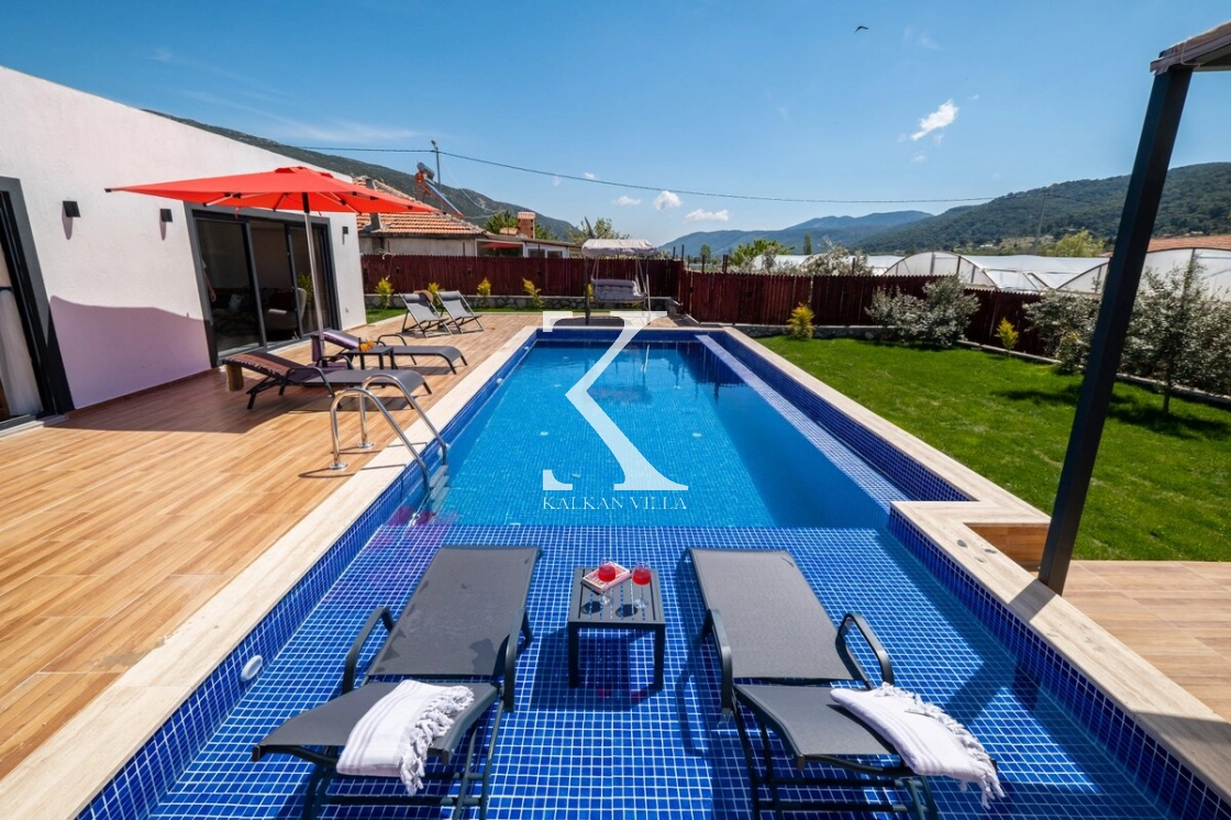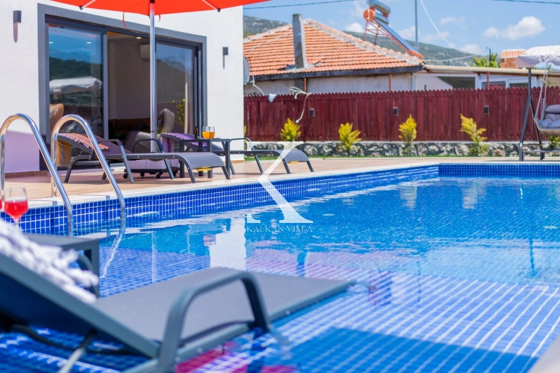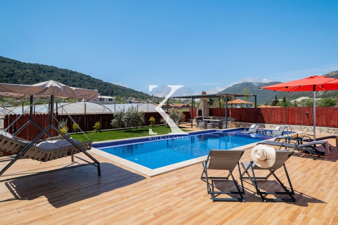 Villanın geniş bahçesinde bulunan özel yüzme havuzu, şezlonglar, güneş şemsiyeleri, oturma köşesi ve yemek masası sayesinde misafirler gün boyunca doğanın tadını çıkarabilirler.