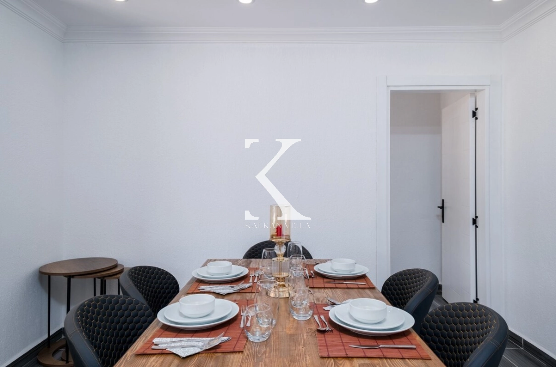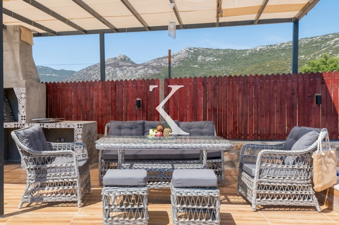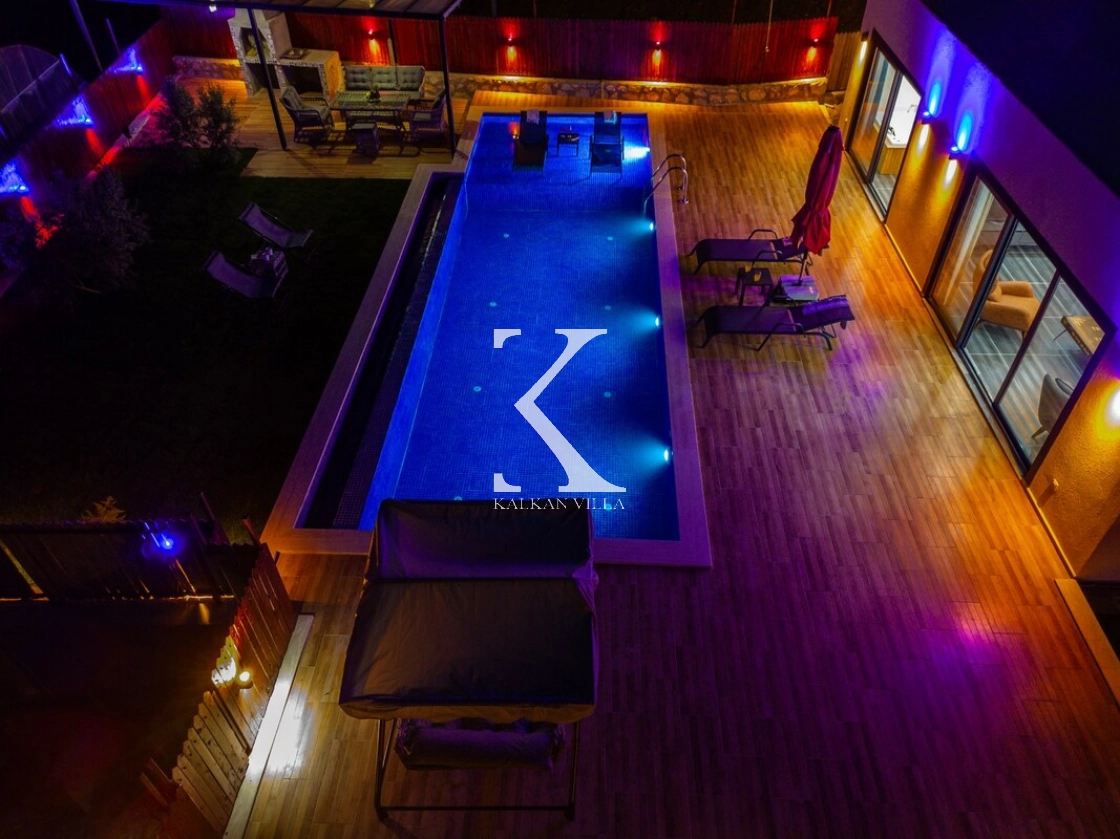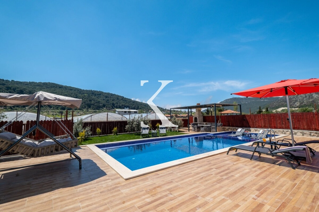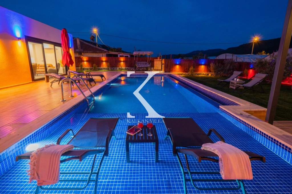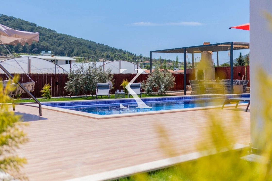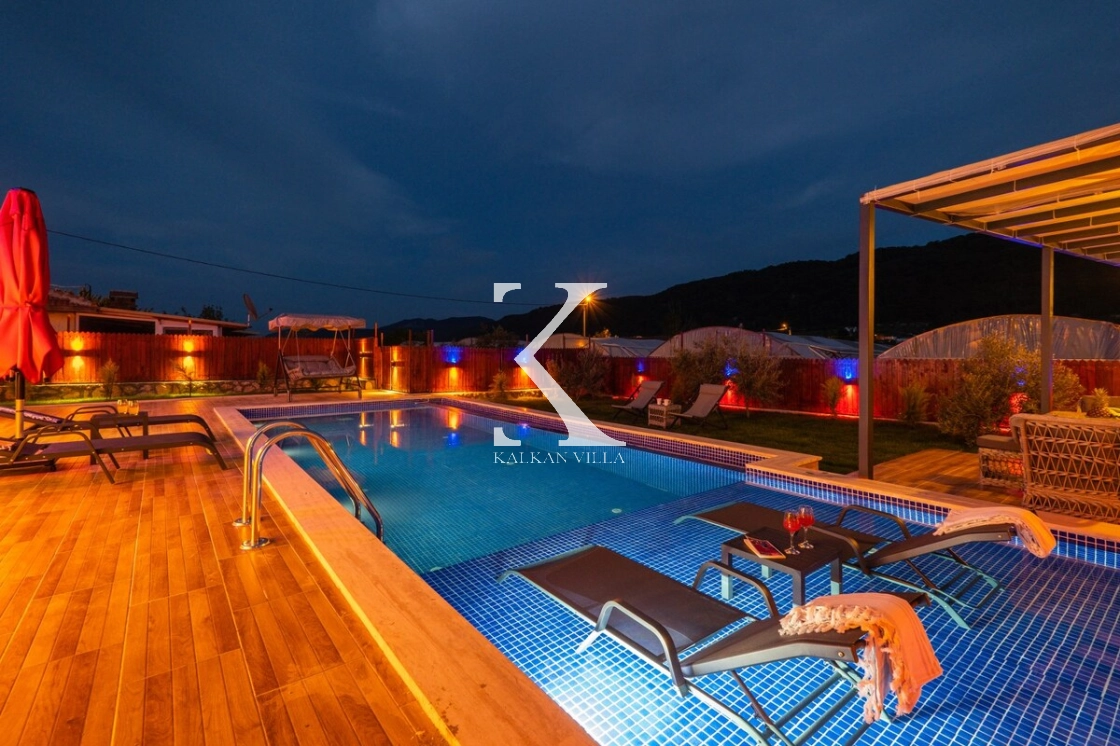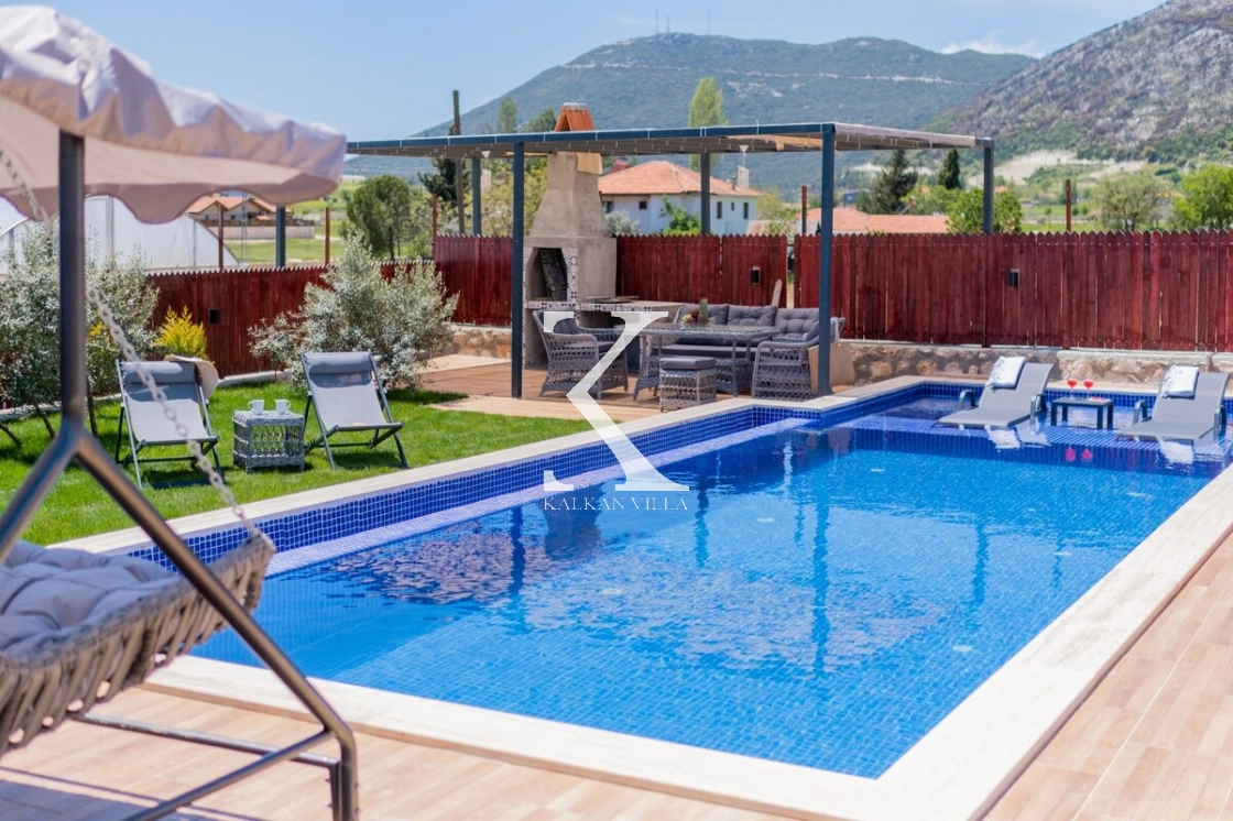 Villanın geniş bahçesinde bulunan özel yüzme havuzu, şezlonglar, güneş şemsiyeleri, oturma köşesi ve yemek masası sayesinde misafirler gün boyunca doğanın tadını çıkarabilirler.