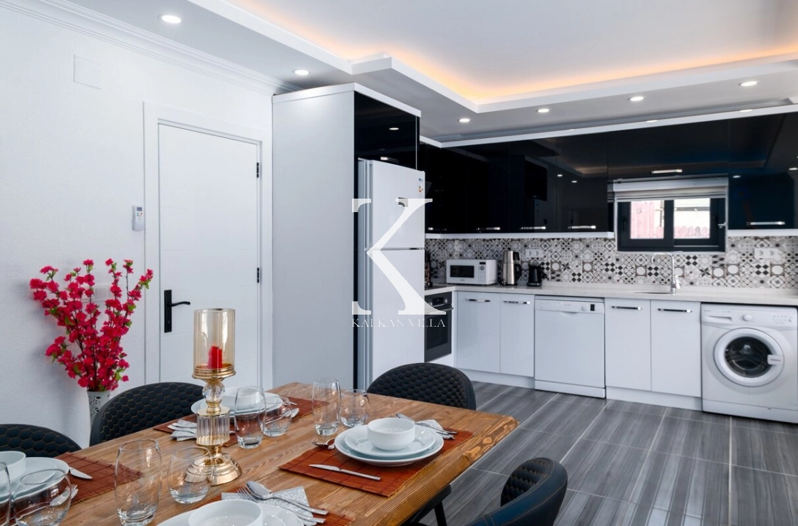 Taş ve ahşap mimarinin uyumlu şekilde kullanıldığı Villa Başak Sarıbelen’de modern Amerikan mutfak bulunmaktadır.