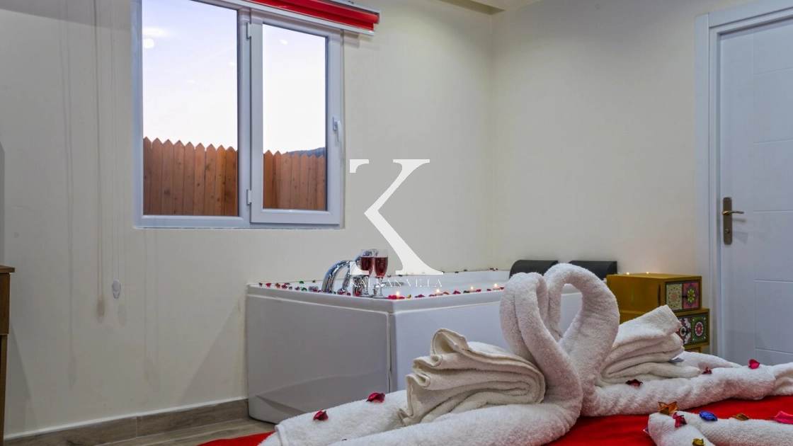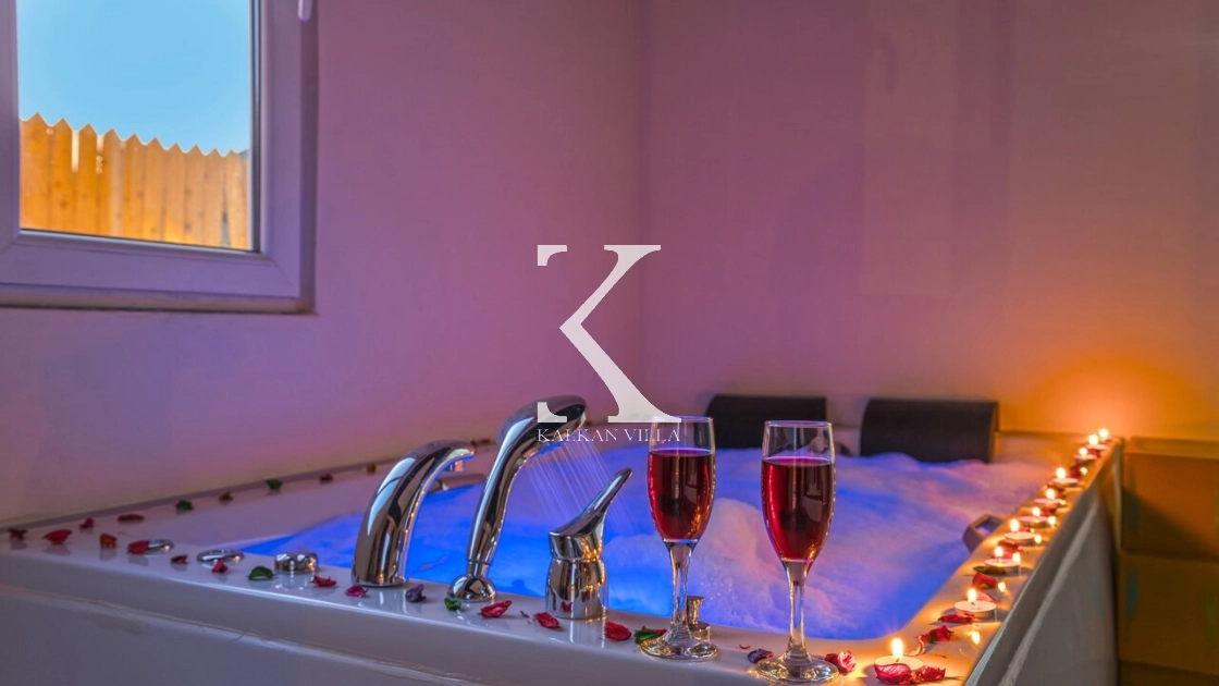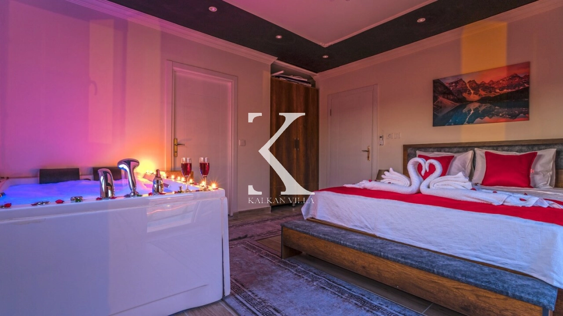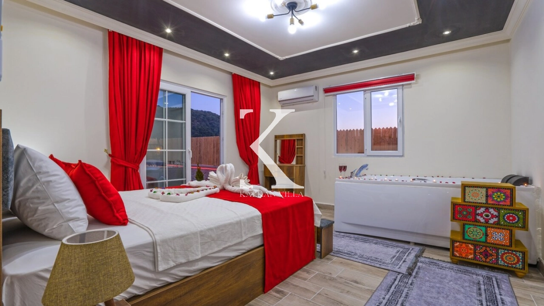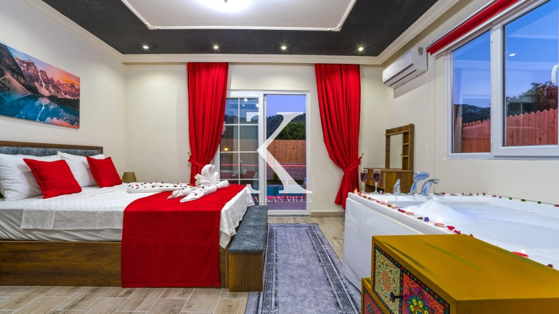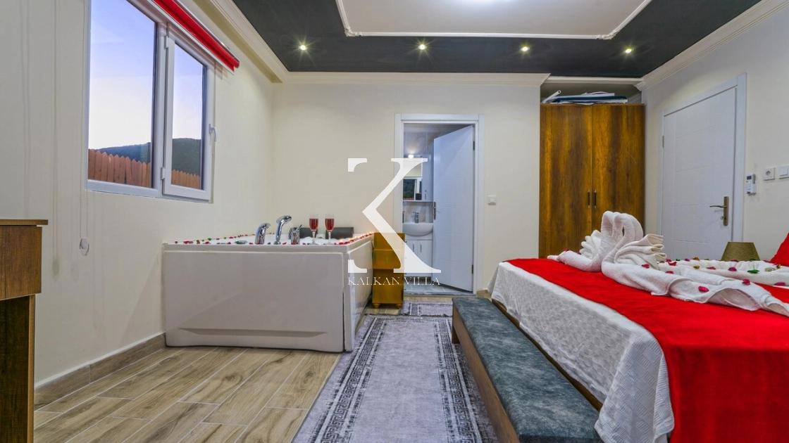 Ana yatak odasında bulunan jakuzili suit, doğayla iç içe romantik bir atmosfer sunarken, villanın tamamı modern eşyalarla dekore edilmiştir.