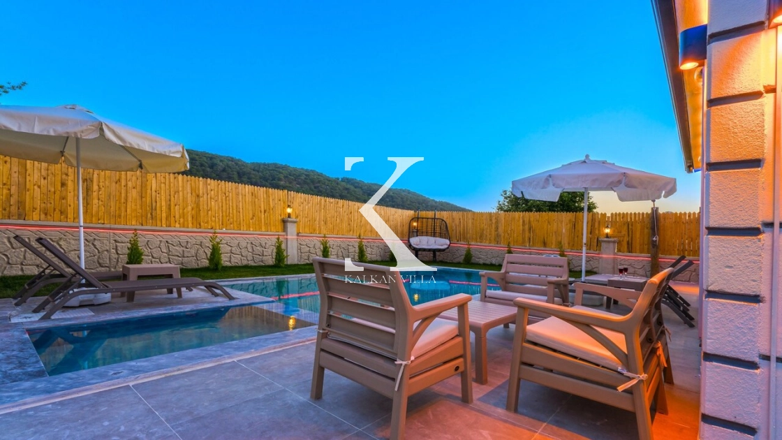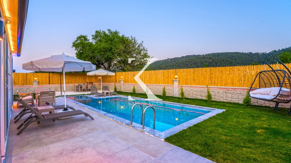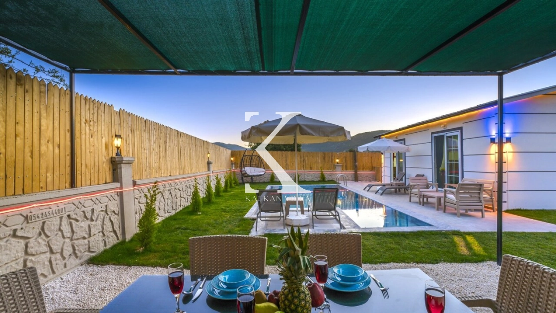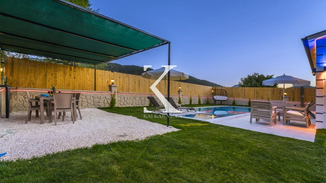 Villanın geniş ve tam korunaklı bahçesinde özel yüzme havuzu, şezlonglar, oturma alanı, yemek masası ve barbekü yer almaktadır.