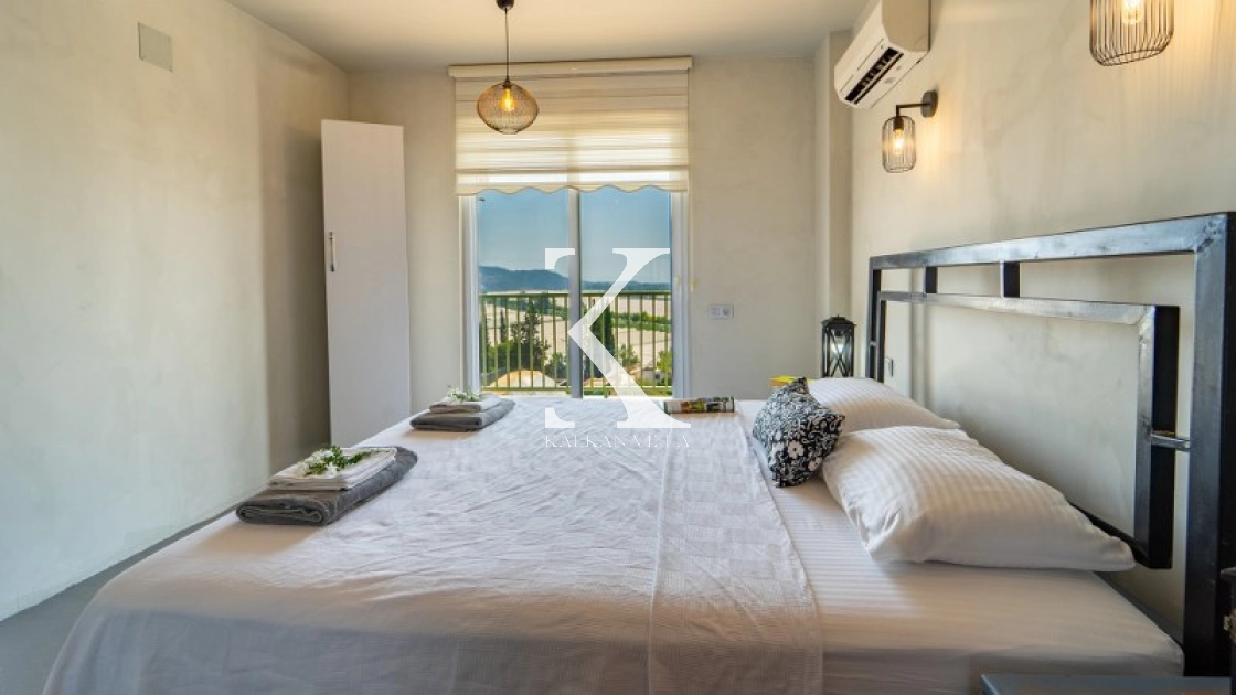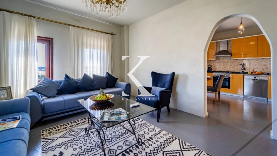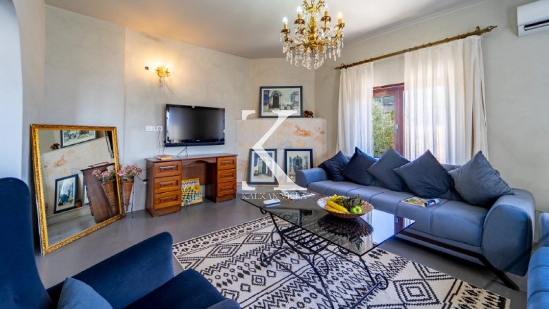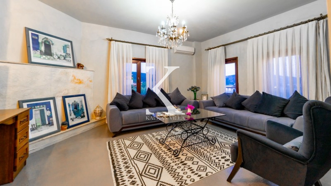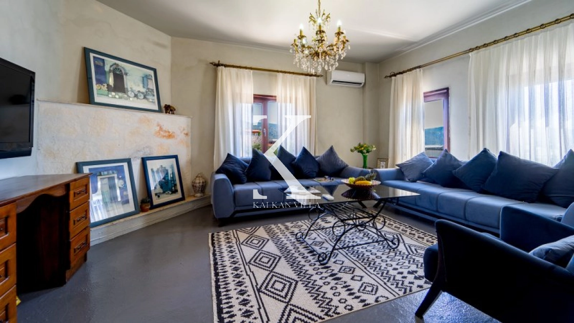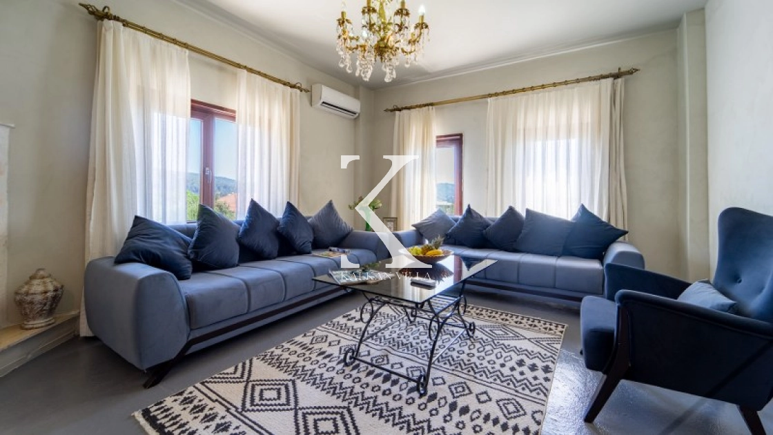Deniz ve doğa manzarasına sahip, açık ve soft tonlarla dekore edilmiş salonda;