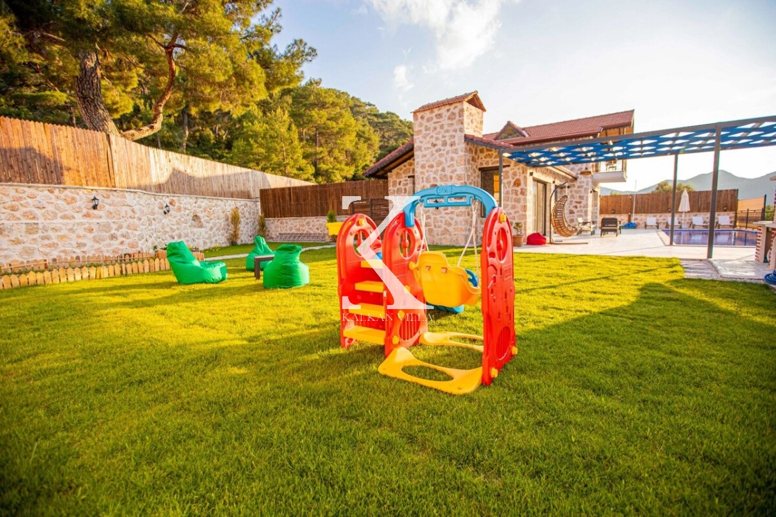 Villanın bir yatak odasında bulunan jakuzi, tatilinize romantik bir dokunuş katarken; geniş bahçesinde yer alan özel yüzme havuzu, barbekü, salıncak ve çocuk oyun alanı her yaşa hitap eden konfor sunar.