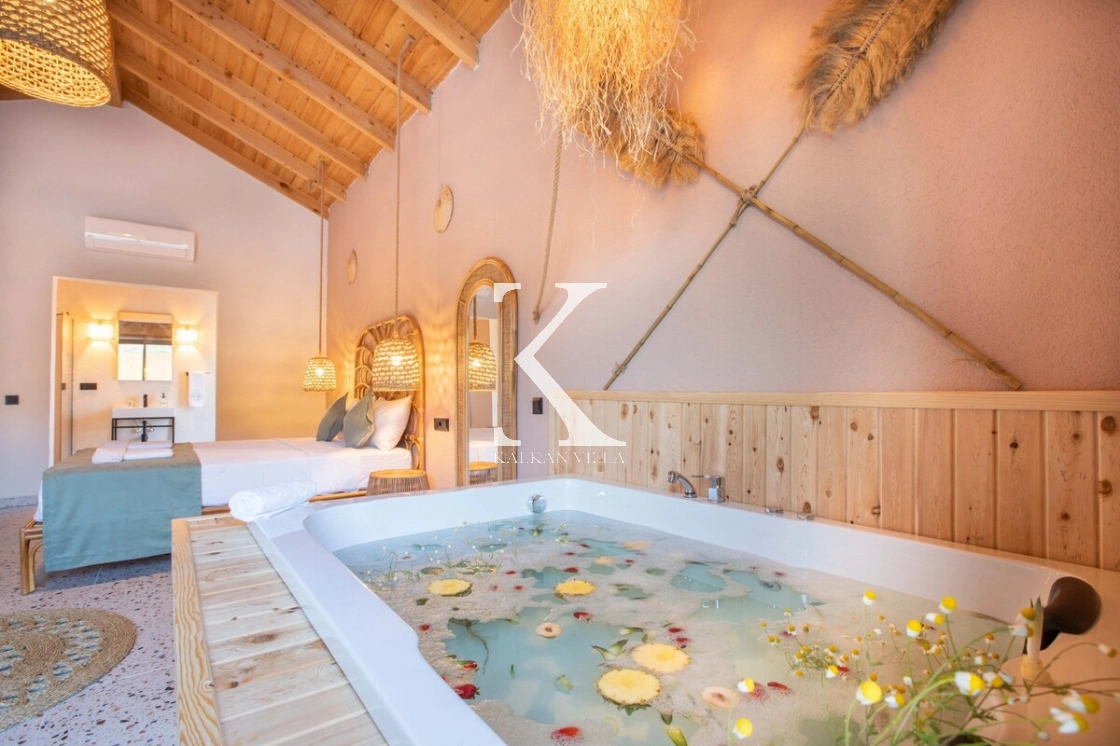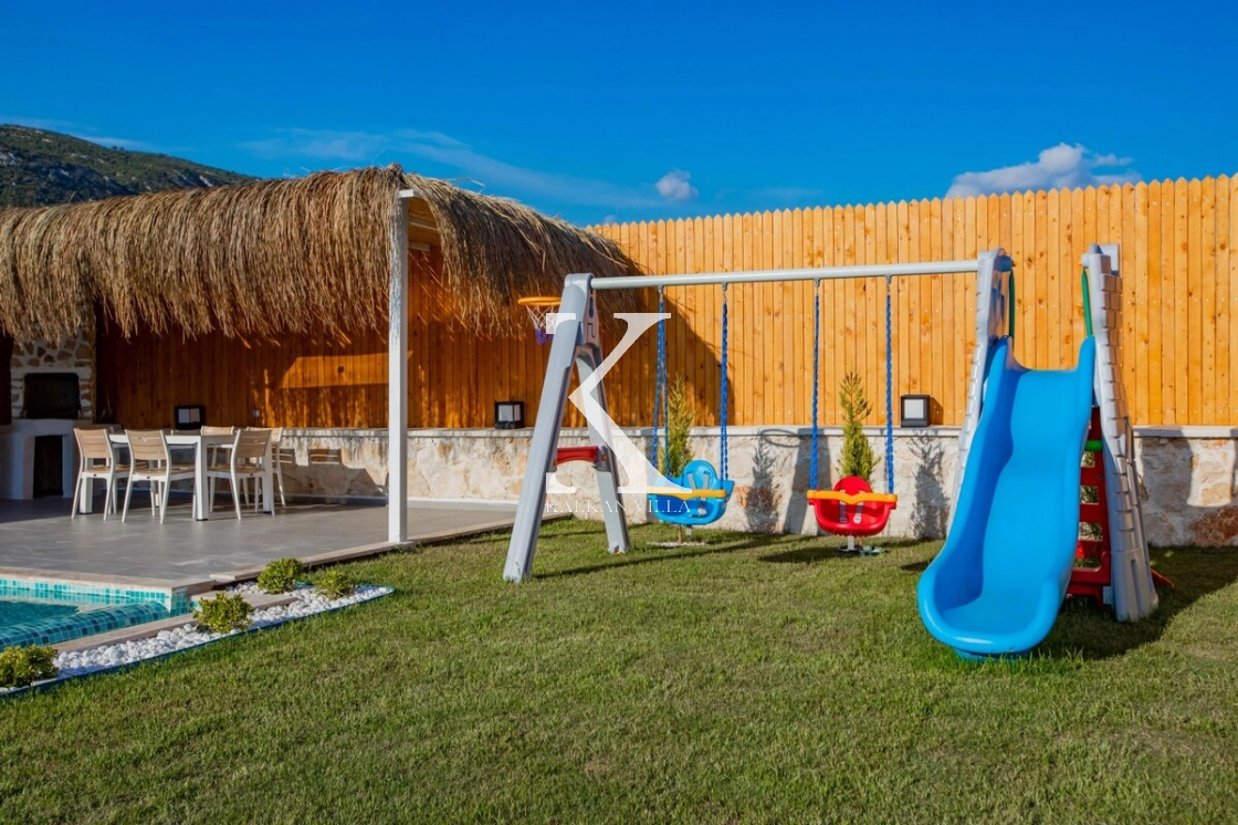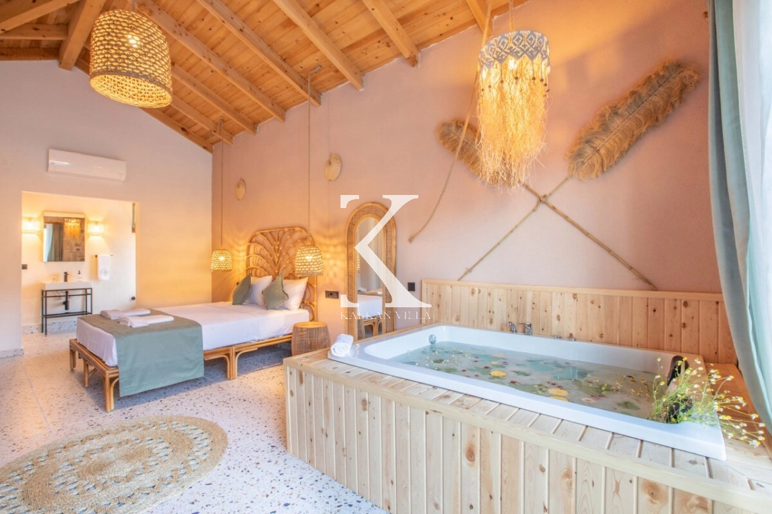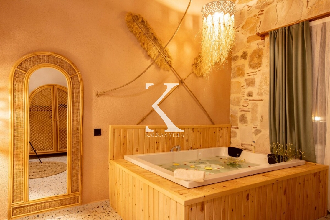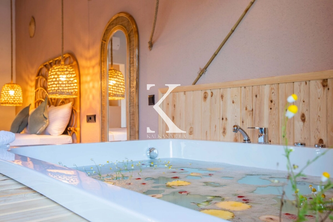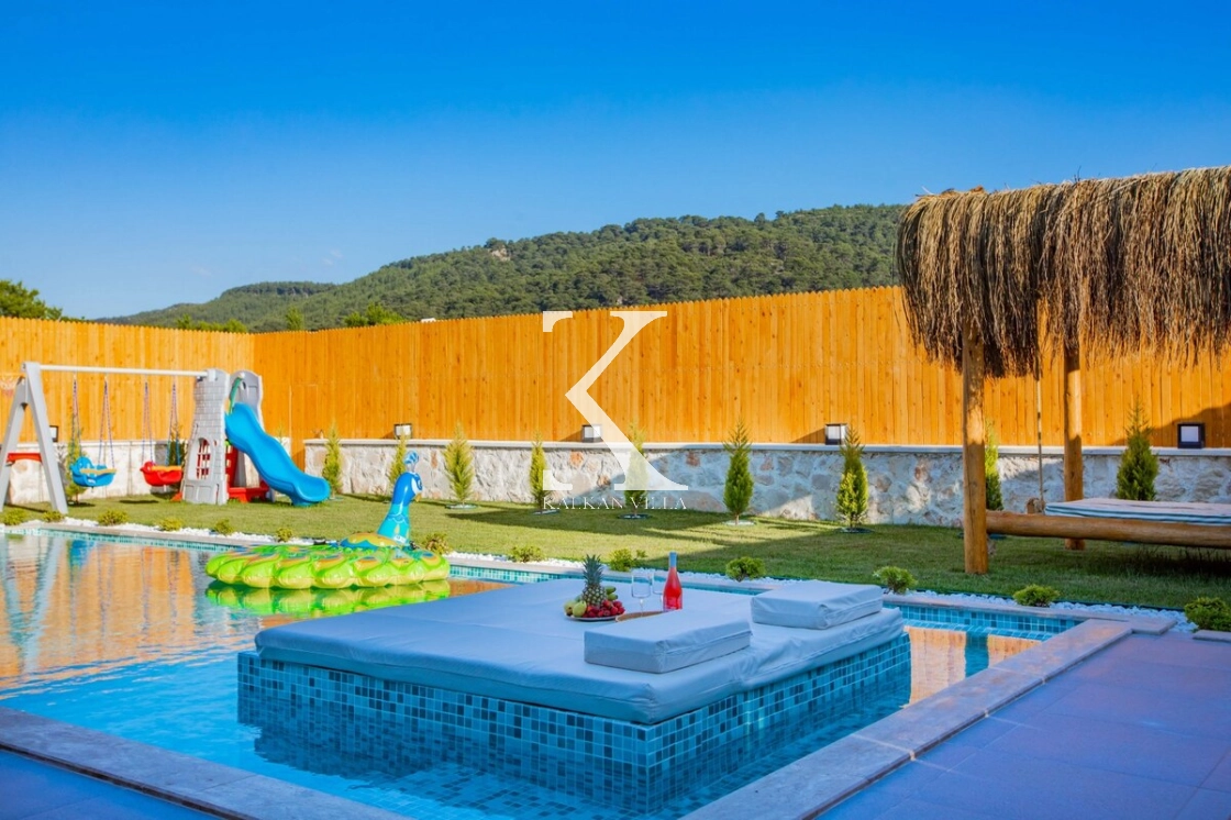 Sıcak ve davetkâr bir atmosfere sahip iç mekânı, korunaklı özel havuzu ve geniş bahçesi sayesinde gözlerden uzak, huzurlu bir tatil imkânı sağlar. Bahçede çocuklar için oyun alanı ve açık hava sineması, yetişkin misafirler için ise salıncak, sauna, hamam, masa tenisi ve langırt gibi birçok aktivite bulunmaktadır.