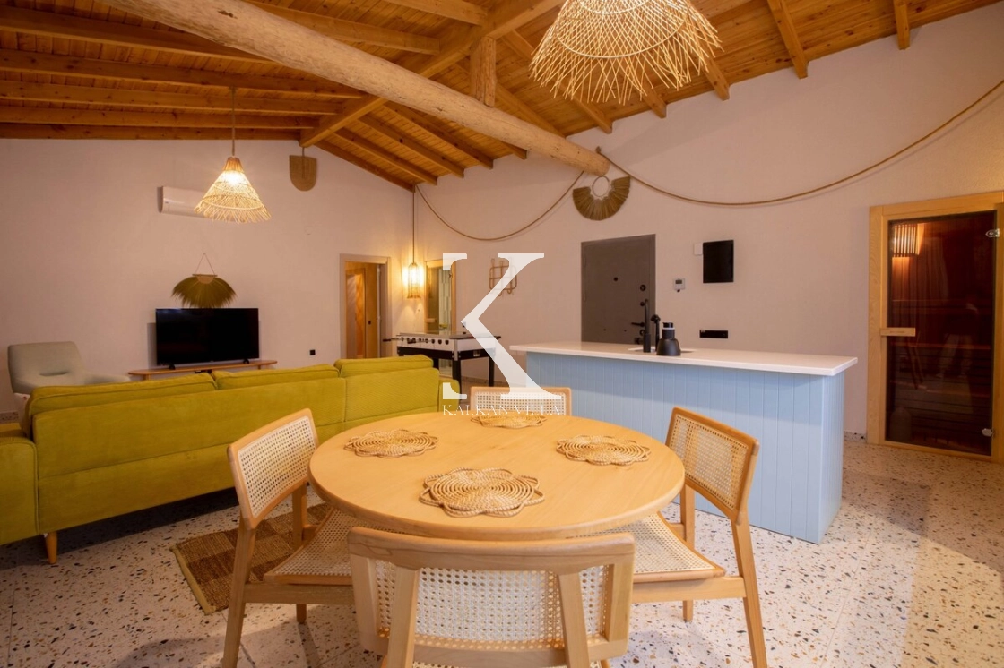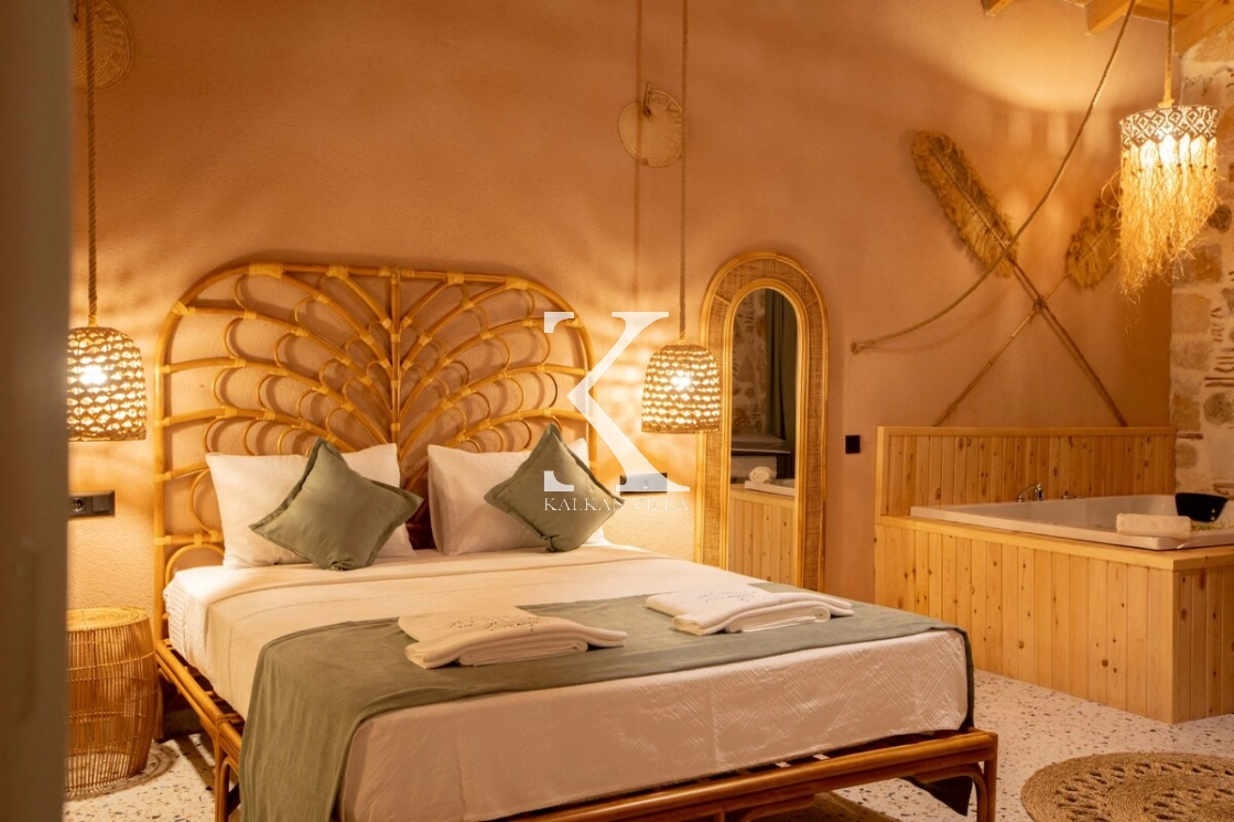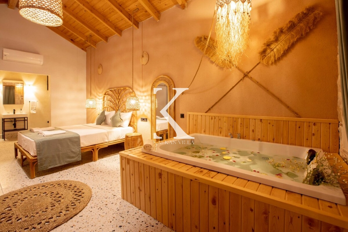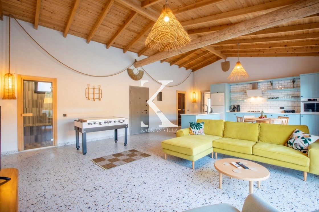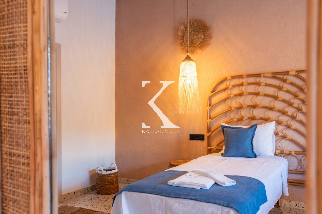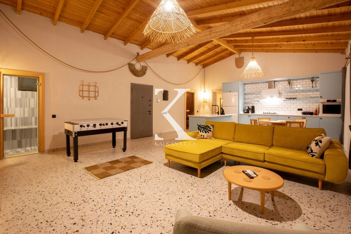Sıcak ve davetkâr bir atmosfere sahip iç mekânı, korunaklı özel havuzu ve geniş bahçesi sayesinde gözlerden uzak, huzurlu bir tatil imkânı sağlar. Bahçede çocuklar için oyun alanı ve açık hava sineması, yetişkin misafirler için ise salıncak, sauna, hamam, masa tenisi ve langırt gibi birçok aktivite bulunmaktadır.