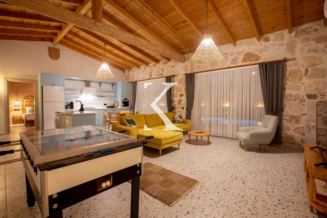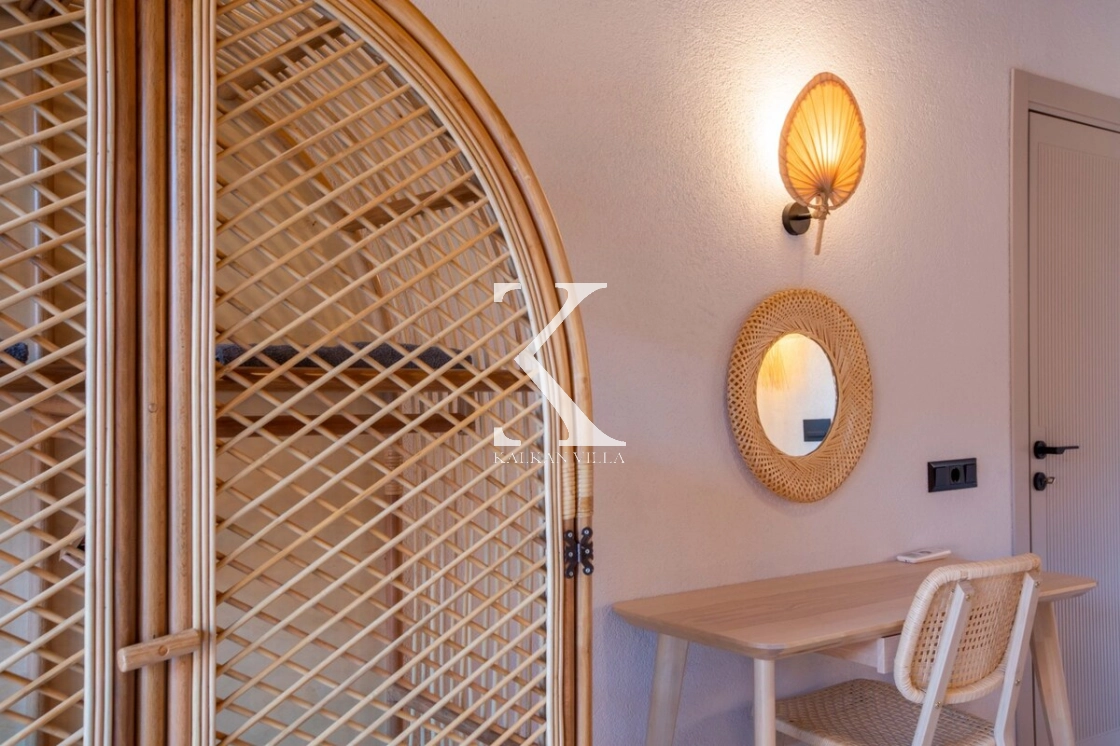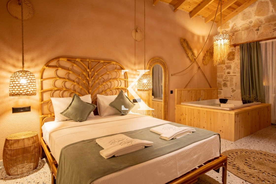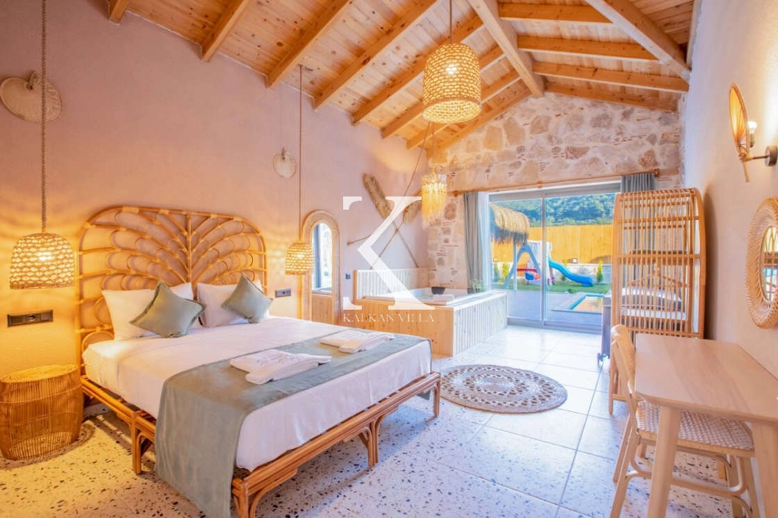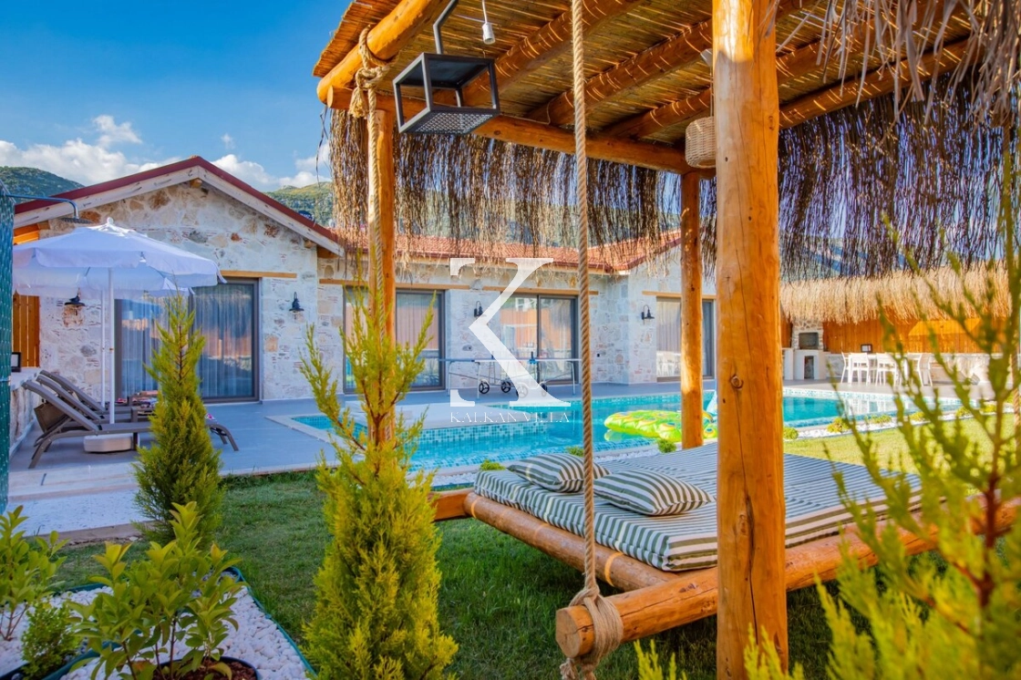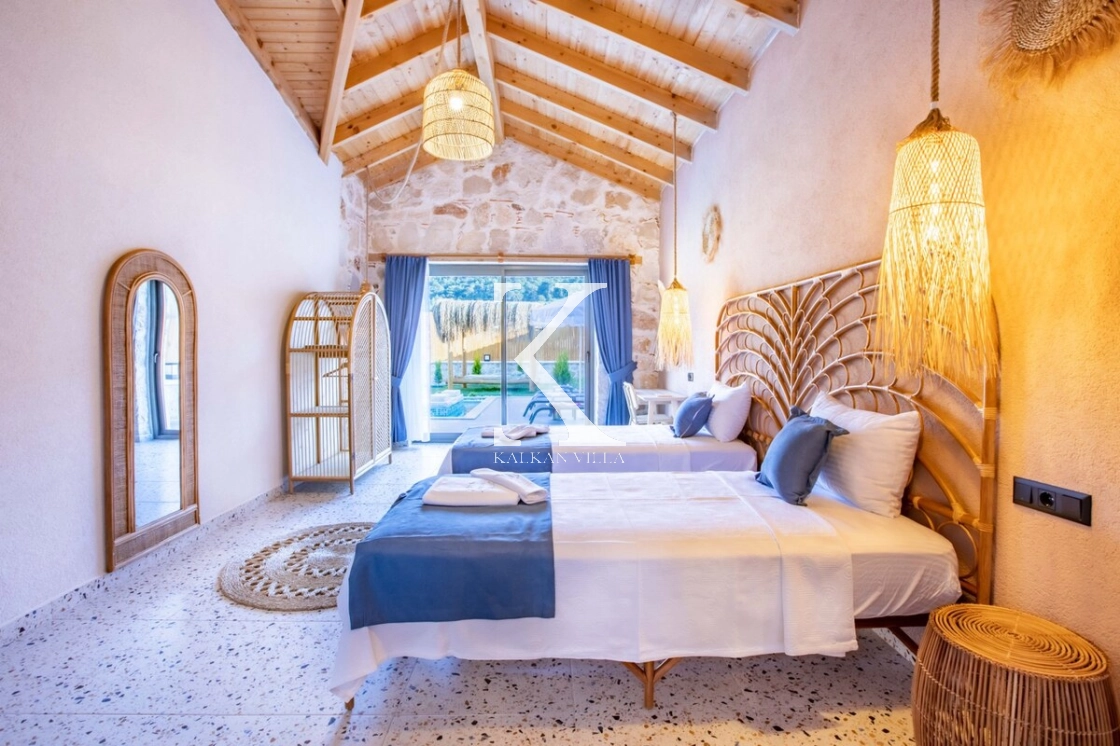 Villa Kekik Twins, Kalkan’ın doğayla iç içe bölgelerinden Sarıbelen’de konumlanan; taş ve ahşap mimarisi, bohem dekorasyonu ve zengin donanımıyla öne çıkan özel bir kiralık tatil villasıdır.