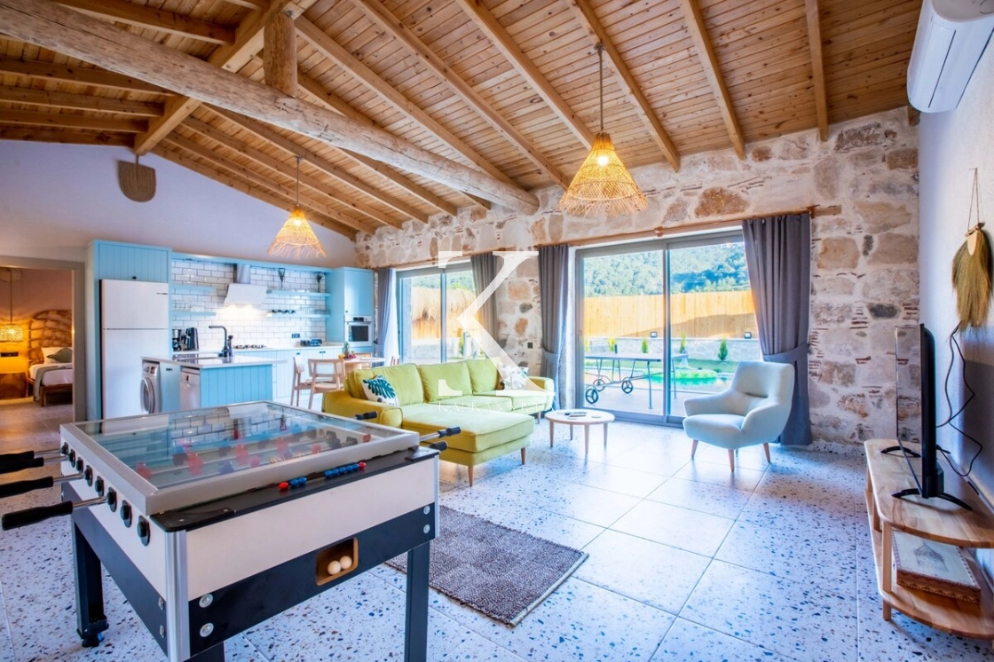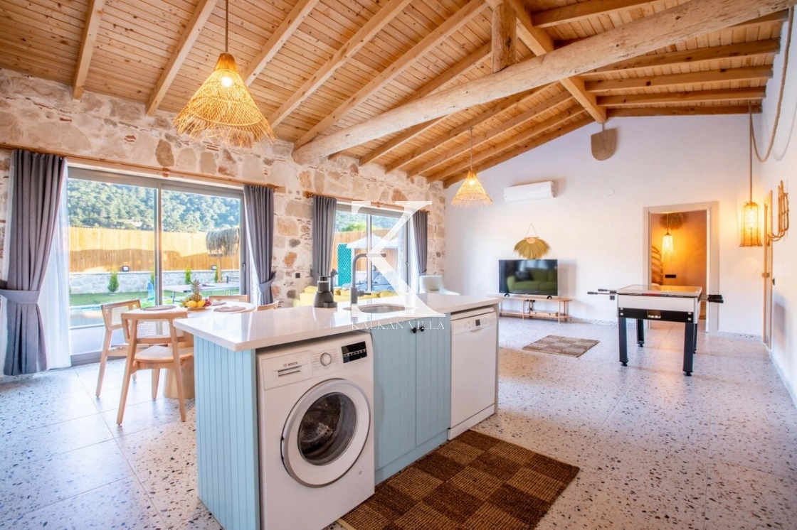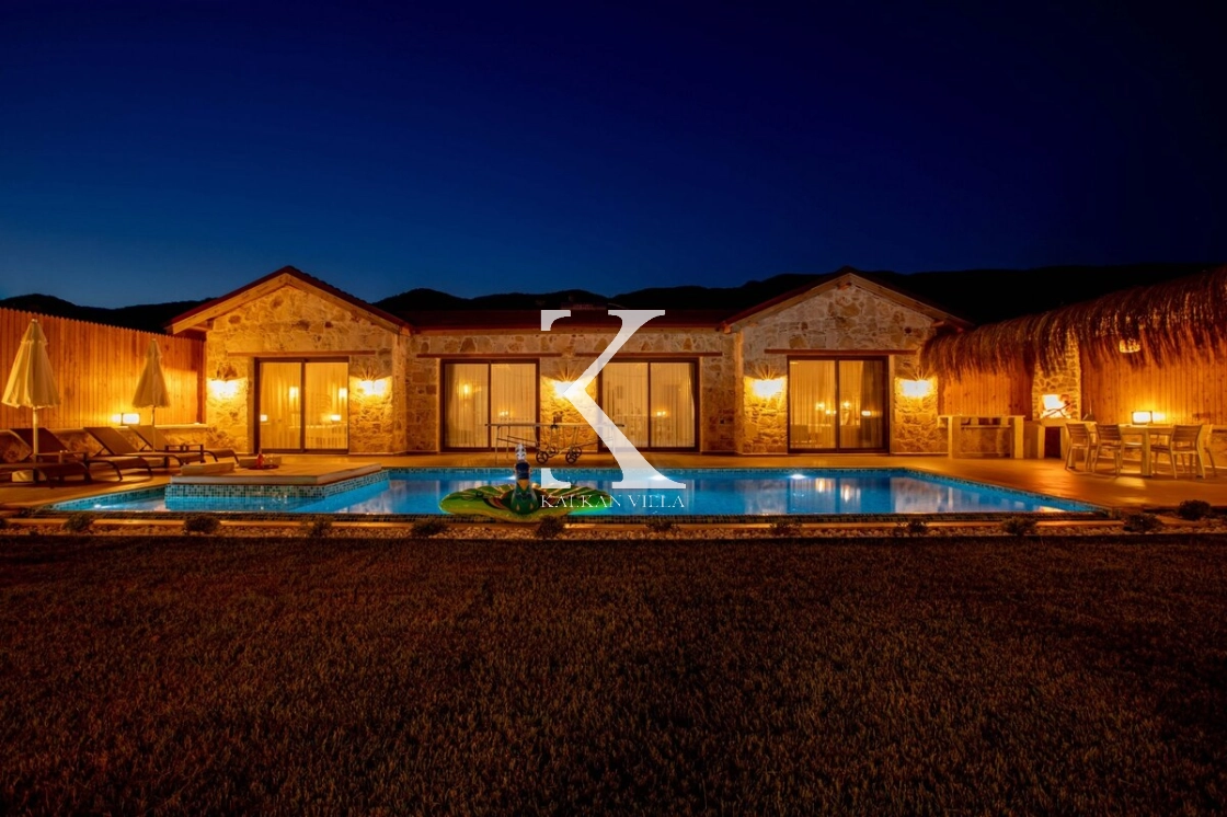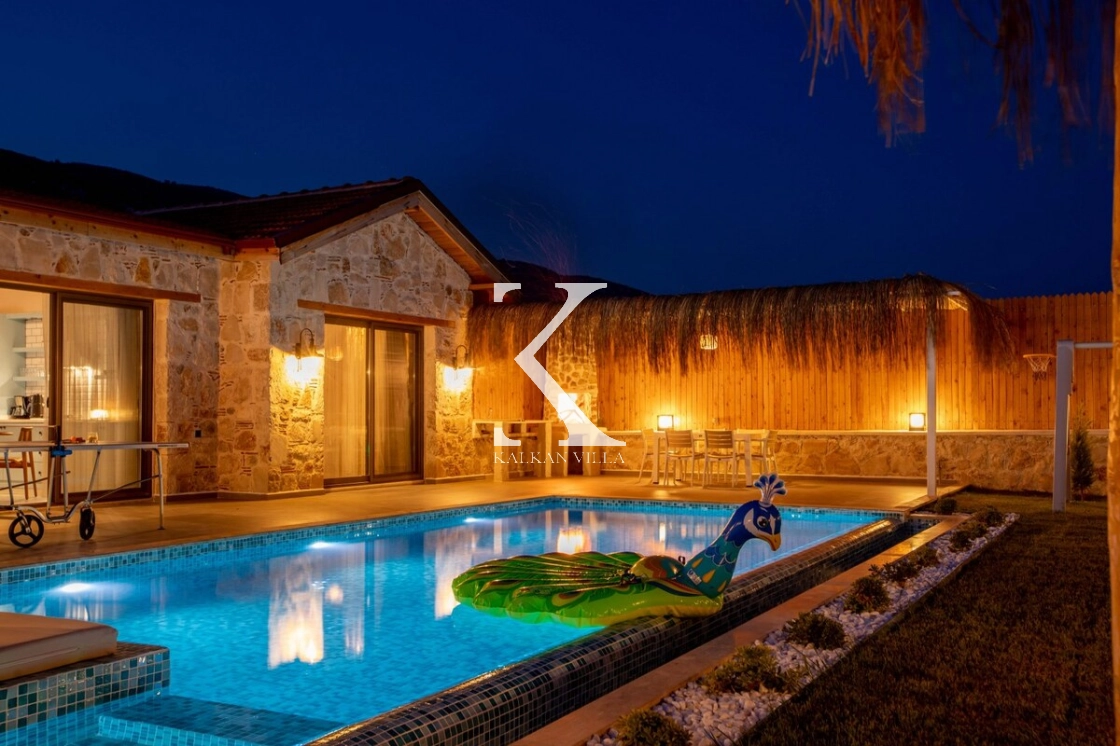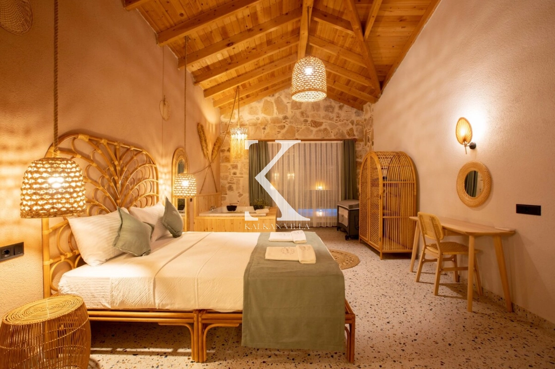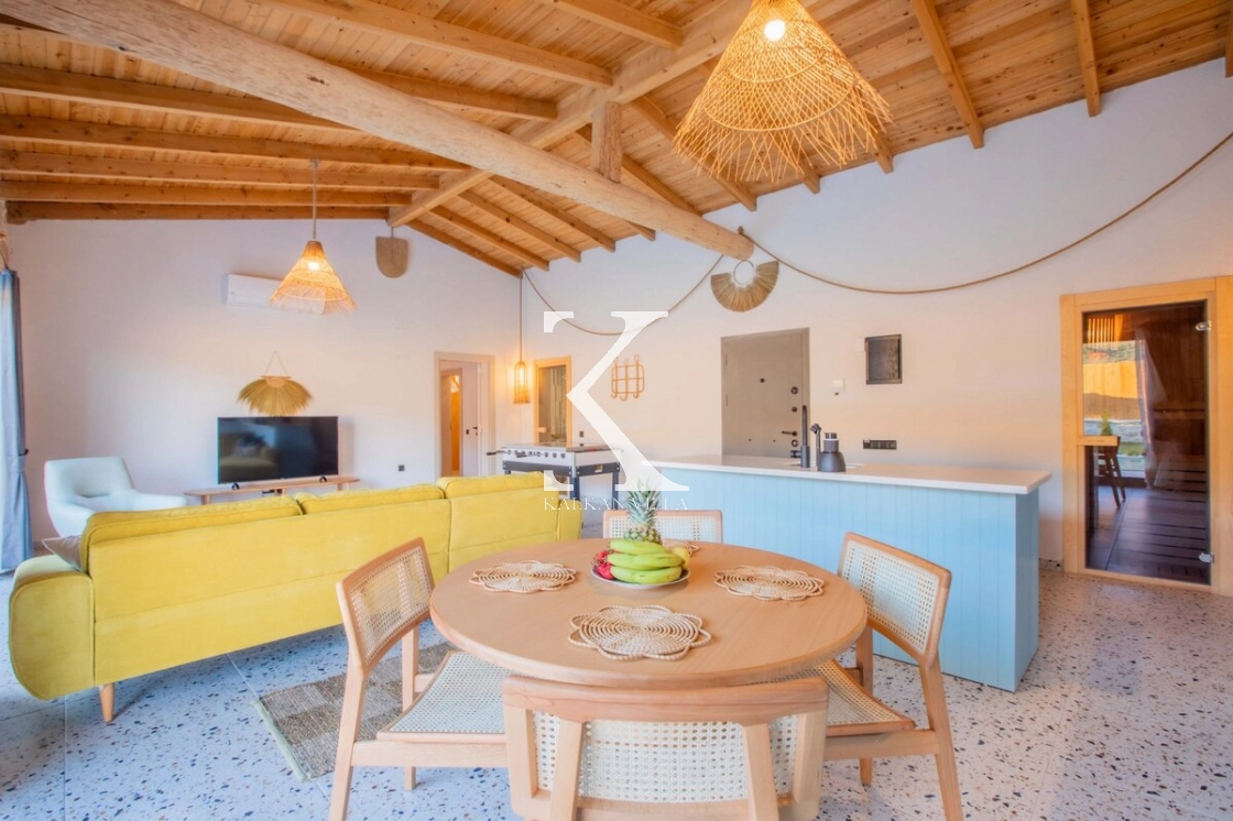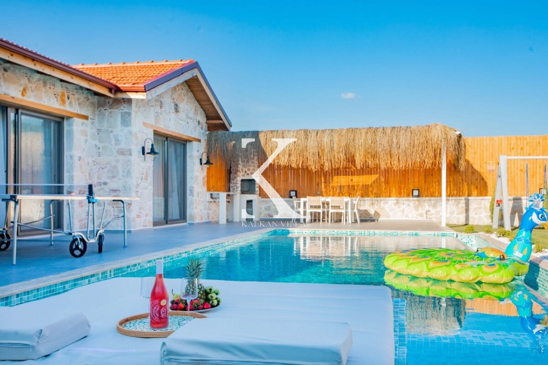 Villa Kekik Twins, Kalkan’ın doğayla iç içe bölgelerinden Sarıbelen’de konumlanan; taş ve ahşap mimarisi, bohem dekorasyonu ve zengin donanımıyla öne çıkan özel bir kiralık tatil villasıdır.