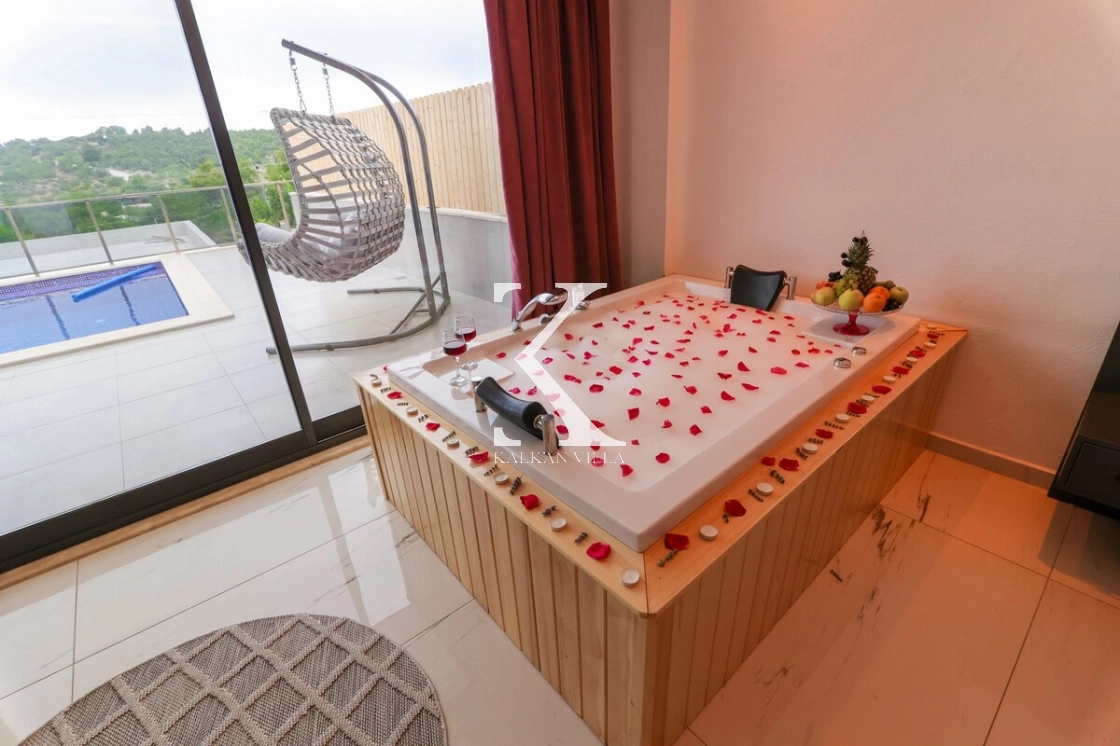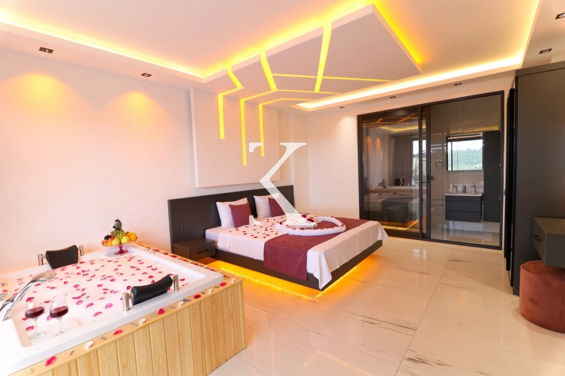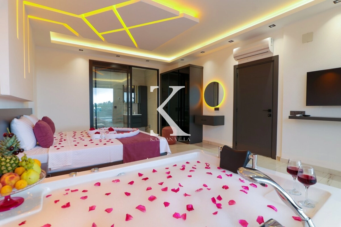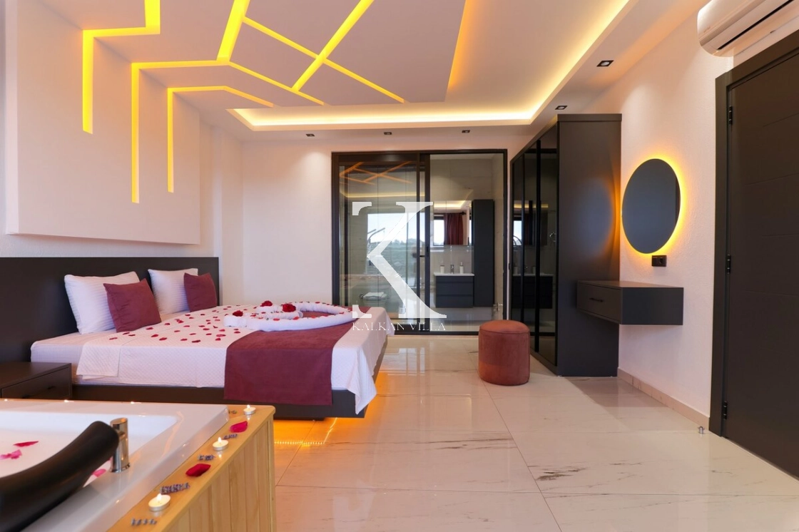 İç mekân modern ve konforlu eşyalarla dekore edilmiş olup, ana yatak odasında jakuzi yer almaktadır.
