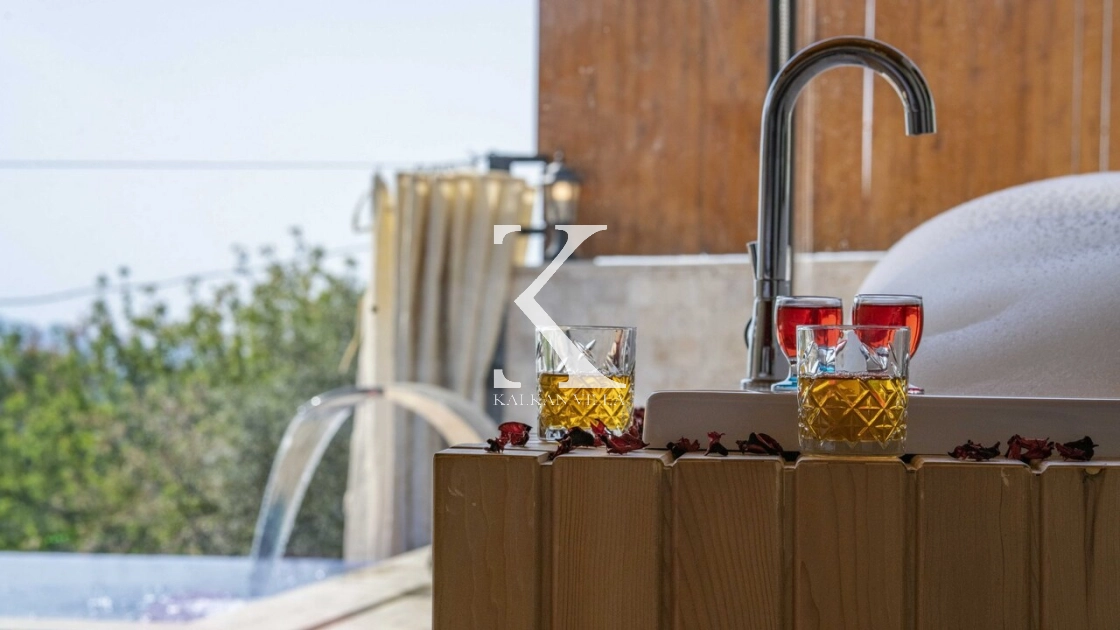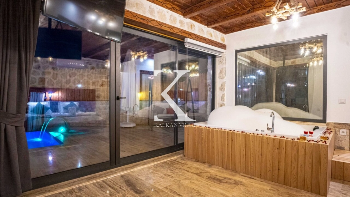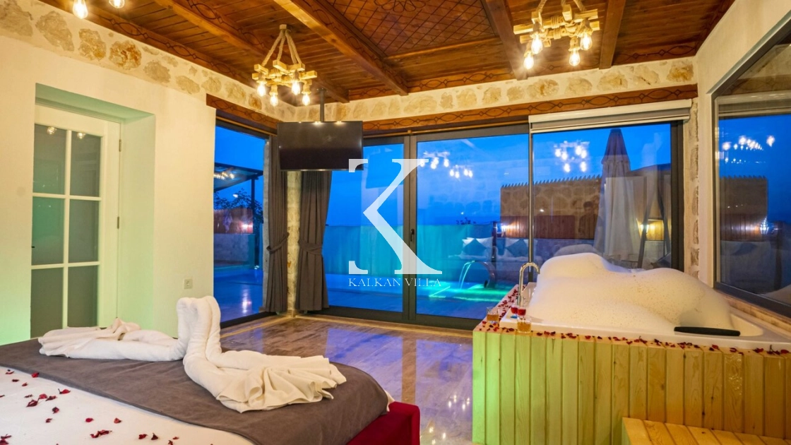 Yatak odasında yer alan jakuzili özel alan, tatilinize romantik bir dokunuş katarken, geniş pencerelerden doğa ve deniz manzarasının keyfini çıkarabilirsiniz.