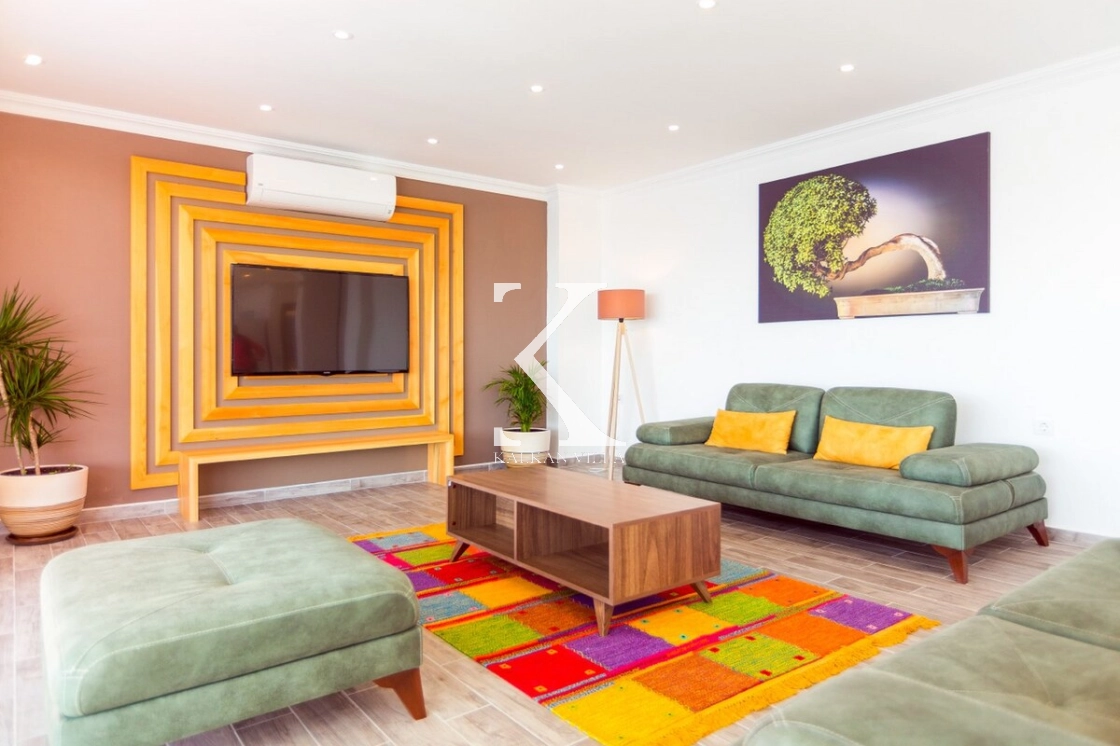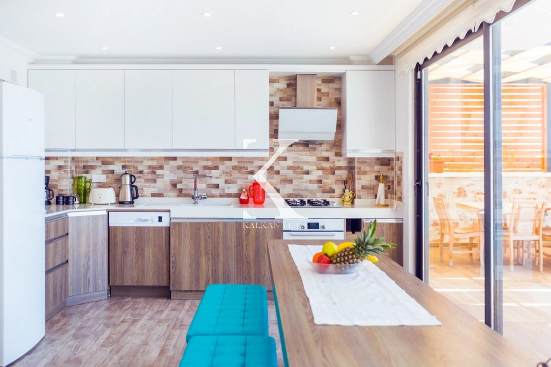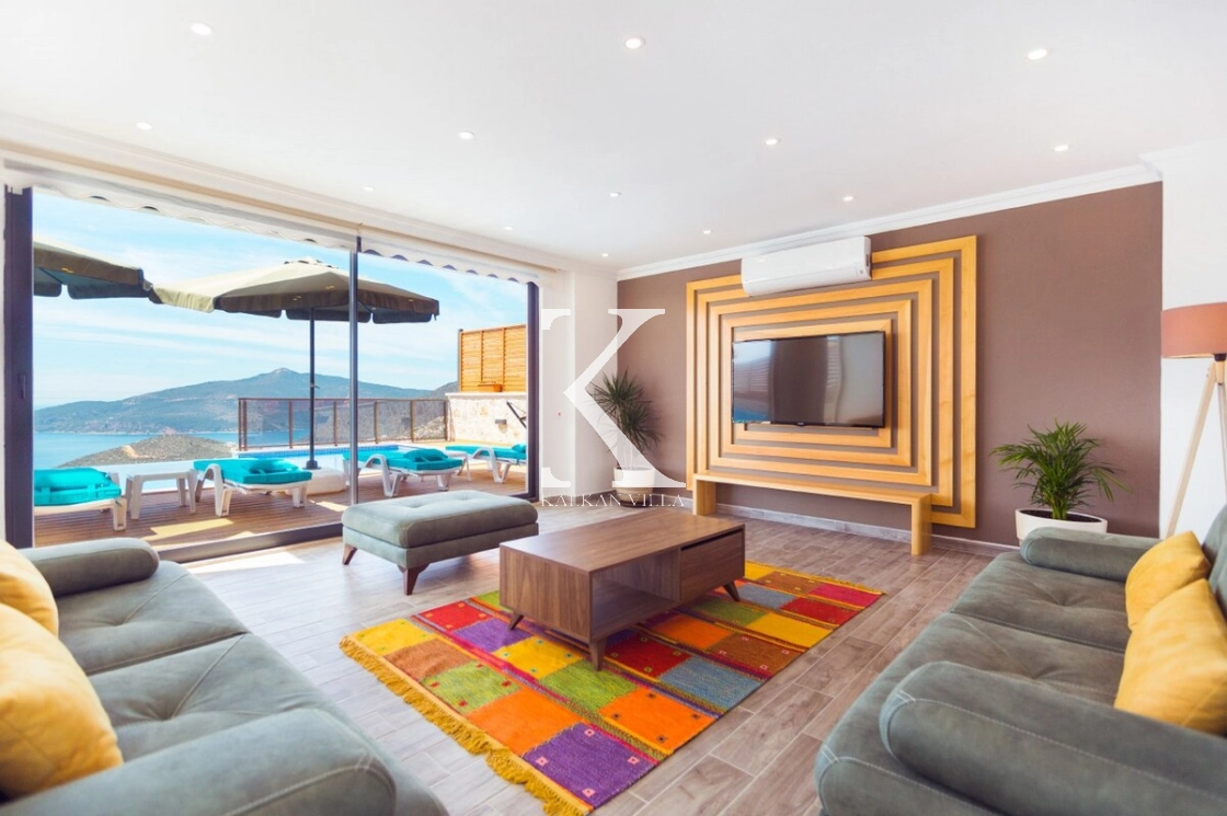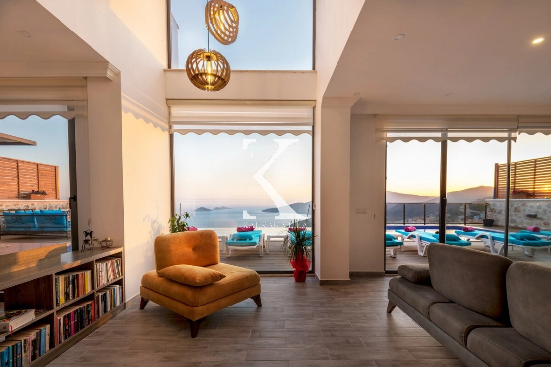 Mutfakla bağlantılı ferah ve aydınlık salon, konforlu oturma alanı ve etkileyici Kalkan manzarasıyla huzurlu bir atmosfer sunar.