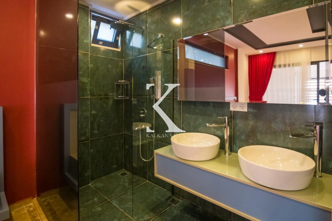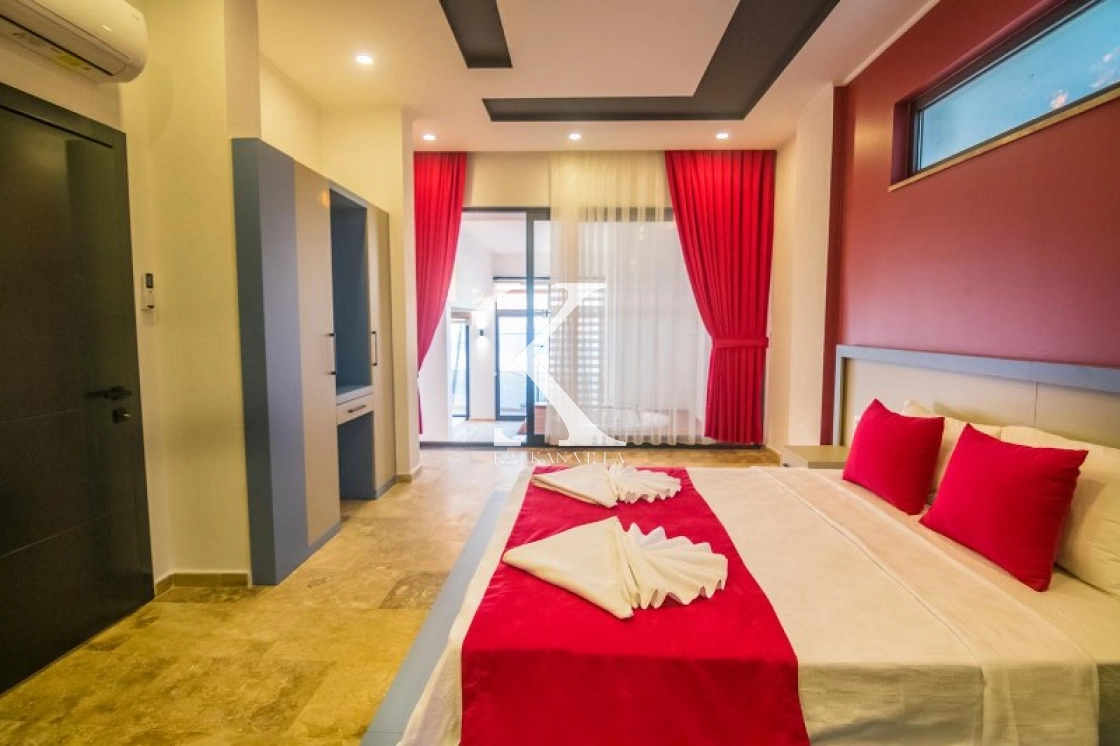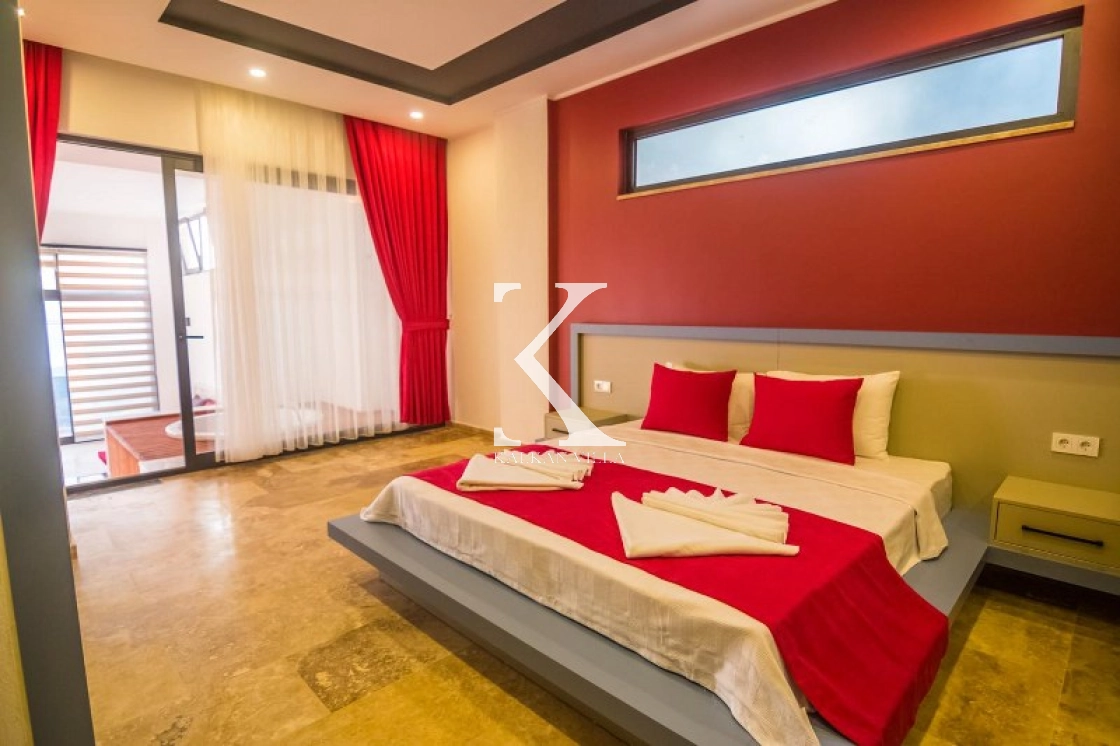 Modern mobilyalarla donatılmış iç mekân, konfor ve şıklığı bir araya getirirken, dışarıdan görünmeyen özel havuz alanı sayesinde tamamen mahrem bir tatil deneyimi sunar.