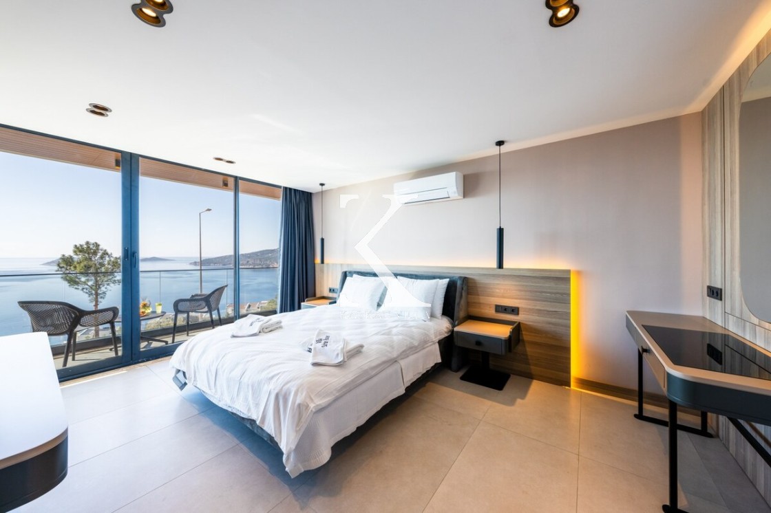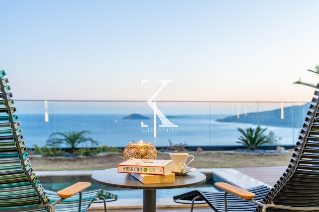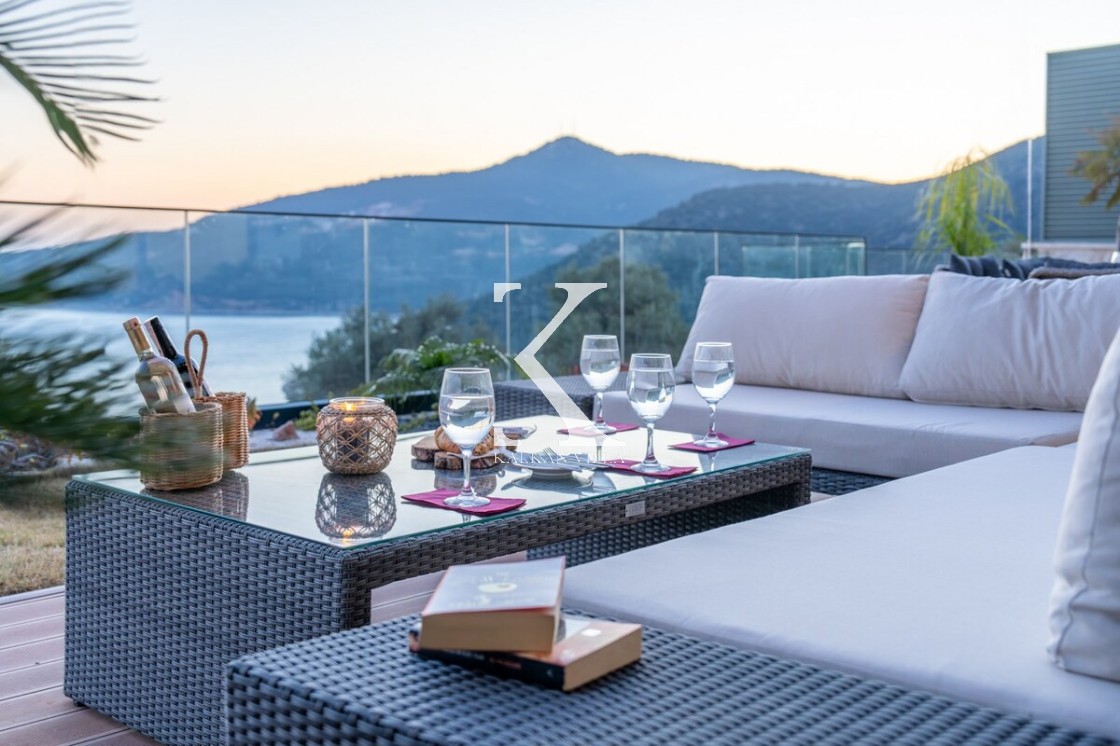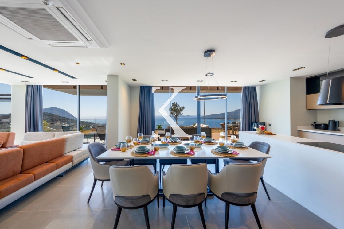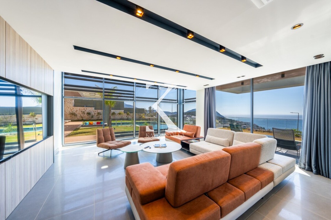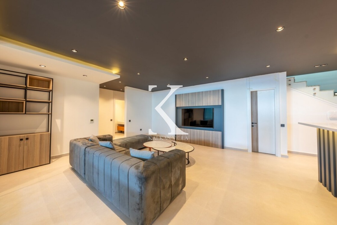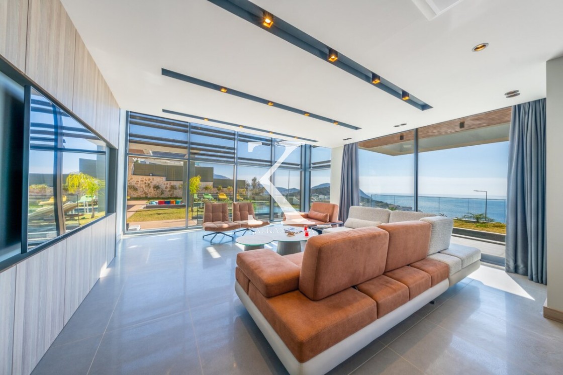 Deniz manzaralı, modern ve konforlu oturma grubu, TV ve klima.