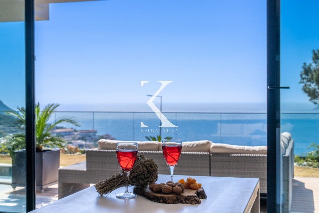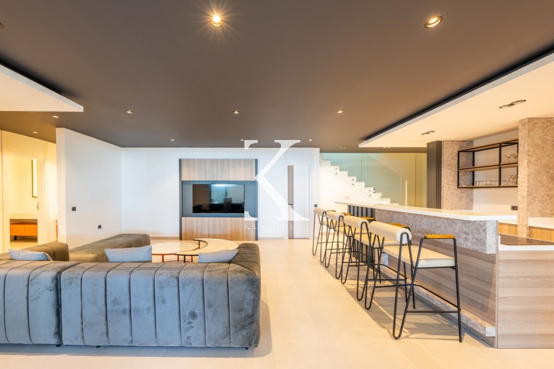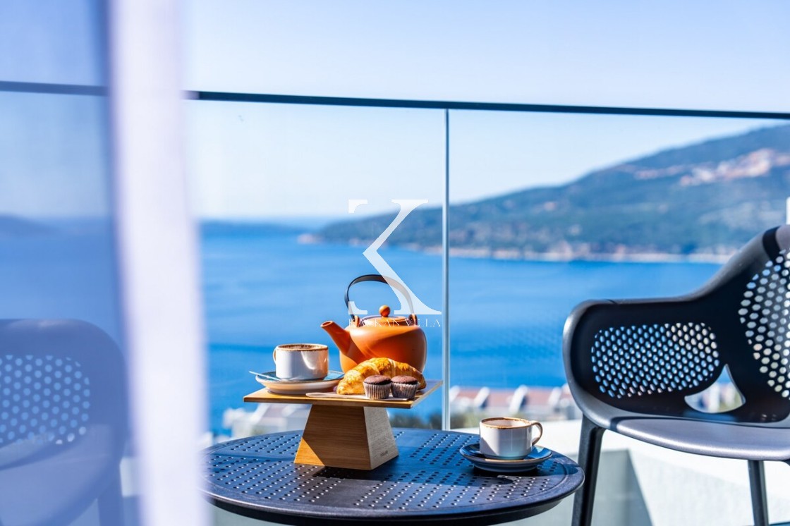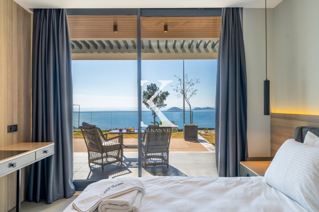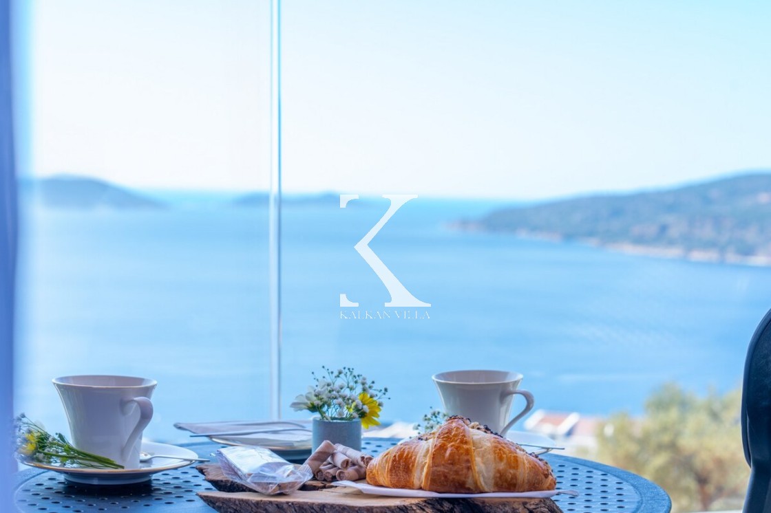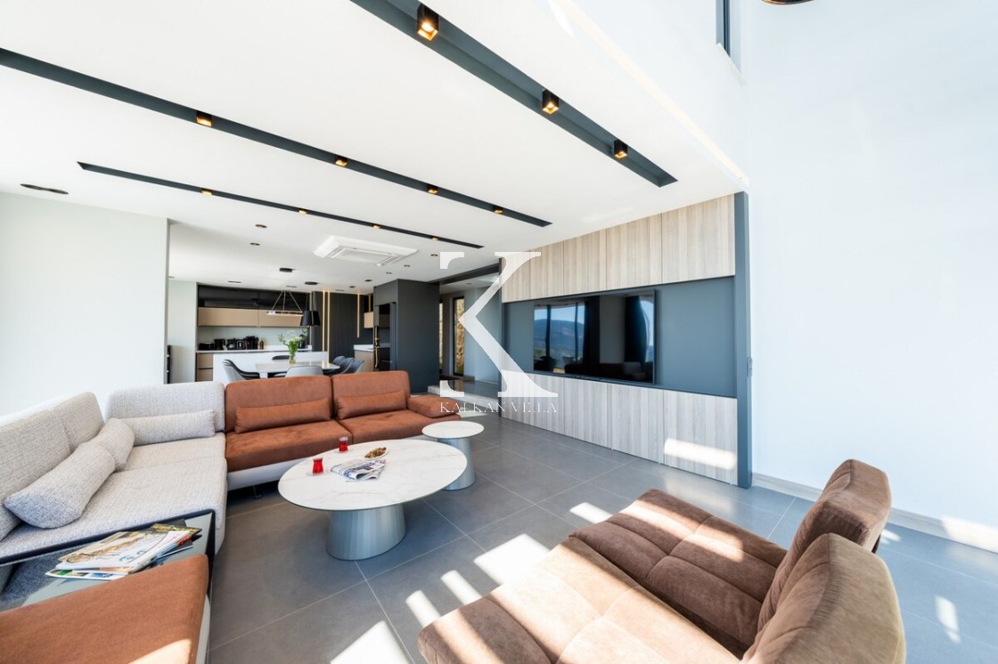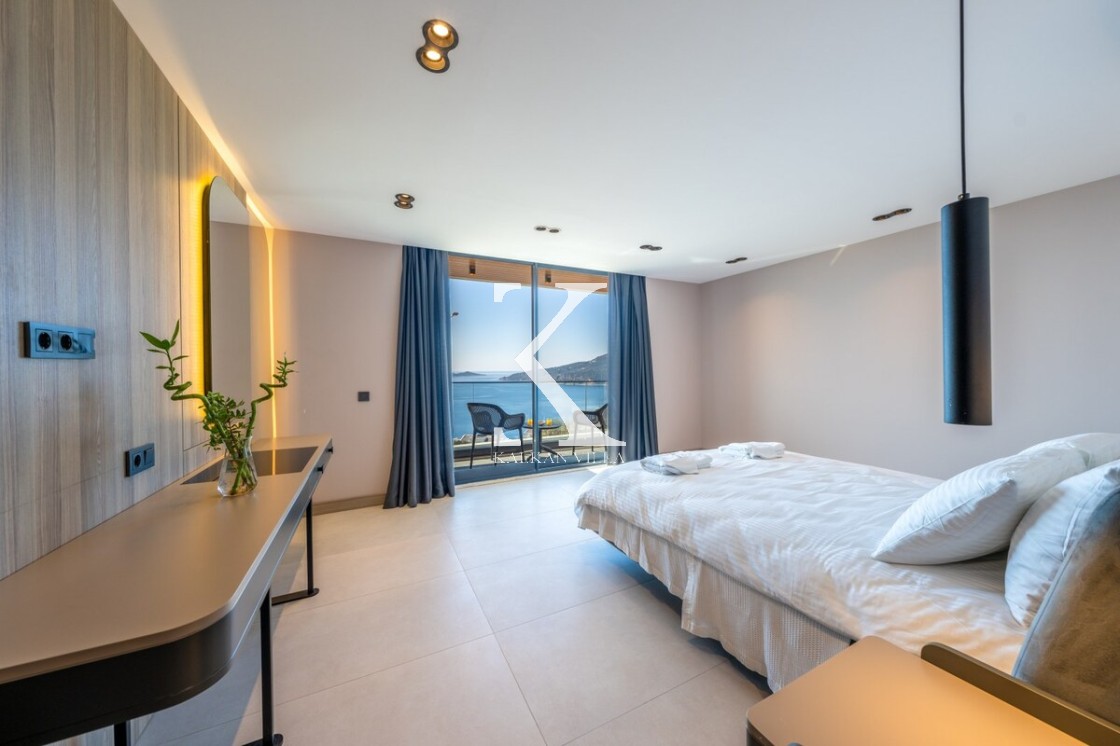 Deniz manzaralı, modern ve konforlu oturma grubu, TV ve klima.