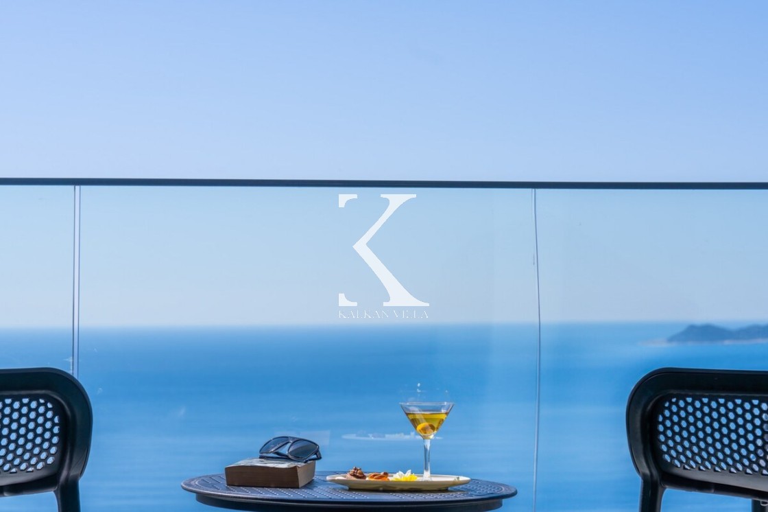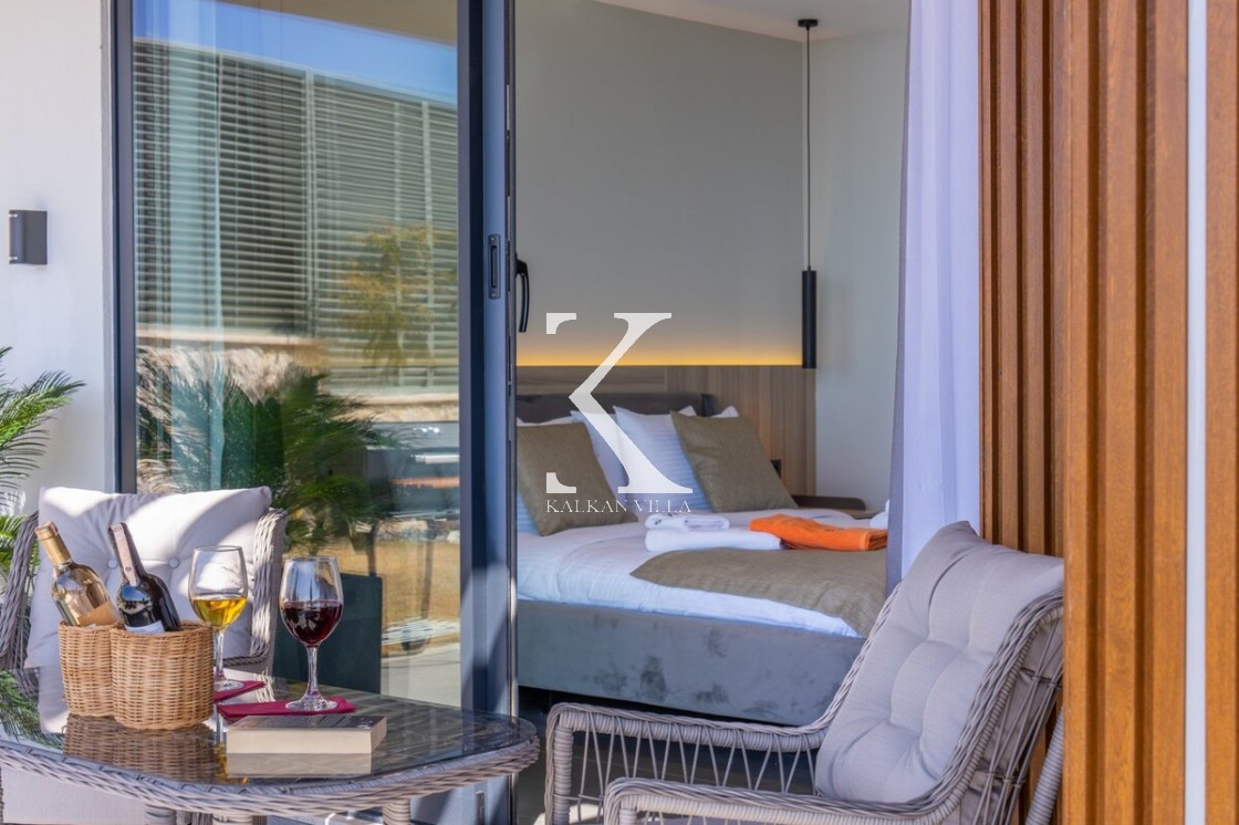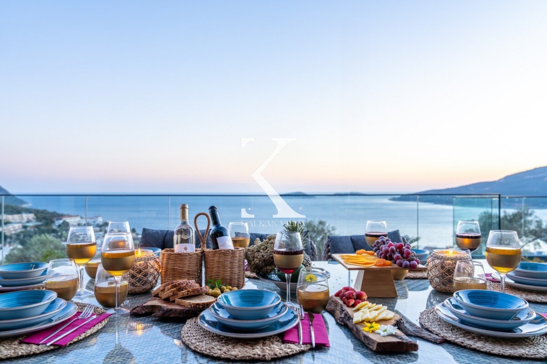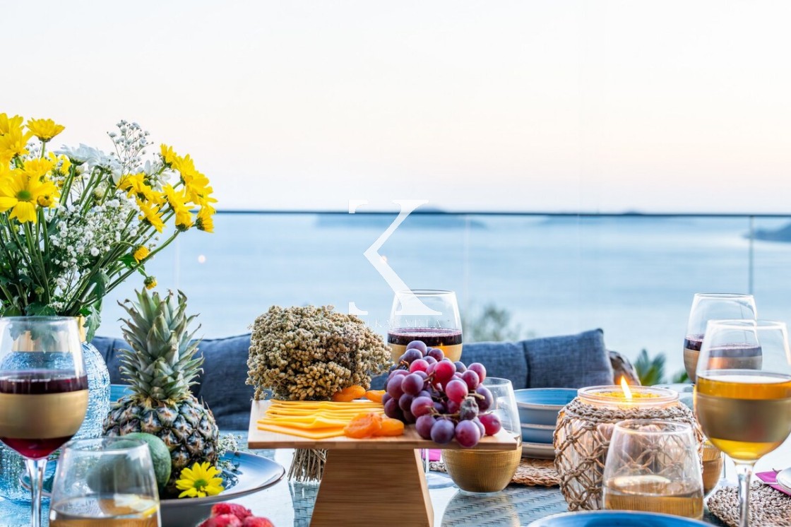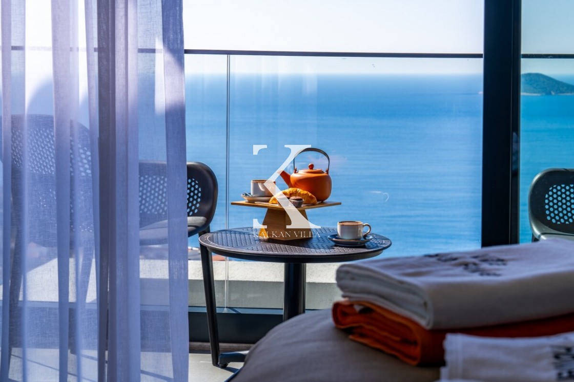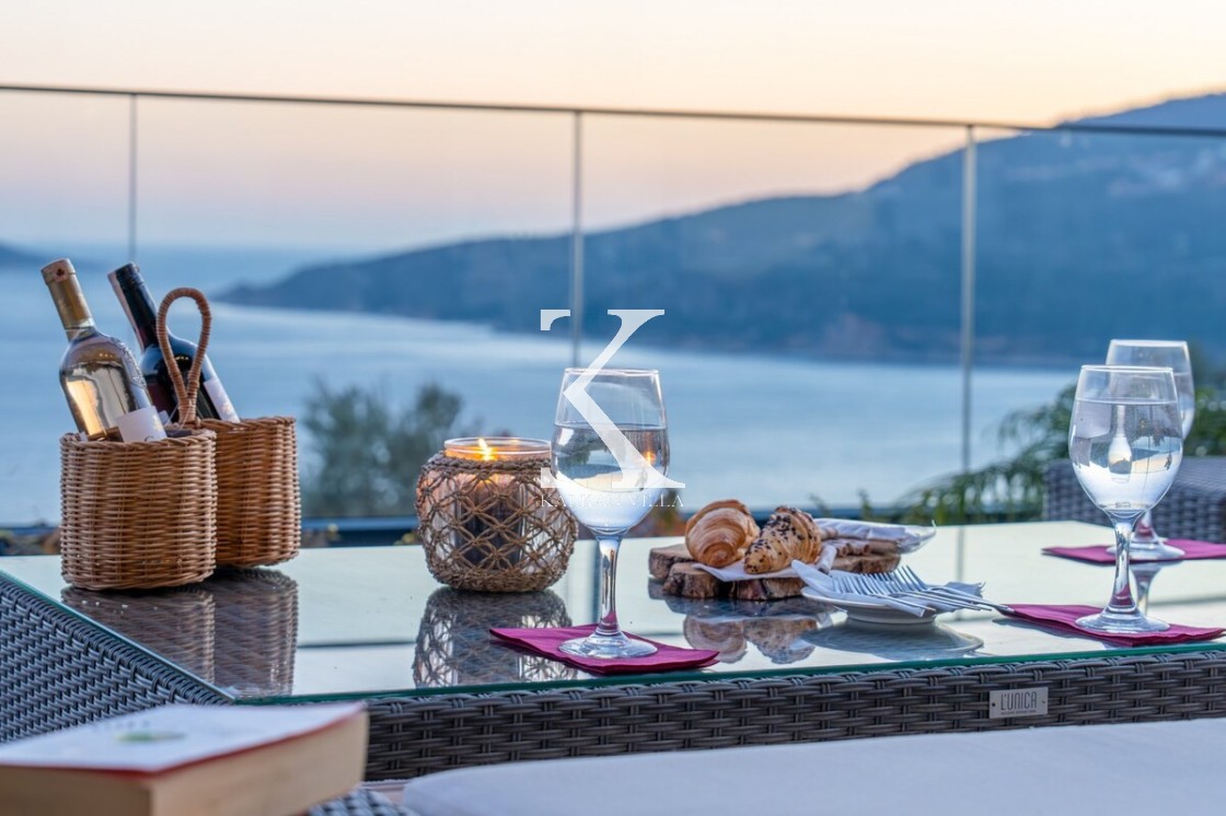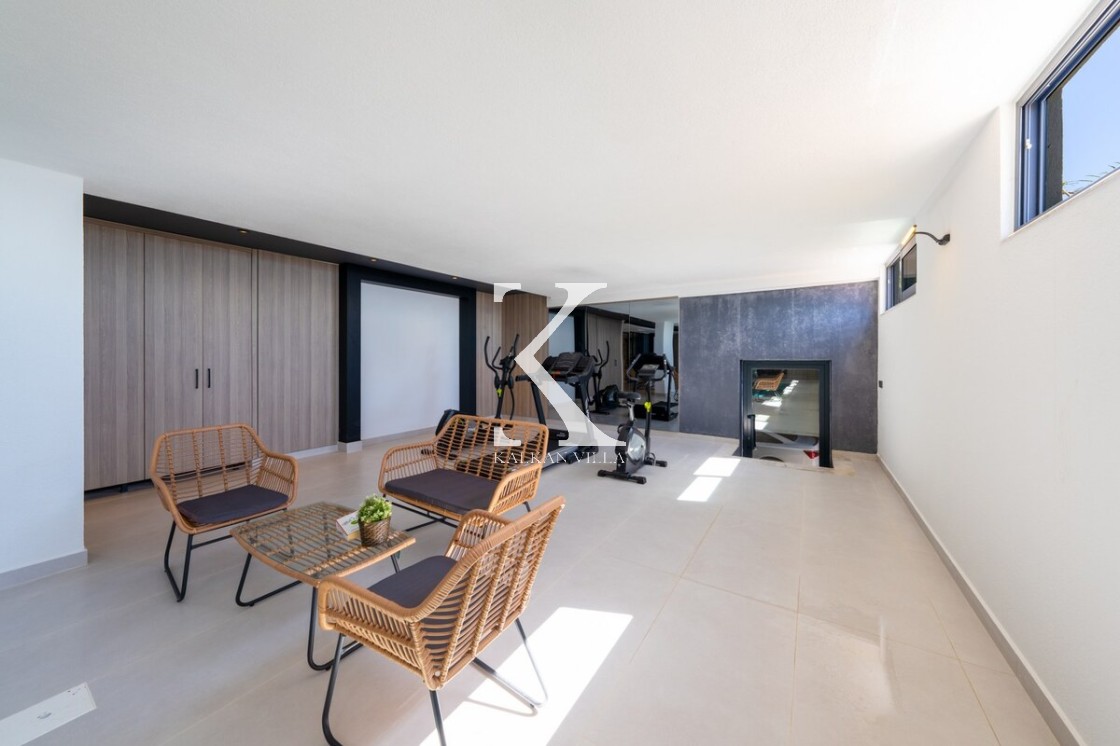 Deniz manzaralı, modern ve konforlu oturma grubu, TV ve klima.