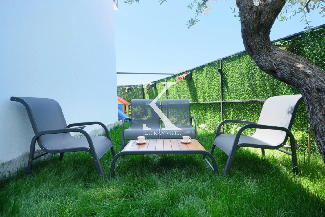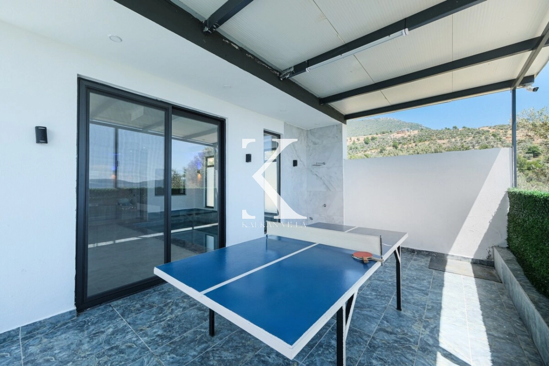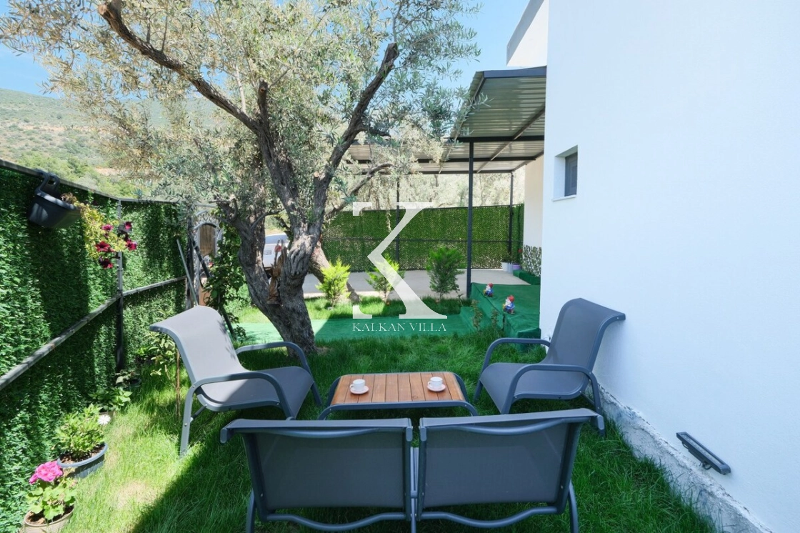 Panoramik doğa manzarasına sahip geniş bahçesinde özel yüzme havuzu, çocuk havuzu, şezlonglar, oturma grubu, yemek alanı ve barbekü bulunmaktadır.