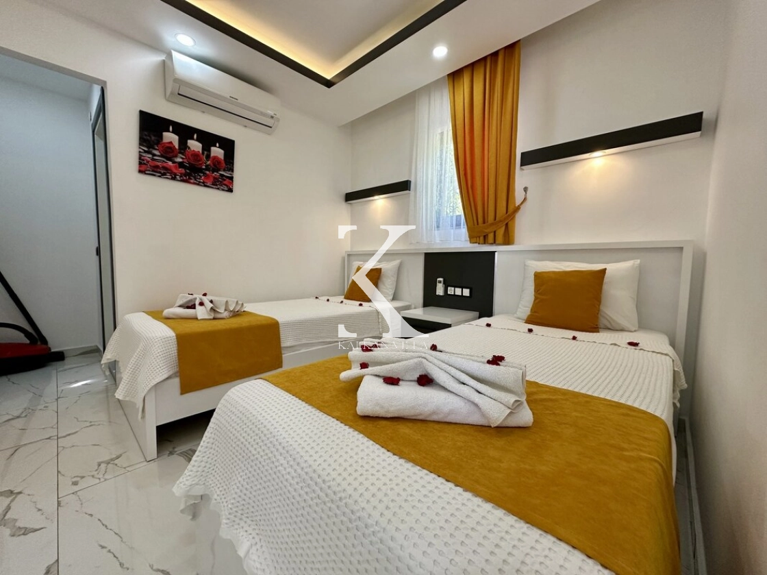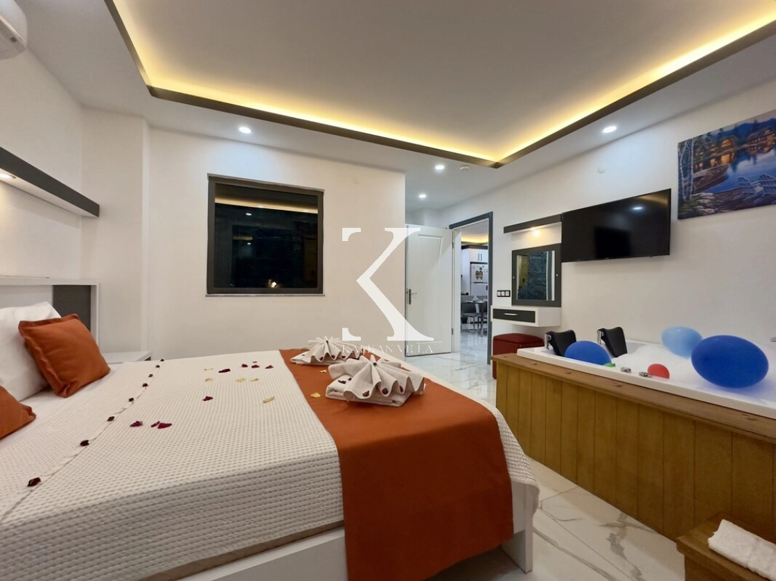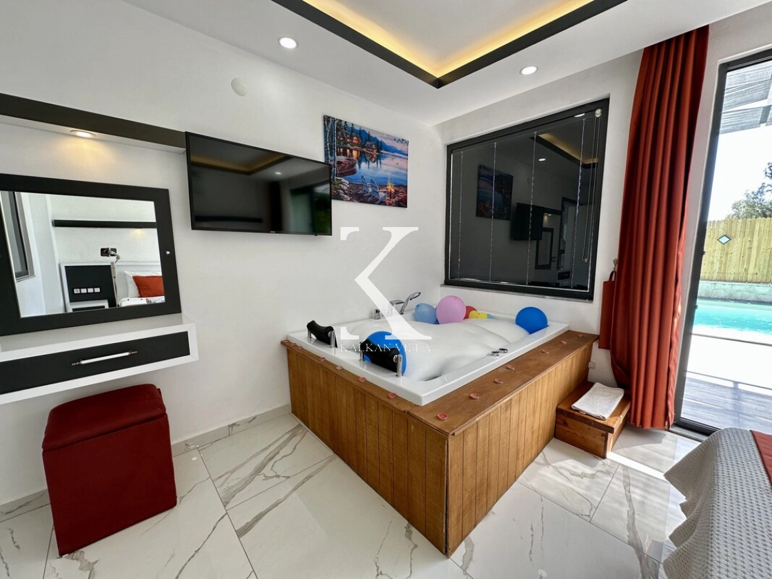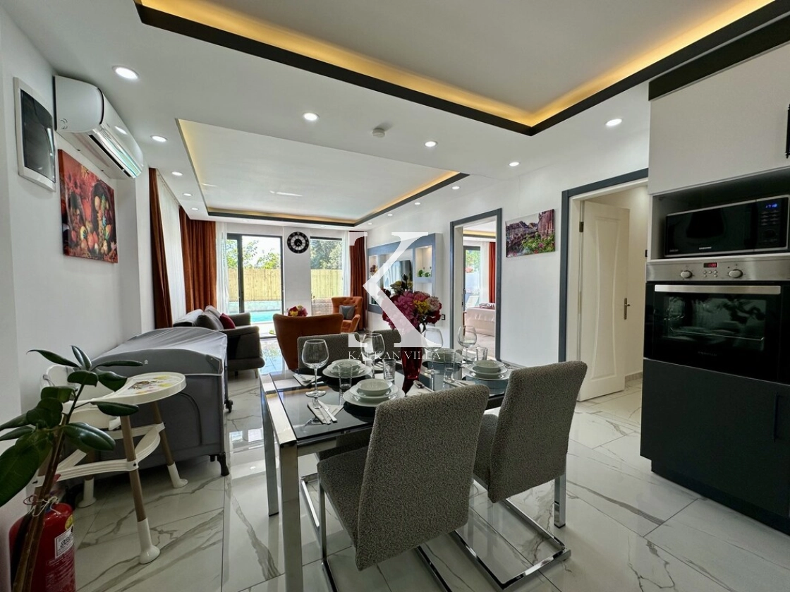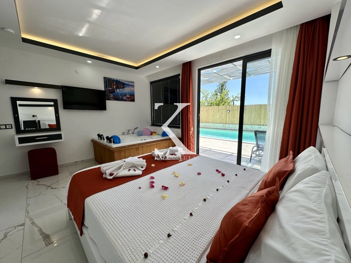 Toplam 4 kişilik konaklama kapasitesine sahip villada 2 yatak odası ve 2 banyo bulunmaktadır. Modern detaylarla dekore edilmiş iç mekânda yer alan jakuzi, tatilinize hem romantizm hem de ekstra konfor katmaktadır.