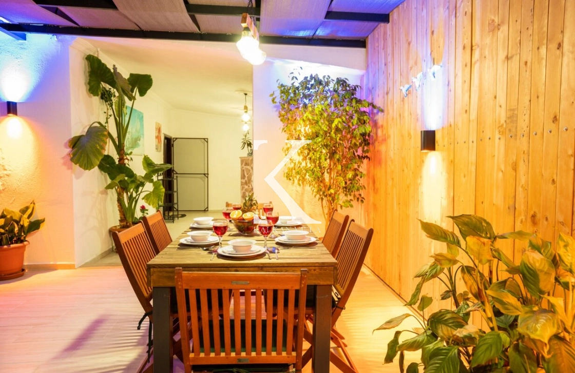 Villanın özel bahçesinde; korunaklı yüzme havuzu, salıncak, bahçe oturma grubu ve yemek masası bulunmaktadır. Mahremiyetin ön planda tutulduğu bu alanda, sevdiklerinizle birlikte huzurlu ve keyifli vakit geçirebilirsiniz.