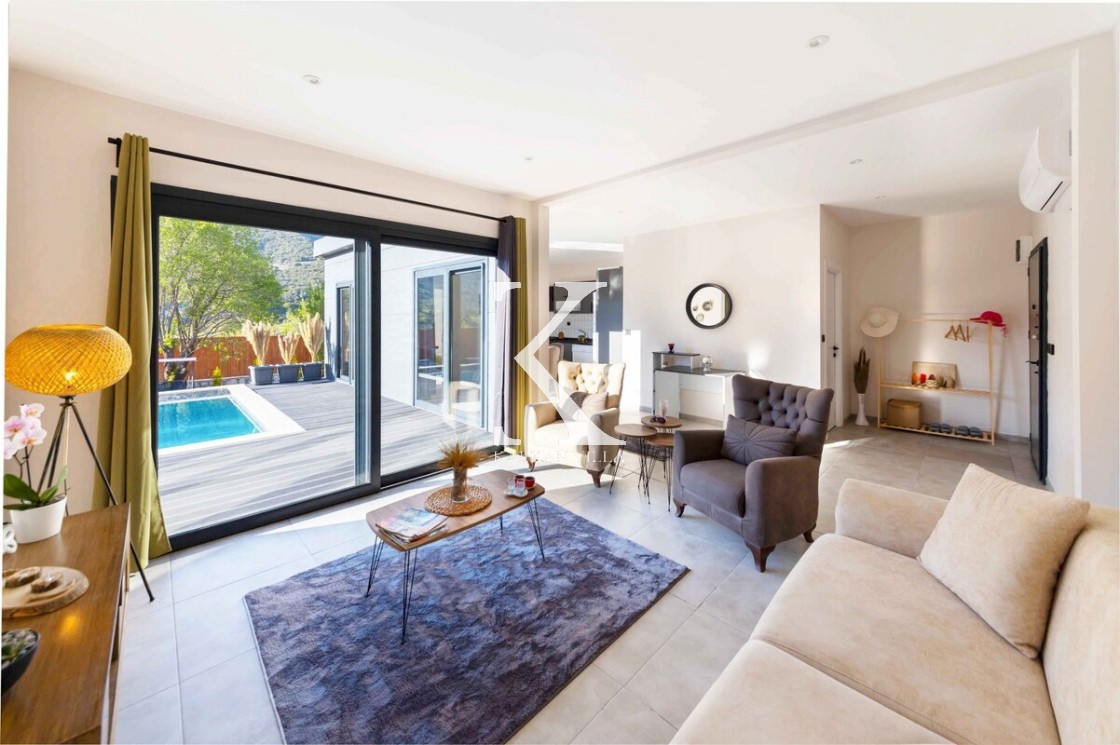 Modern & ferah: konforlu oturma grubu, TV, DVD oynatıcı, klima, internet; havuz terasına direkt çıkış.
