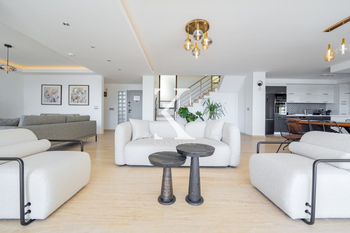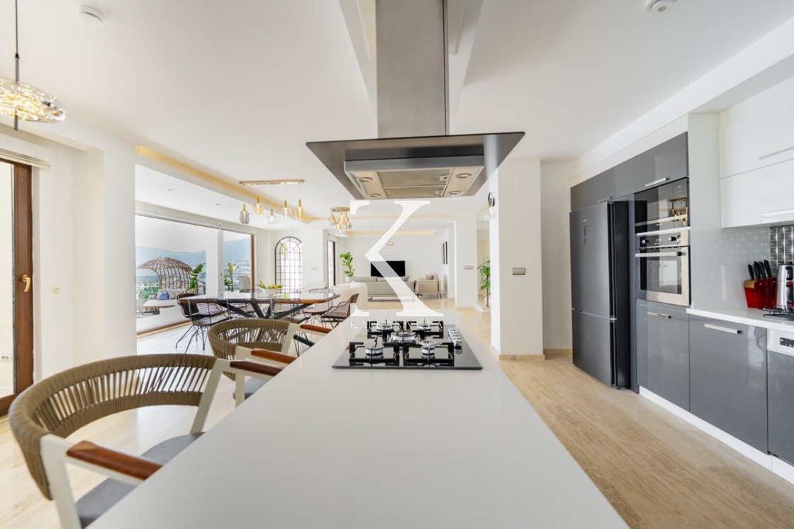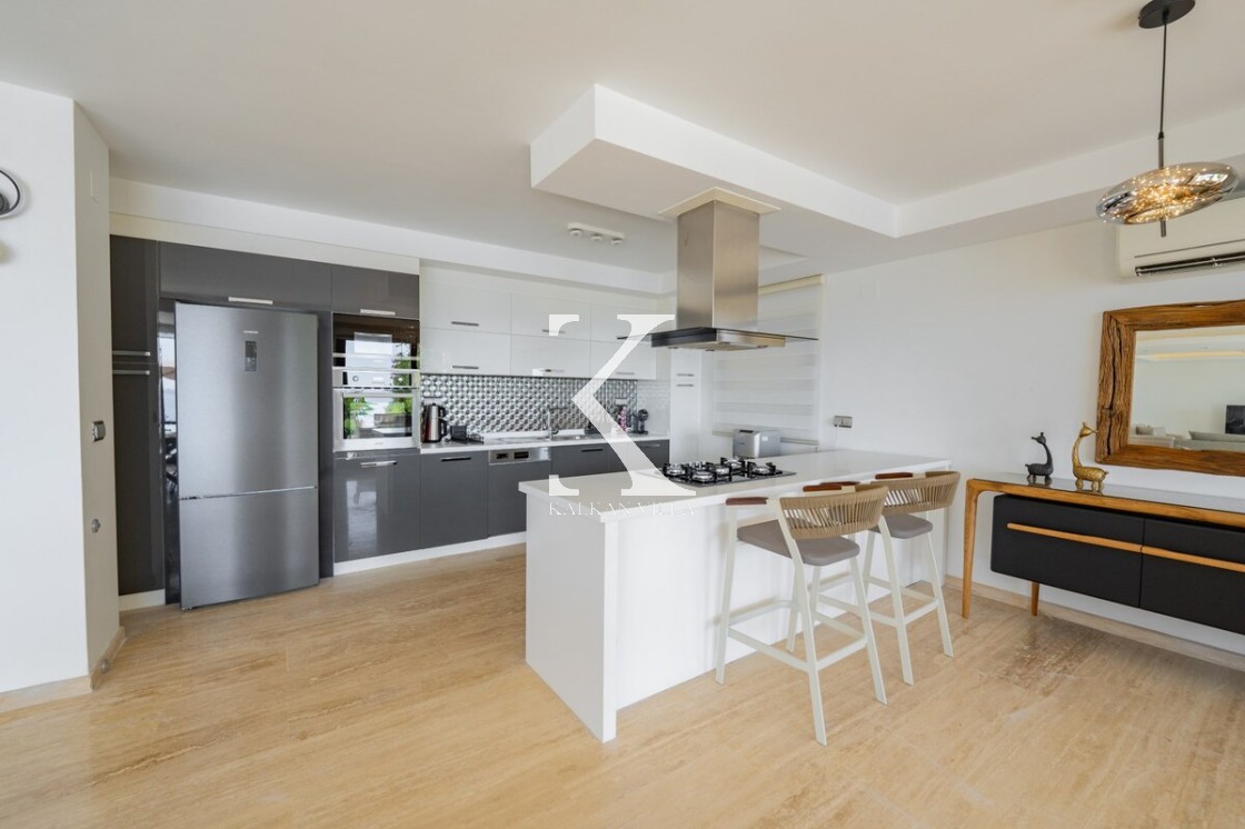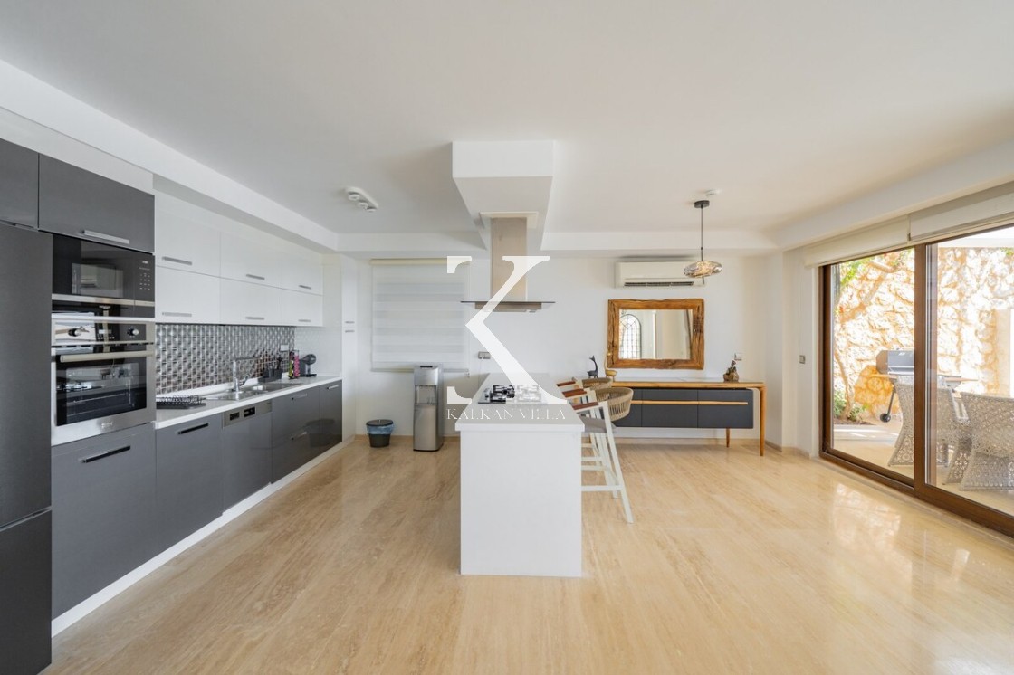 Modern, tam donanımlı mutfak ve yüksek tavanlı salon
