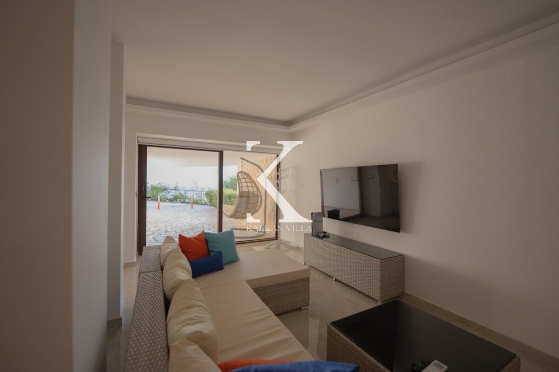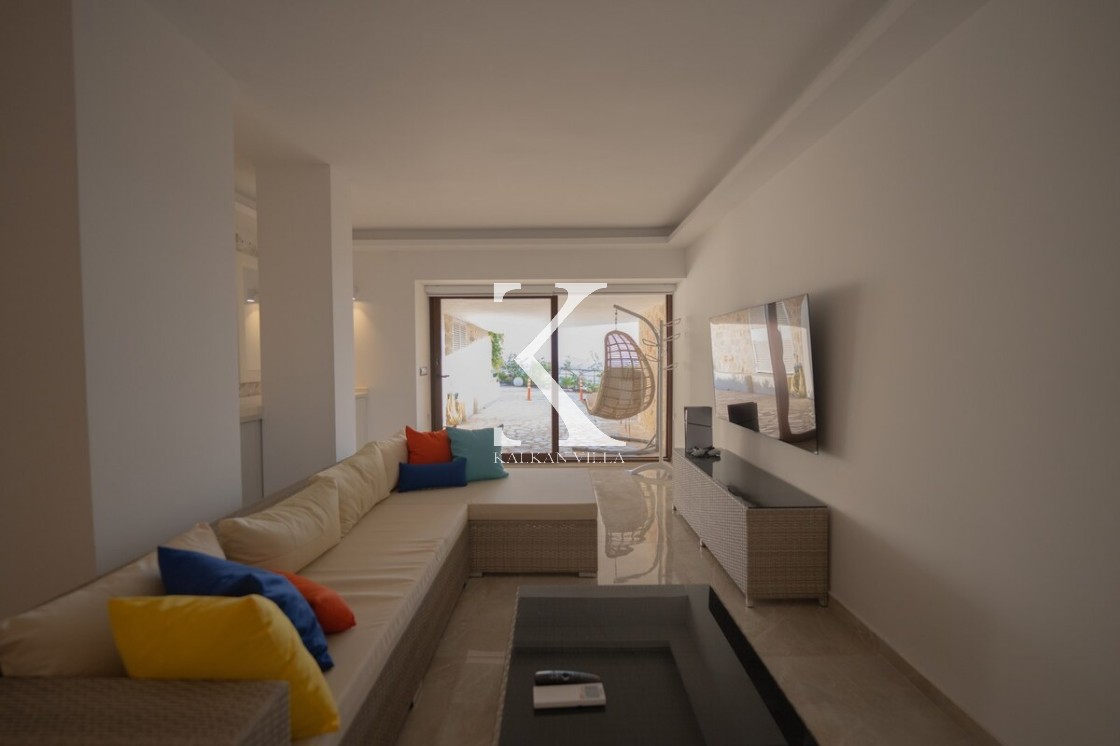 Salon: Yüksek tavan, deniz & doğa manzarası; konforlu oturma grubu, TV, TV ünitesi, DVD oynatıcı, uydu alıcısı, klima. Havuz terasına direkt çıkış.