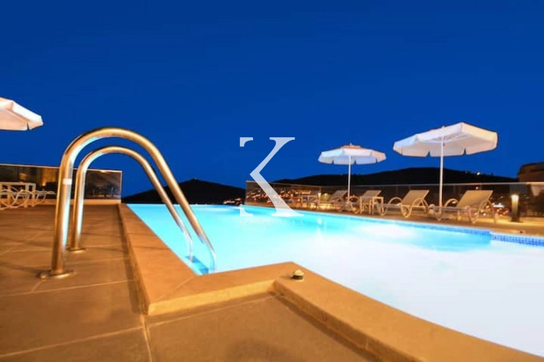 Deniz manzaralı terasta konumlanan özel havuz, gün boyunca hem serinlemek hem de manzaranın tadını çıkarmak için mükemmel.