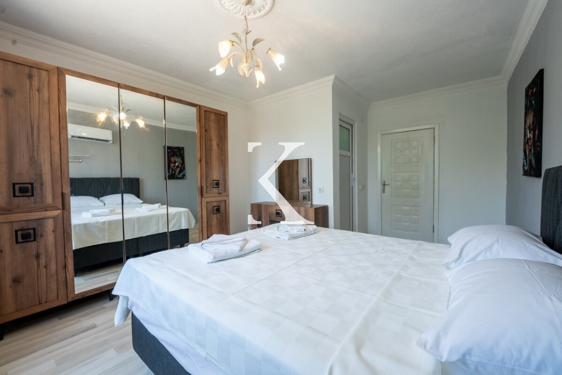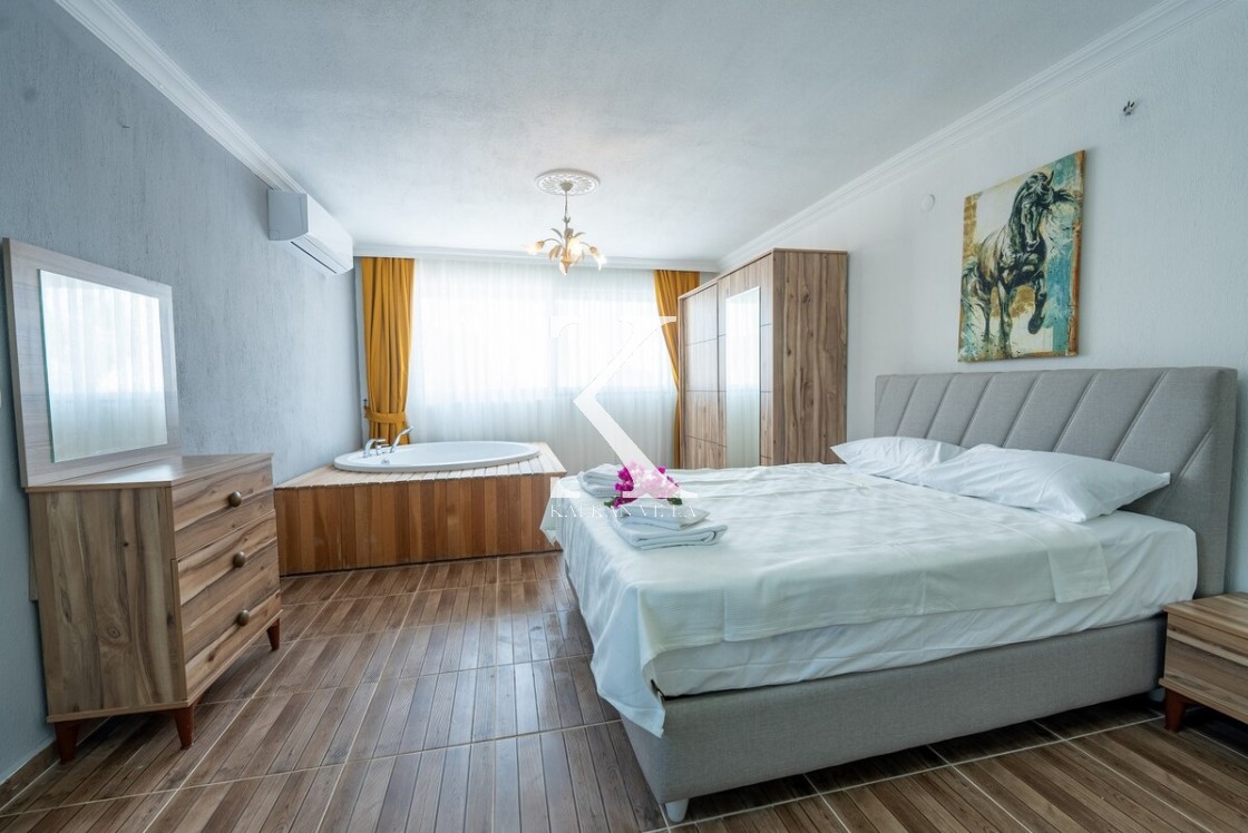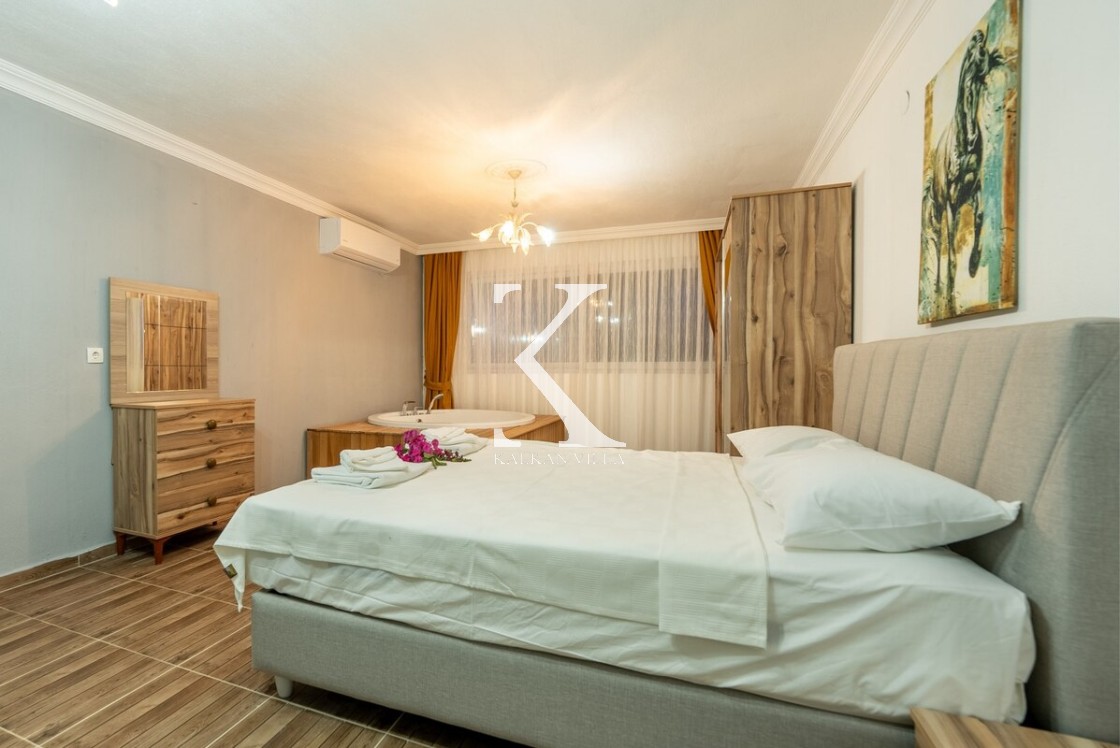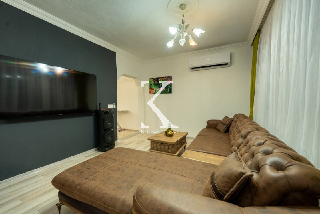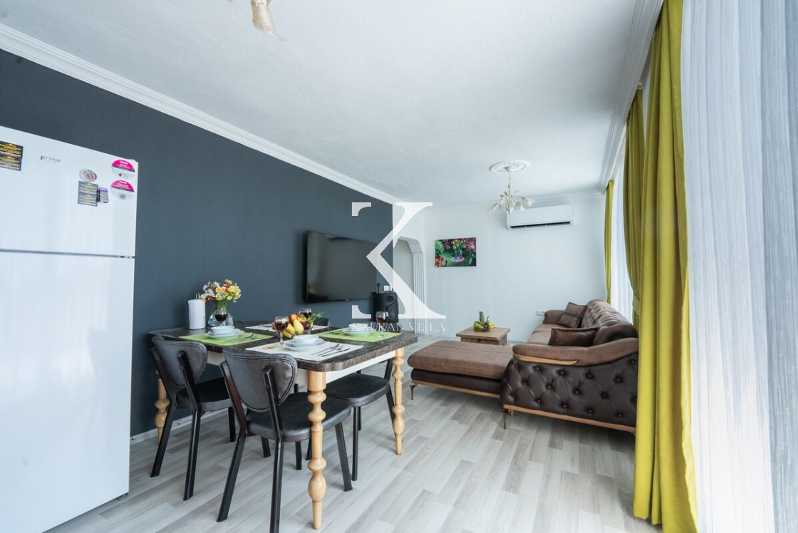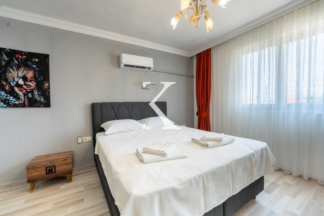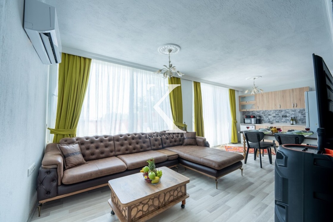 Modern ve ferah; konforlu oturma grubu, TV, DVD, klima, internet. Havuz terasına direkt çıkış.