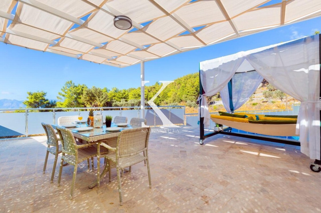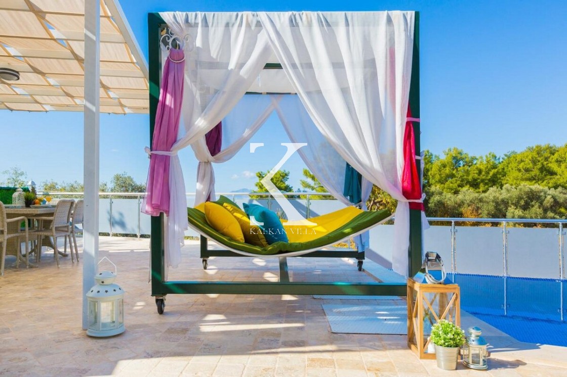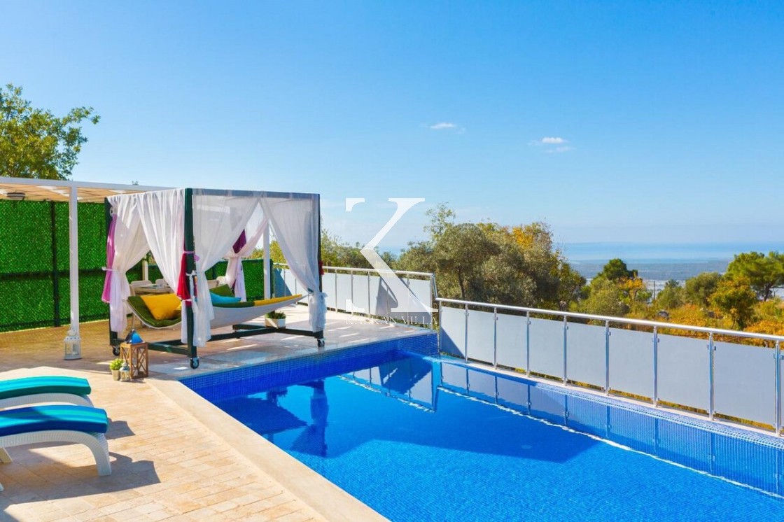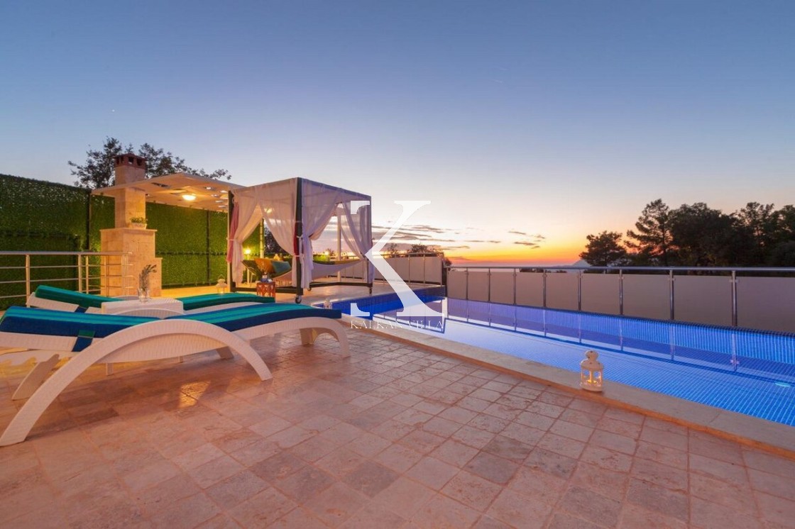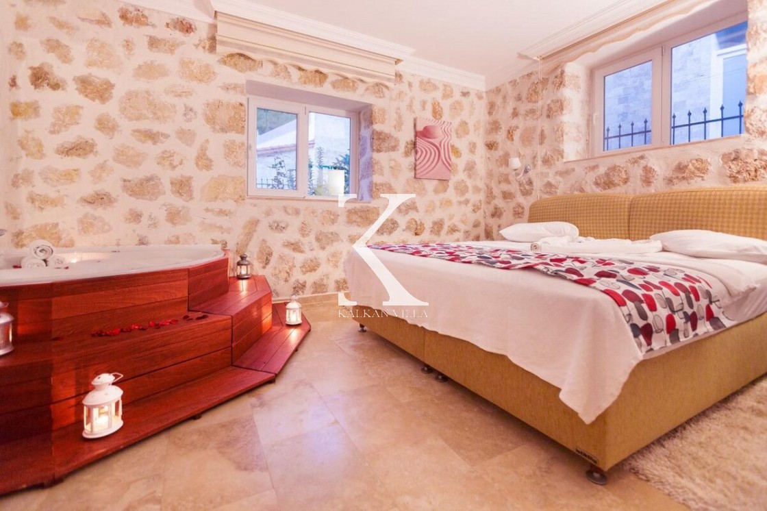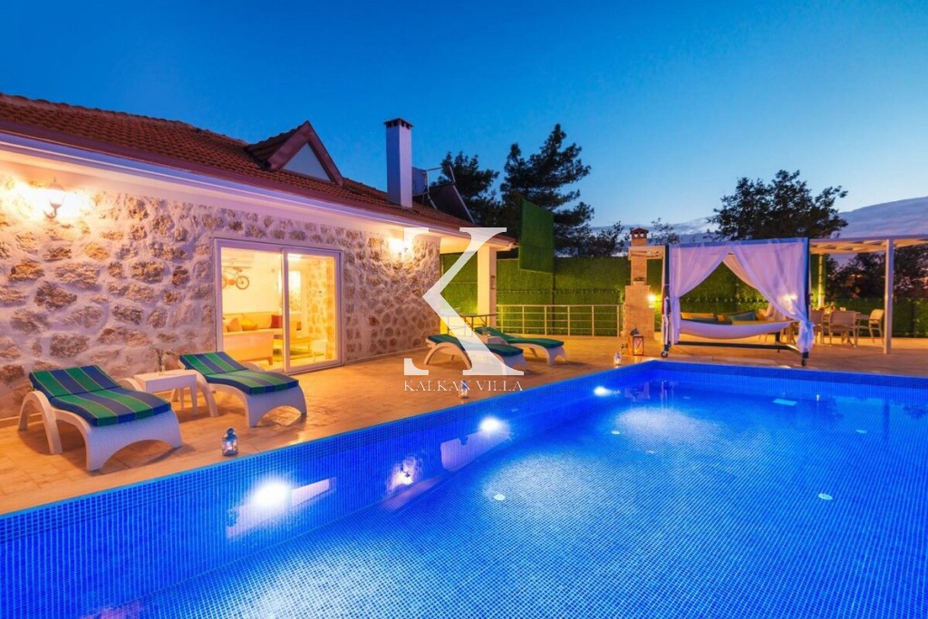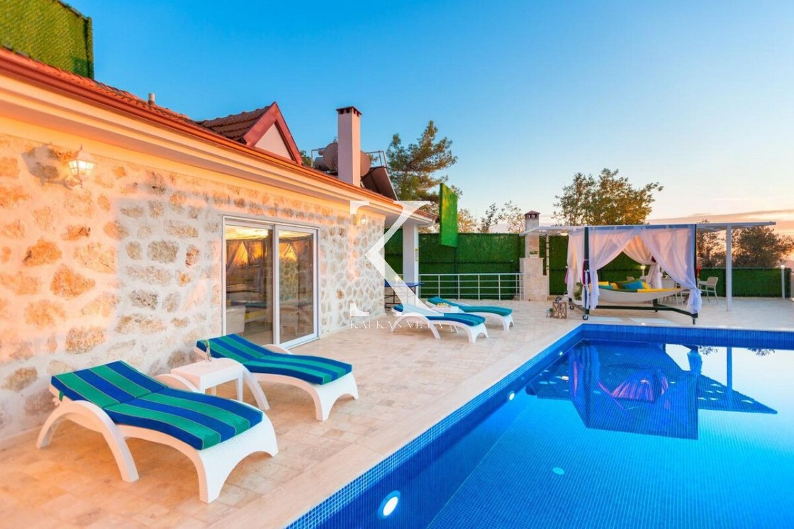Doğa & deniz manzaralı, taş mimarili 2 yatak odalı – 4 kişilik modern villa. Geniş bahçede özel havuz, şezlonglar, oturma köşesi, yemek masası ve barbekü alanı; yatak odalarından birinde jakuzi.