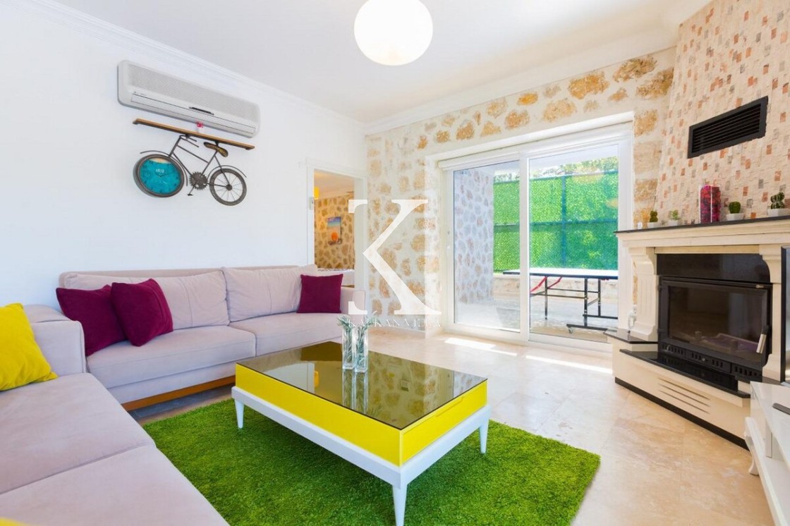 Aydınlık & keyifli: konforlu oturma grubu, şömine, TV, TV ünitesi, DVD, uydu alıcısı, klima, internet; havuz terasına direkt çıkış.