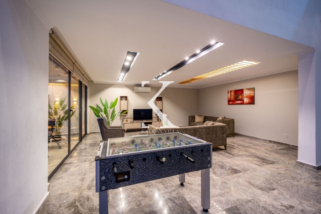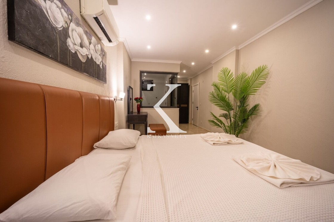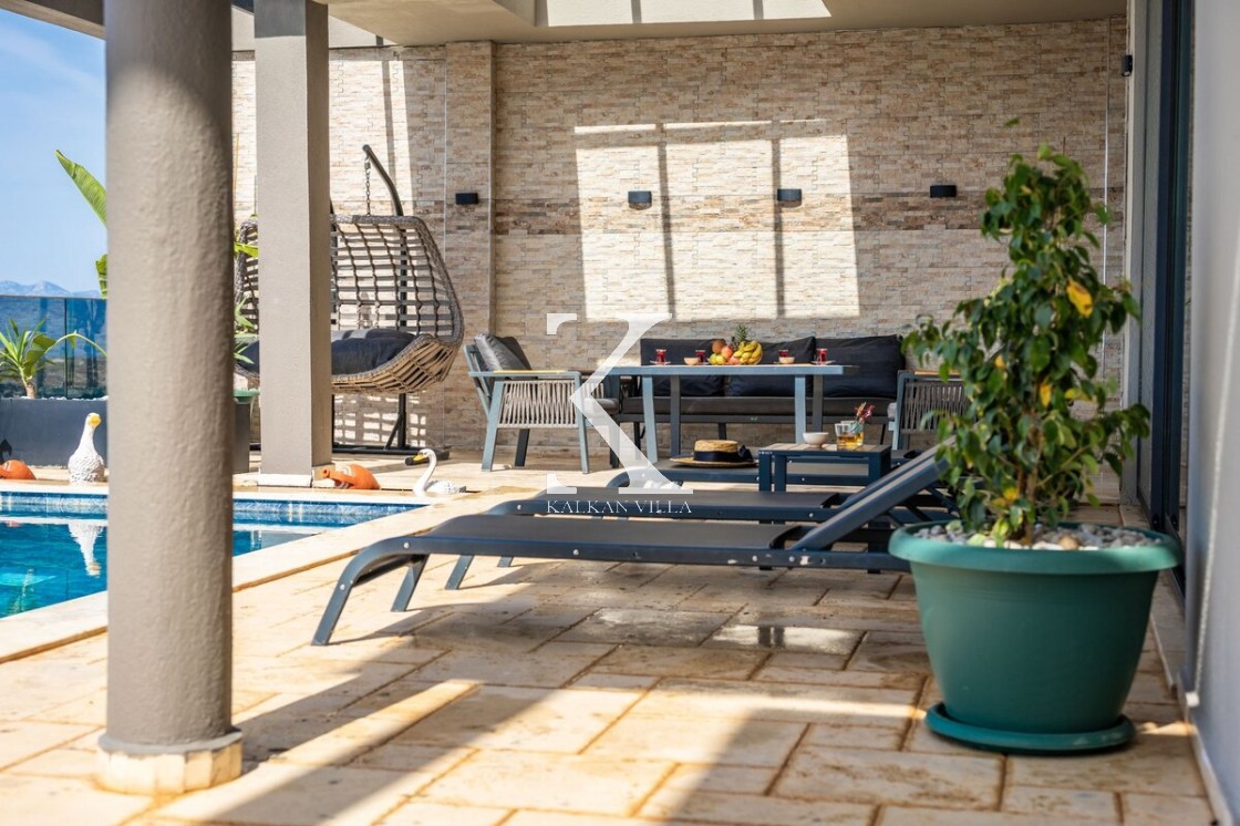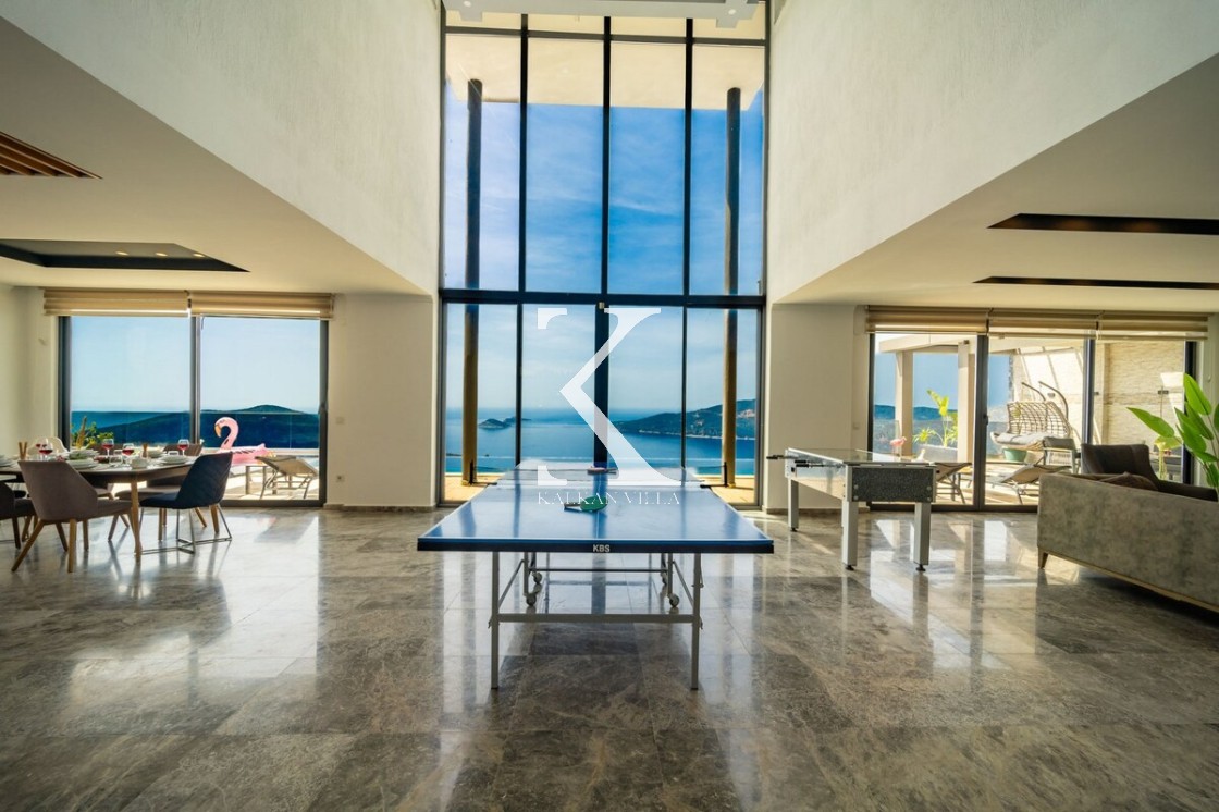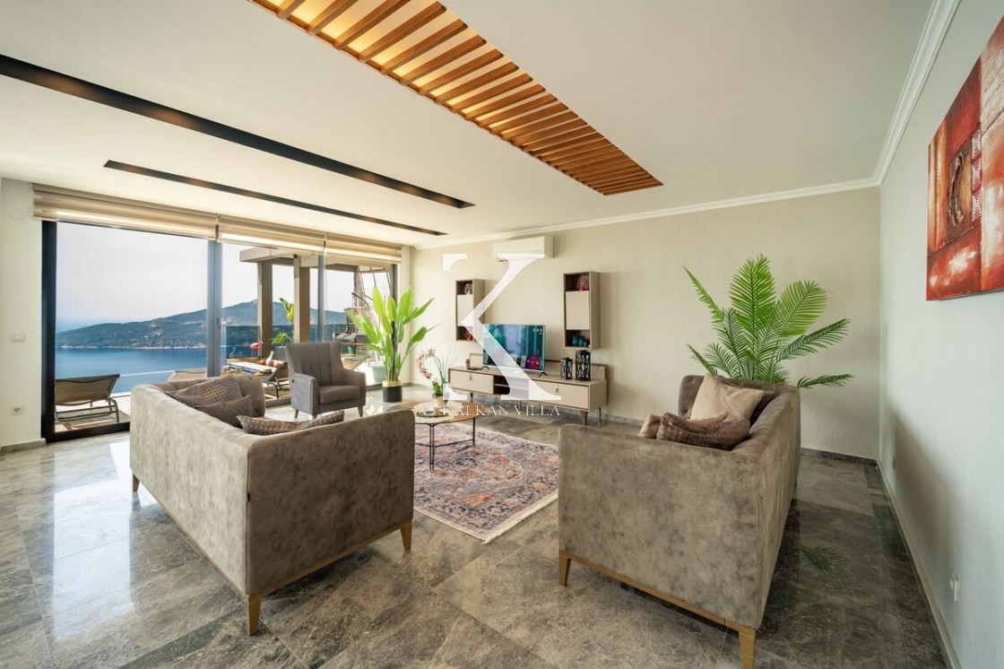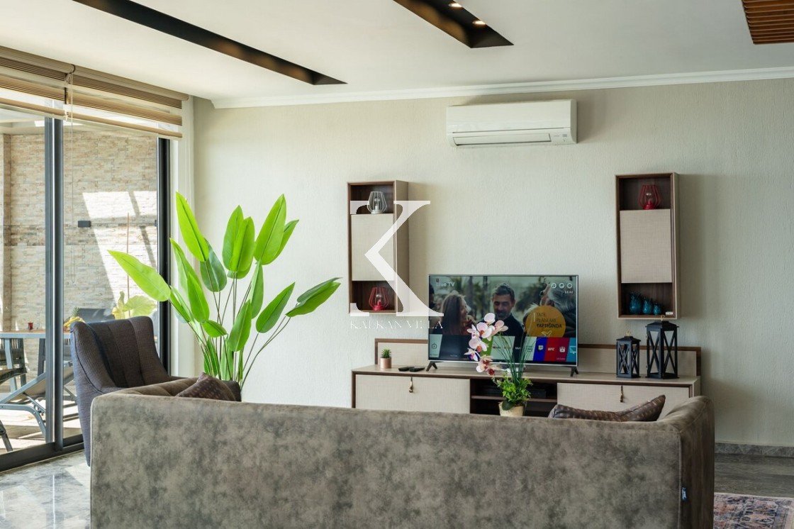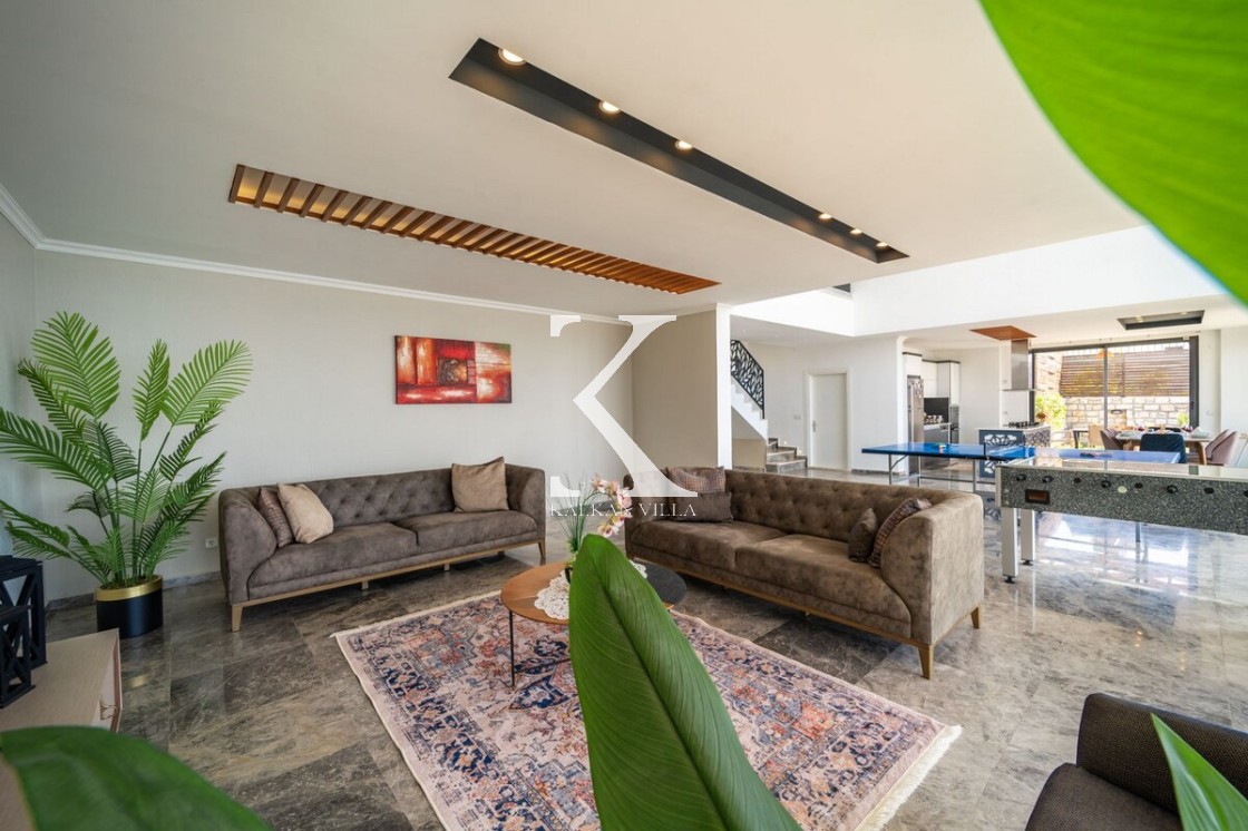 Panoramik manzaralı aydınlık salon; konforlu oturma grubu, TV, DVD oynatıcı, uydu alıcısı, klima. Havuz terasına direkt çıkış.