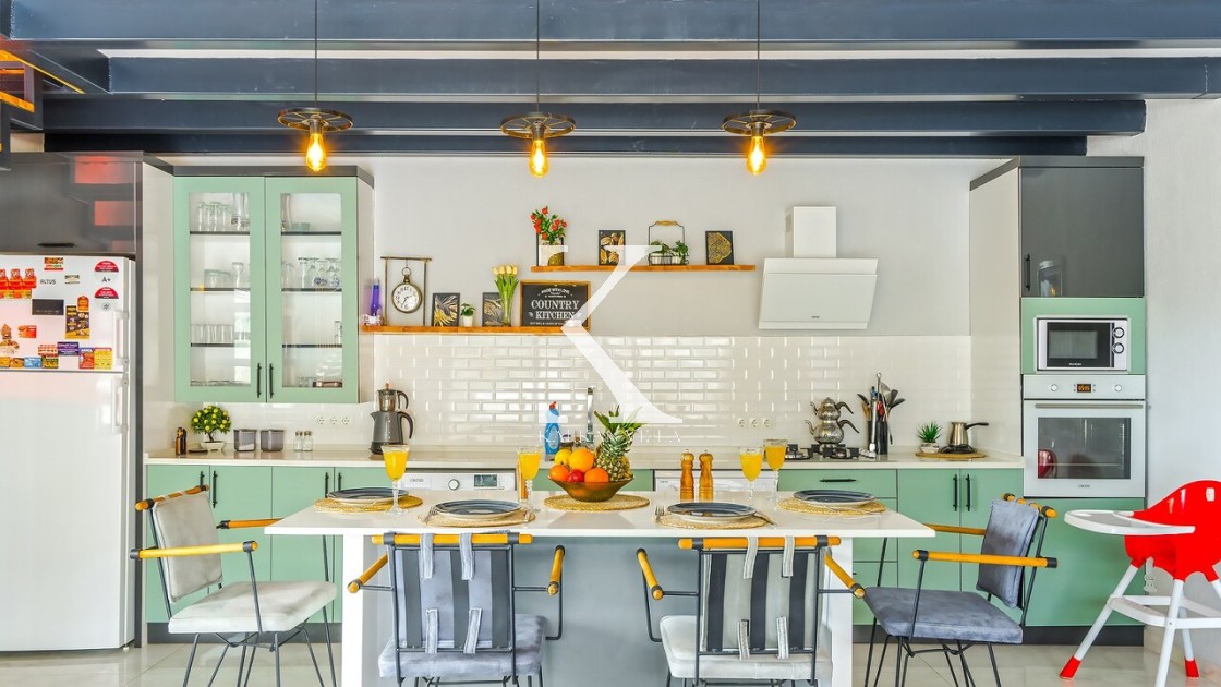 Modern çizgilere sahip Amerikan mutfakta ihtiyacınız olan tüm ekipmanlar elinizin altındadır. Buzdolabı, bulaşık makinesi, ocak, fırın, yemek takımları ve temel mutfak araç gereçleri bulunmaktadır.