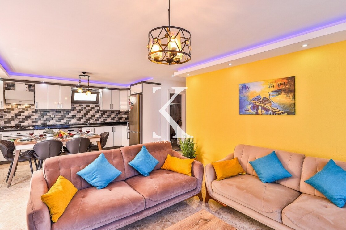 Modern ve zarif bir şekilde dekore edilmiş salon, tatiliniz boyunca hem dinlenmek hem de keyifli vakit geçirmek için idealdir.