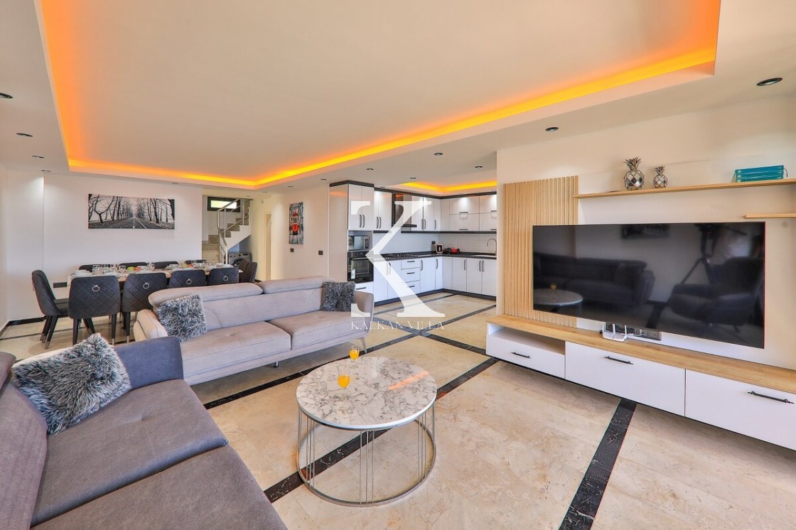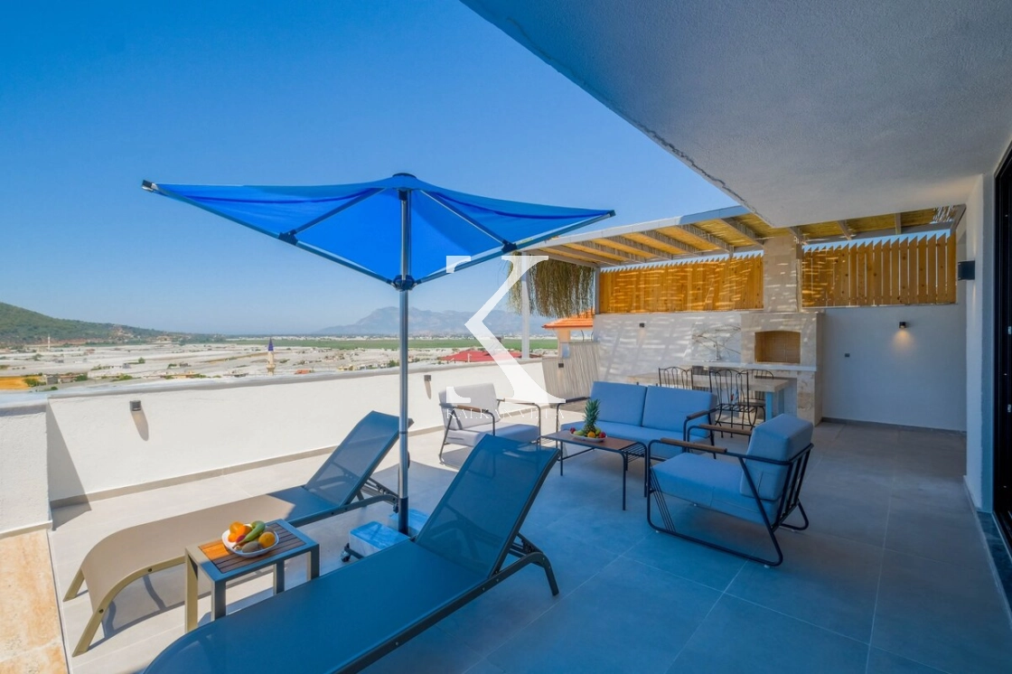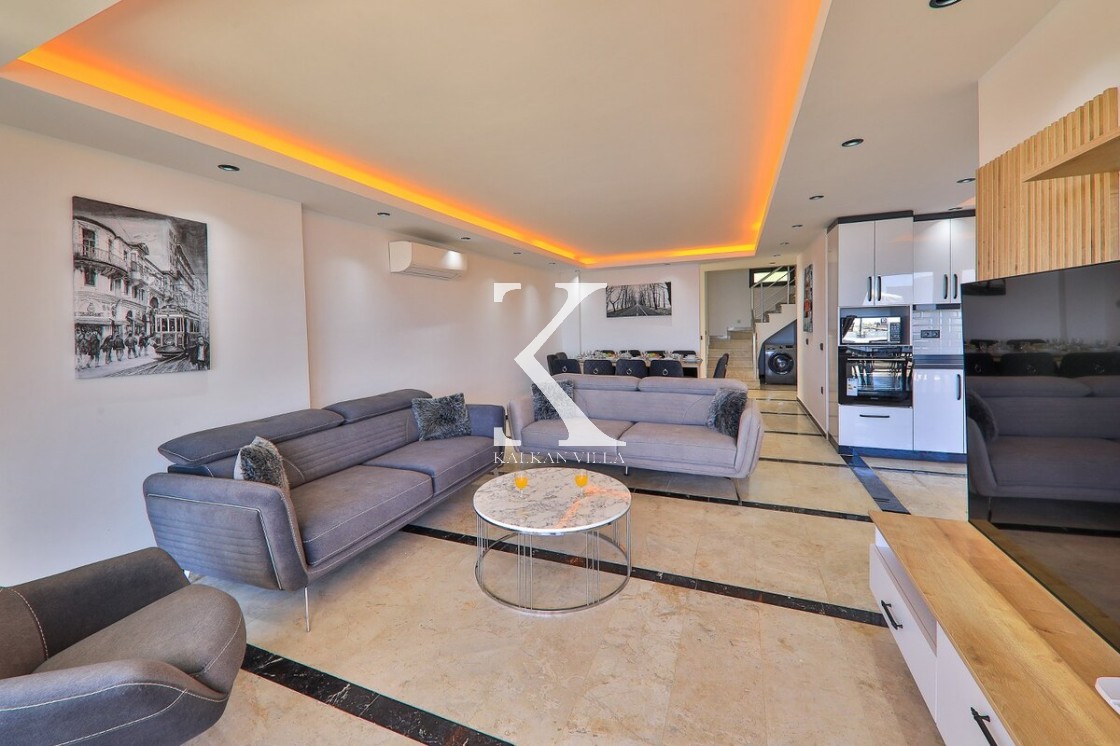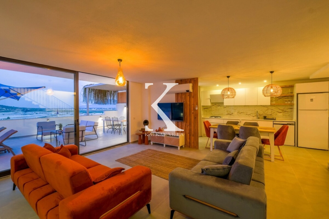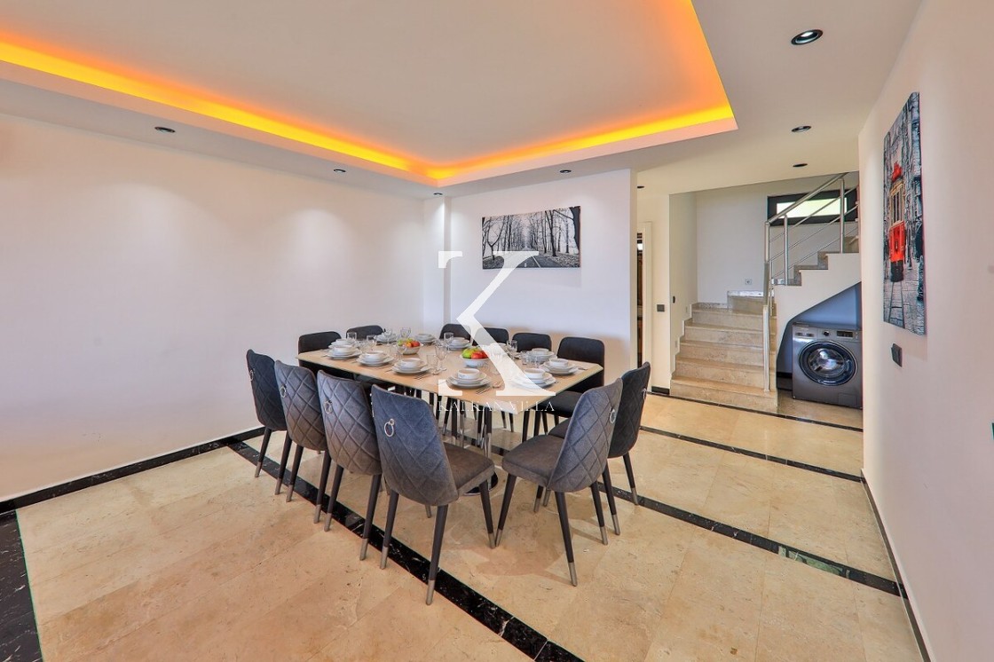 Salon: Modern tasarımlı oturma grubu, TV, DVD oynatıcı, klima, internet, havuz terasına geçiş.