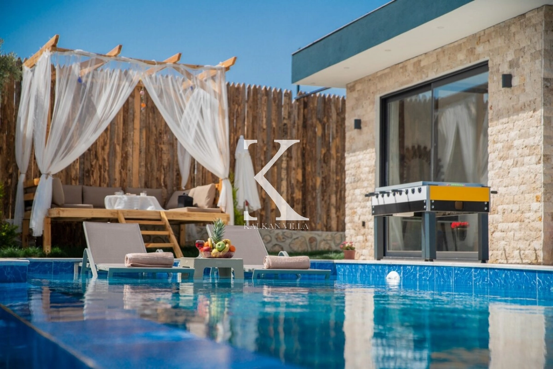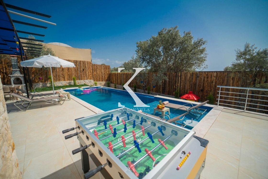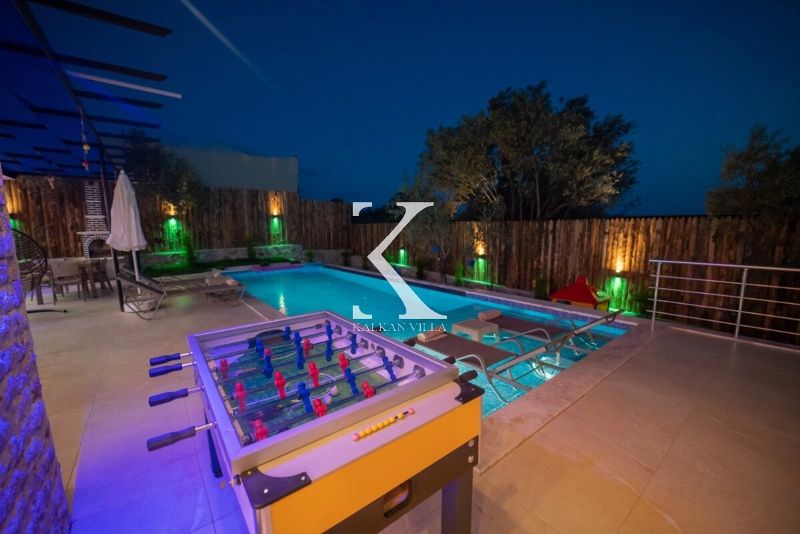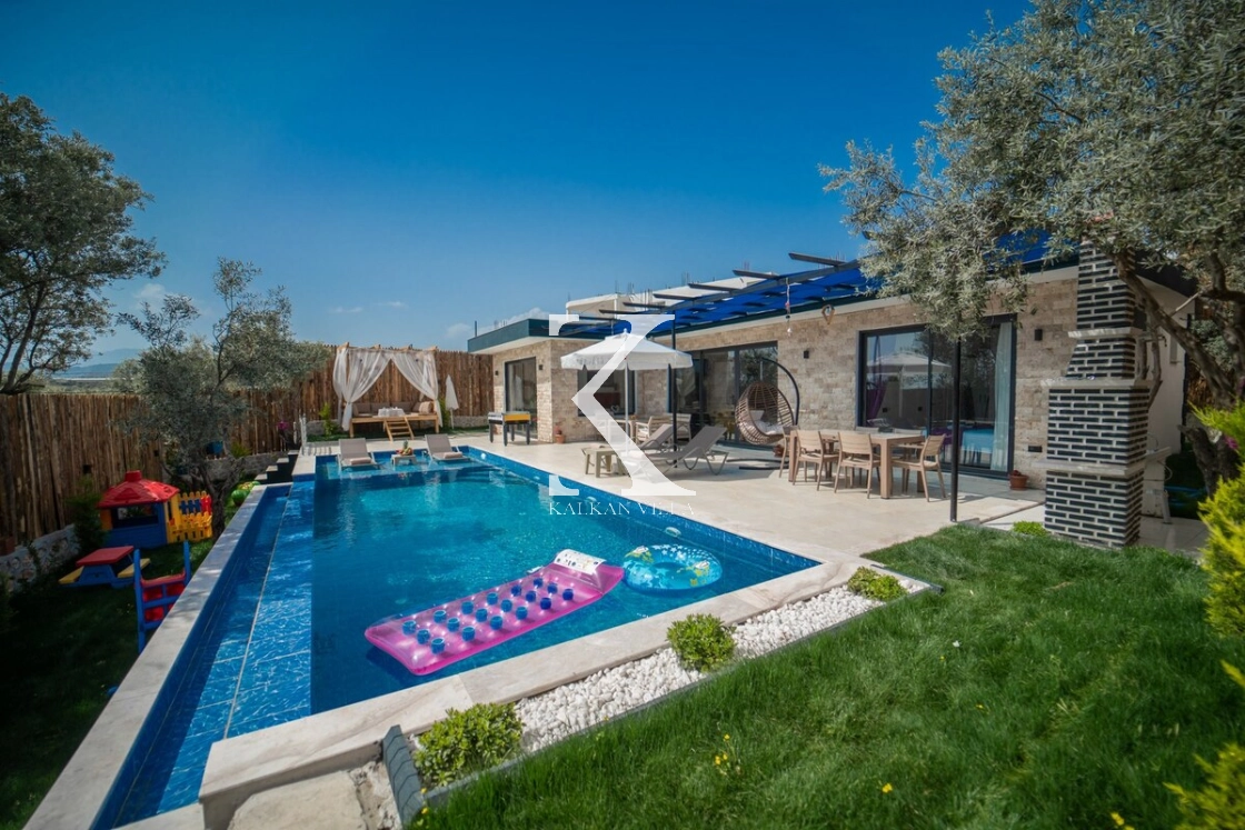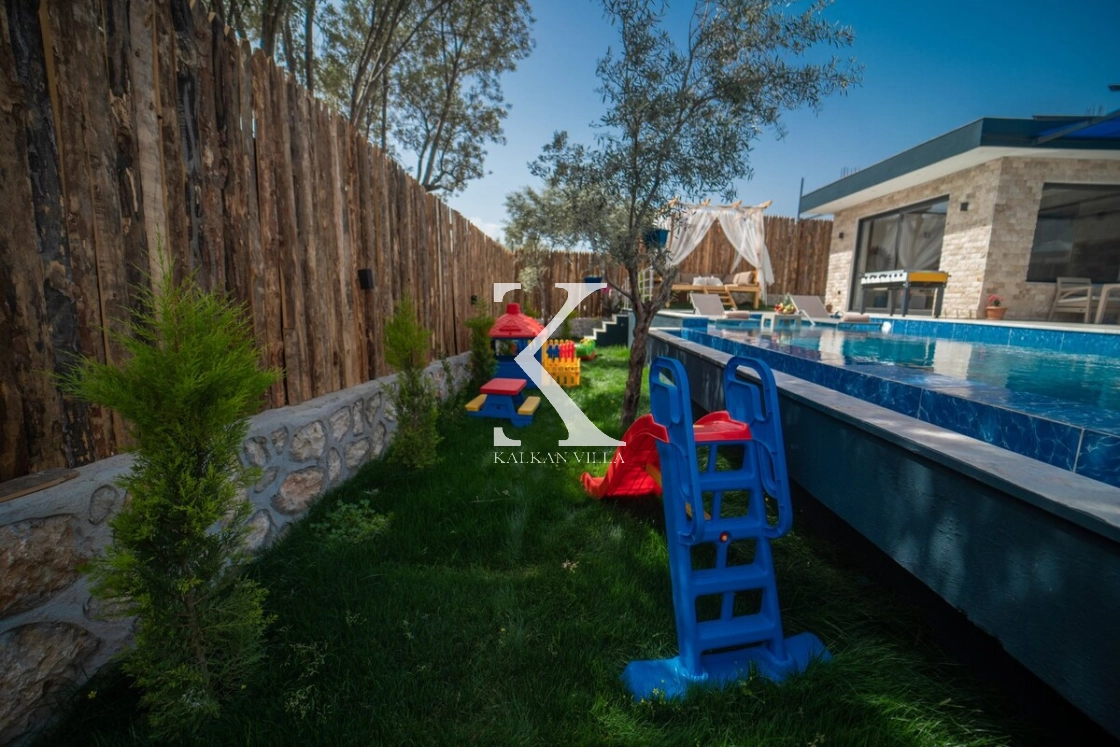 Villanın bahçesinde köşk, çocuk oyun alanı, langırt ve dinlenme köşeleri yer almakta olup; havuz terası ve çevresi tamamen çitlerle korunaklıdır. Mahremiyete önem veren misafirler için güvenle tercih edilebilir.