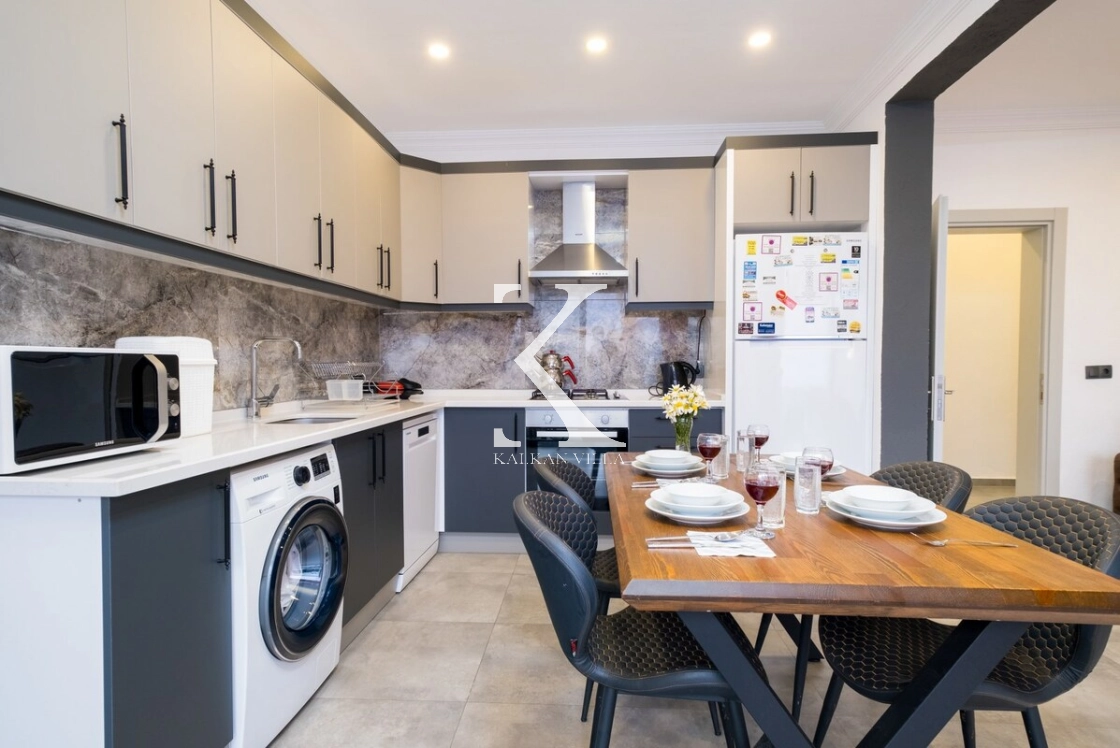 Amerikan tarzı mutfak içerisinde; buzdolabı, bulaşık makinesi, ocak, fırın, mikrodalga fırın, elektrikli su ısıtıcısı, tost makinesi, yemek masası, yemek takımları ve yemek pişirme araç gereçleri yer almaktadır.