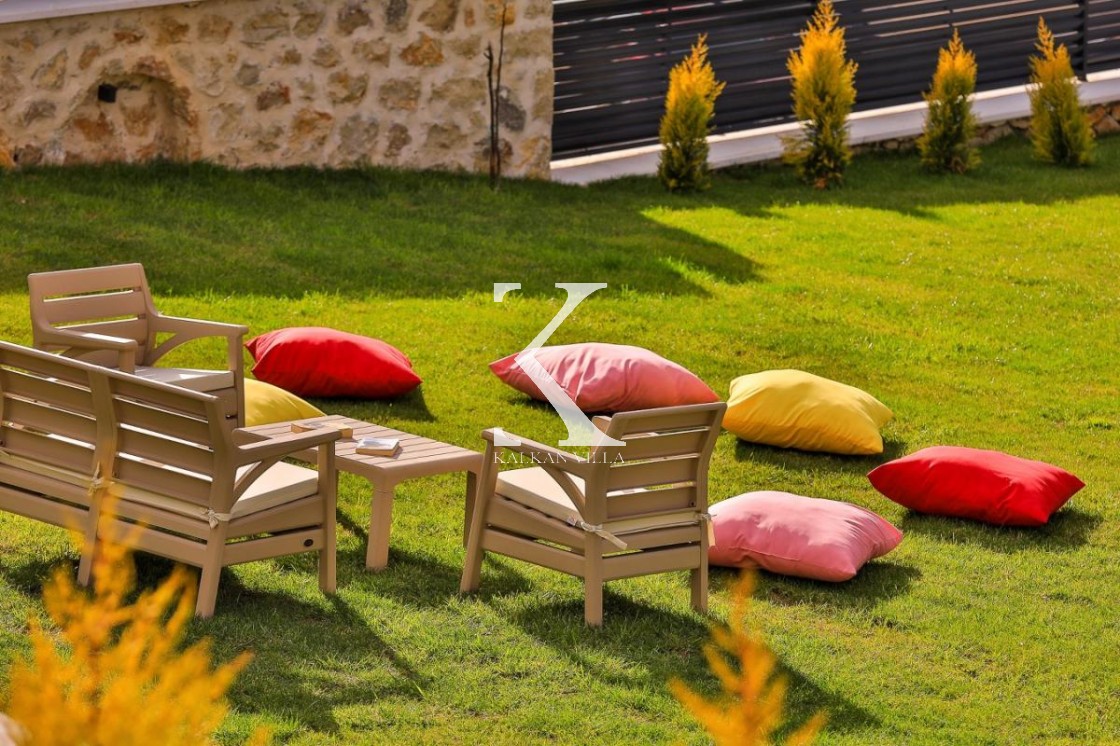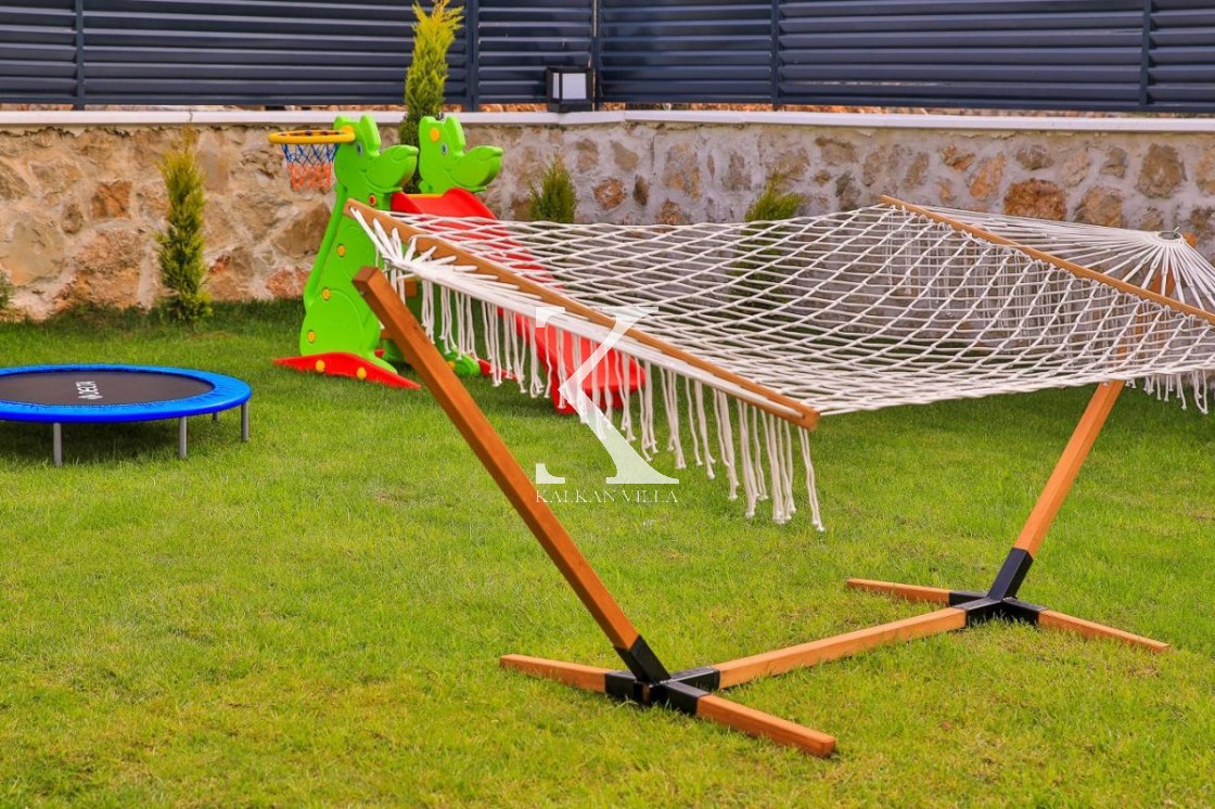 Geniş bahçede: salıncak, hamak, masa tenisi, langırt, çocuk oyun alanı, BBQ ve açık yemek alanı
